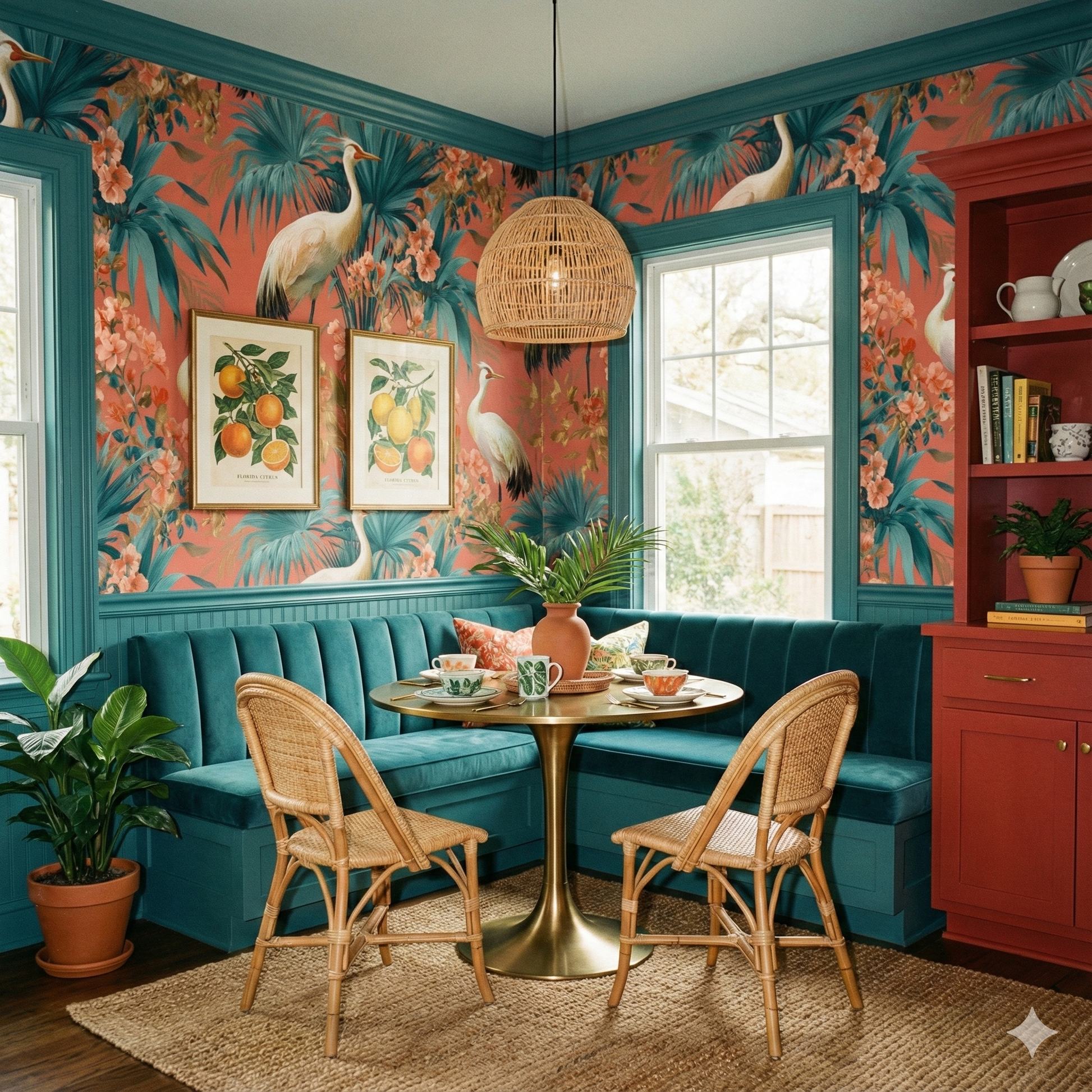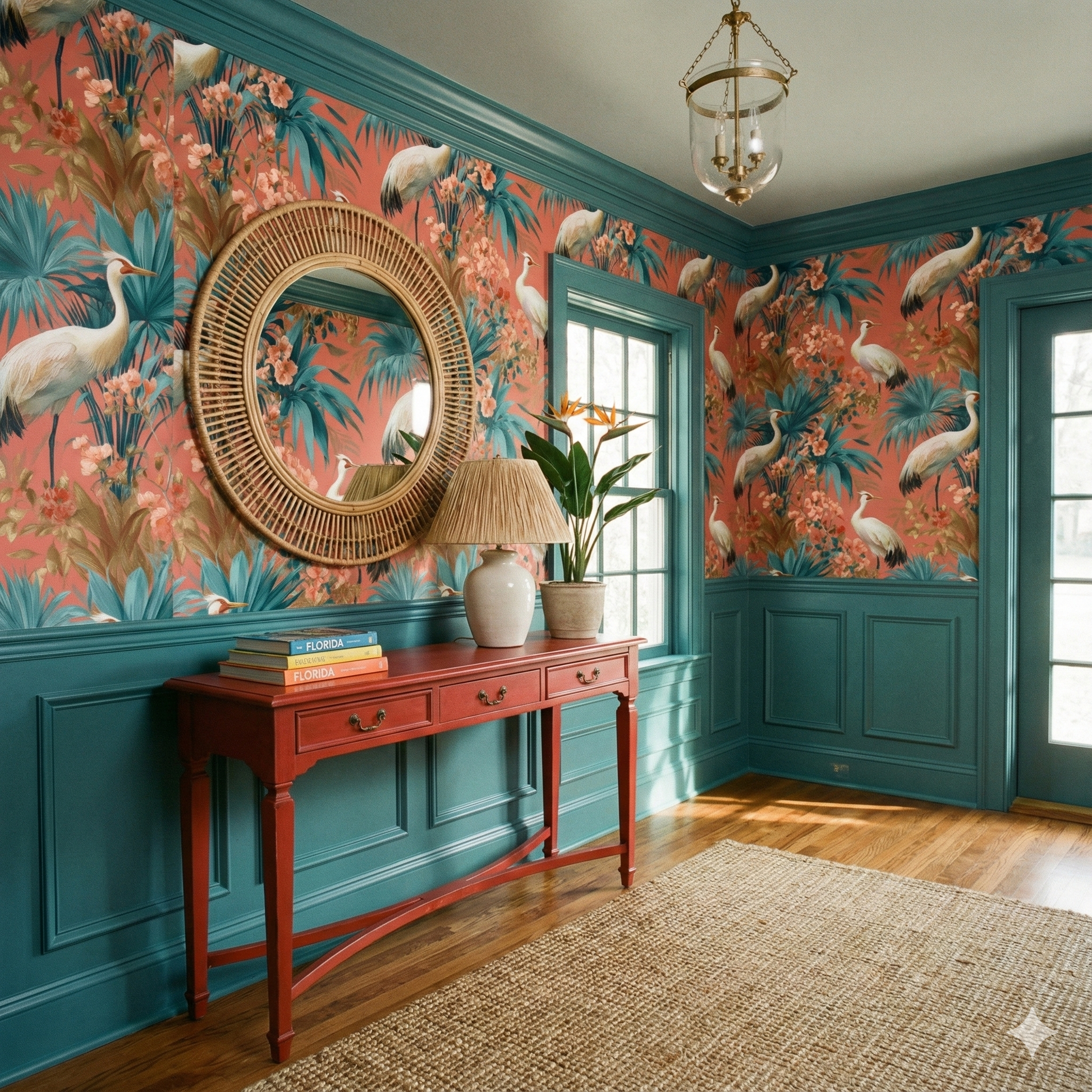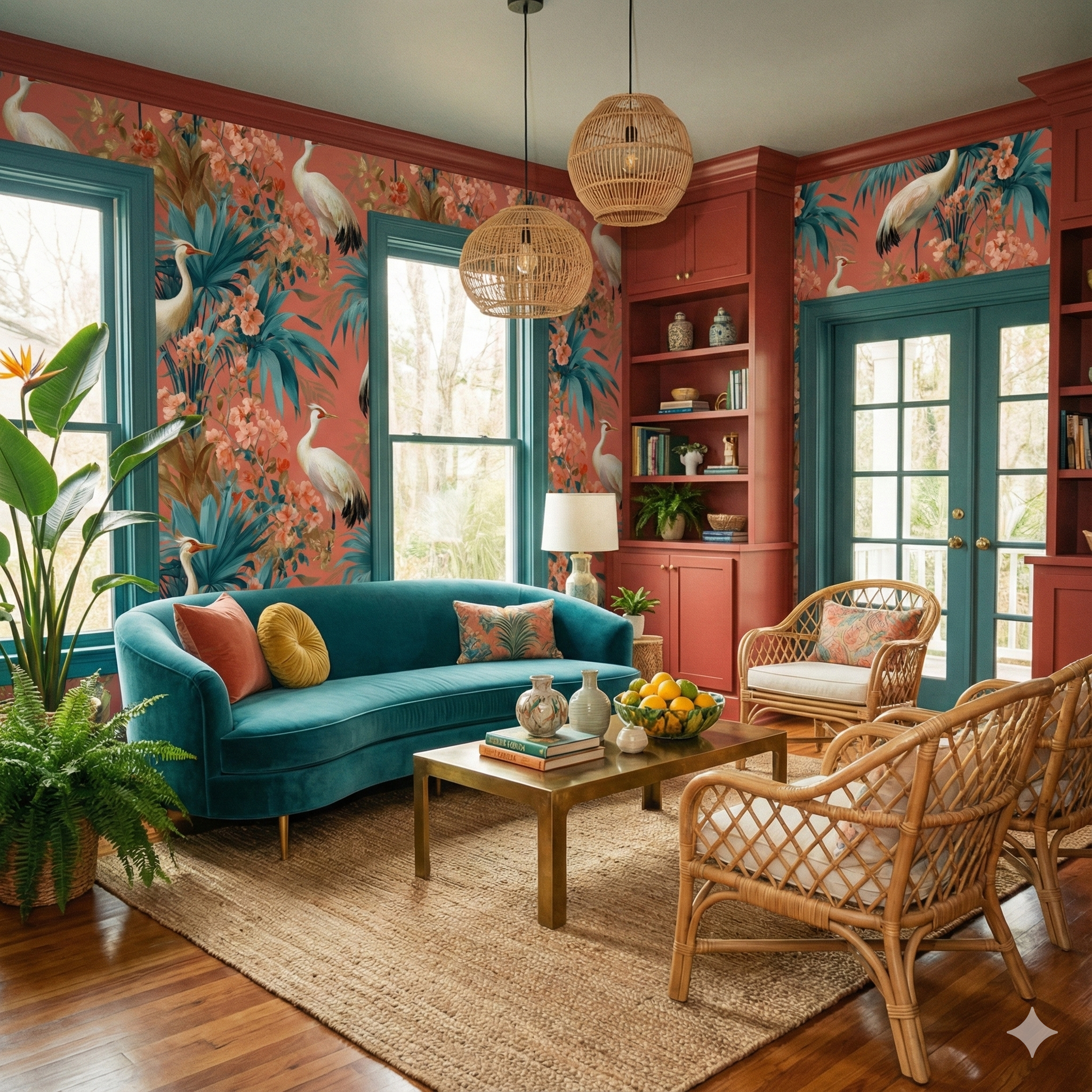 A warm coral ground anchors this tropical yet sophisticated scene. Elegant white birds stand among teal palm fronds, peach blossoms, and gold-tinged foliage, creating a lush interplay of warm and cool tones. The pattern feels like a vintage travel poster merged with fine art illustration—romantic, worldly, and sun-kissed. It works beautifully in powder rooms, vacation properties, garden rooms, and eclectic bedrooms. Even with its exotic energy, it maintains a polished, upscale feel thanks to the restrained palette and detailed linework. The composition is lively without being chaotic, perfect for homeowners wanting a refined take on tropical design.