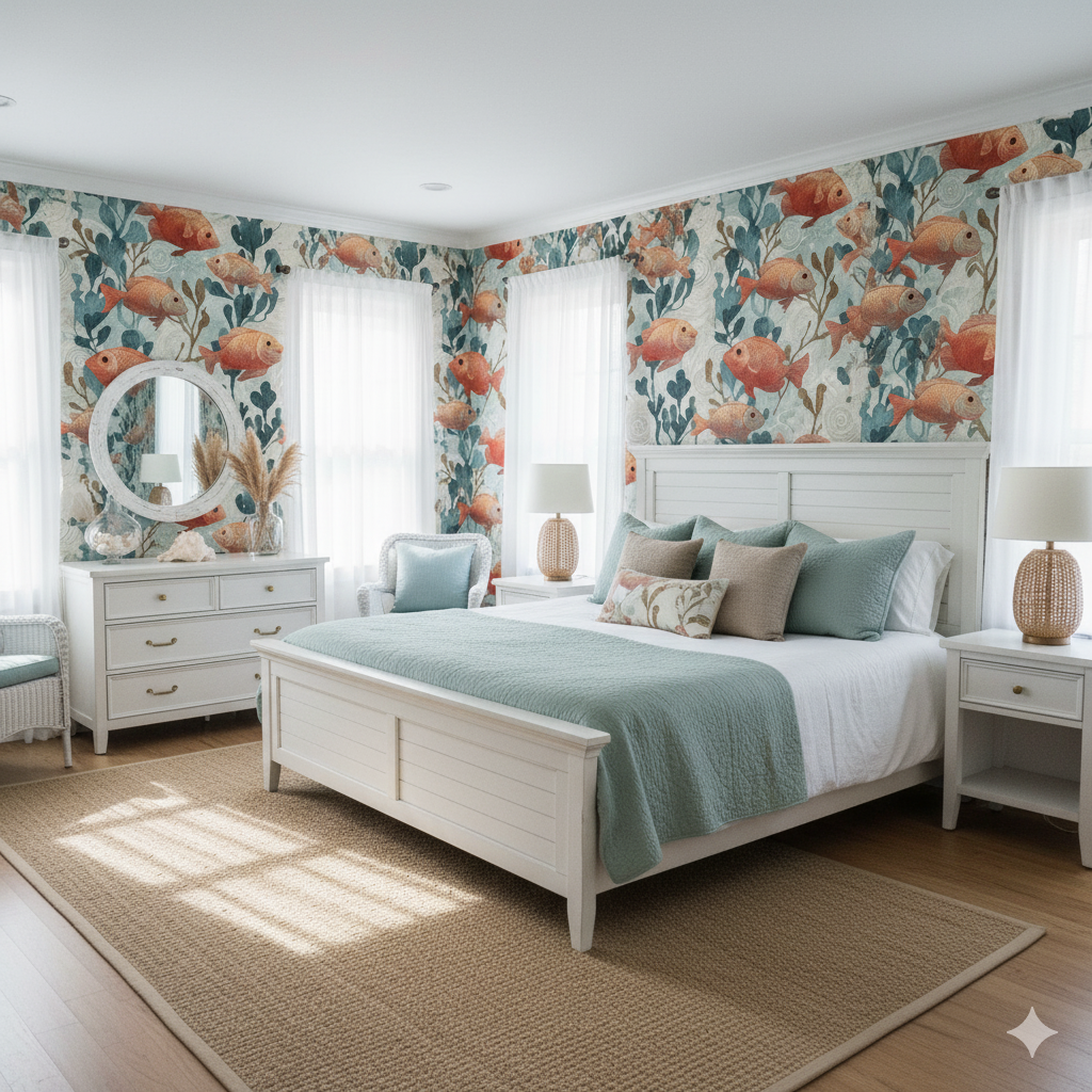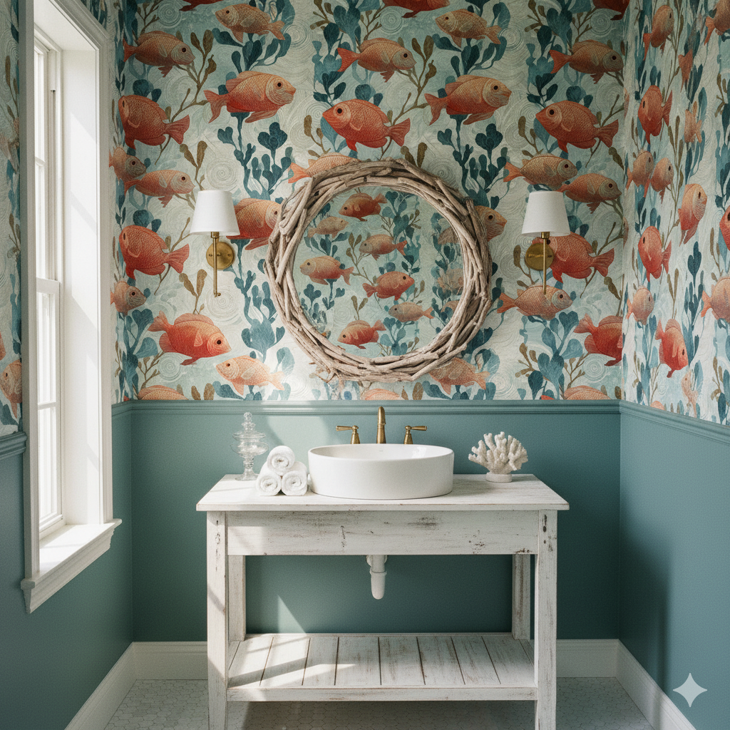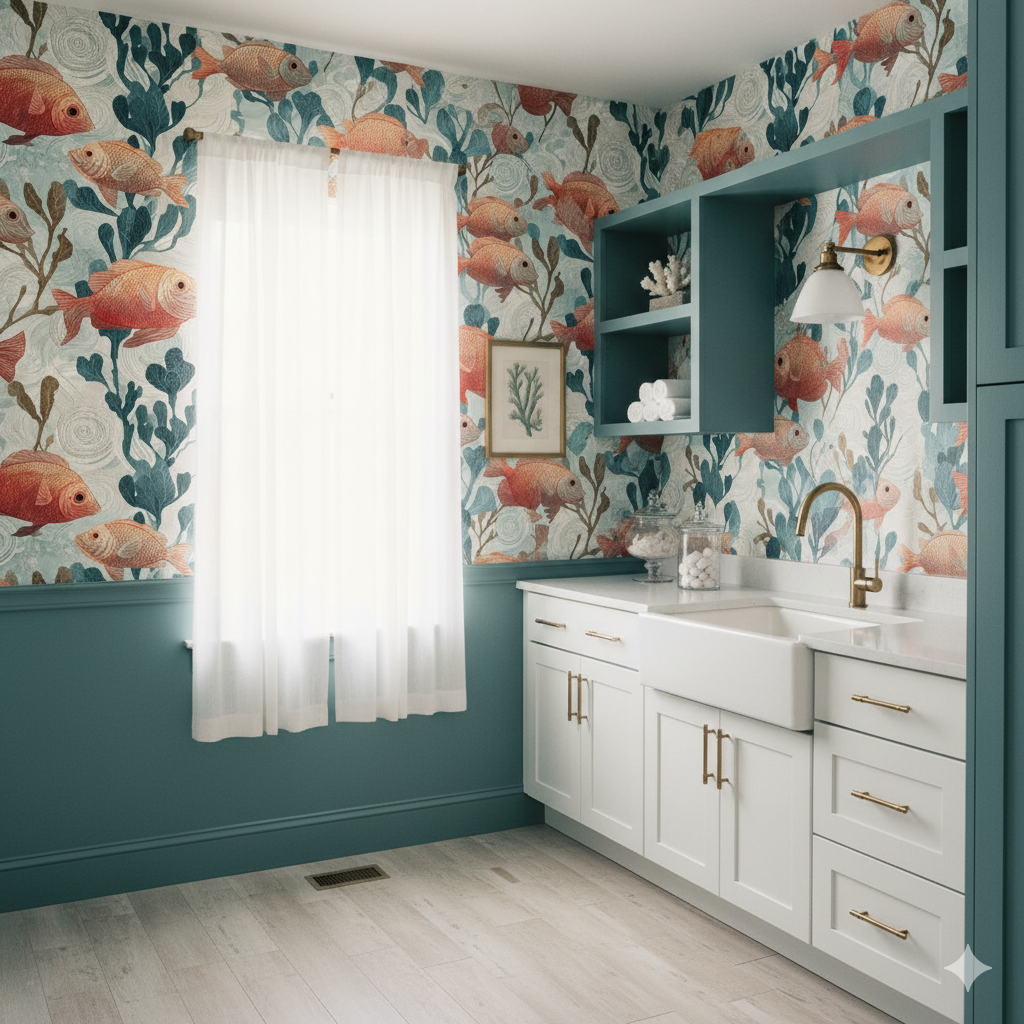 Coral Ledger is an underwater tapestry of rhythm and repetition. Schools of crimson fish weave through fronds of sage kelp and sienna seaweed, their scales etched with delicate linework reminiscent of vintage marine illustrations. The swirling background mimics oceanic currents, marrying the precision of scientific drawings with the warmth of hand-painted artistry. Ideal for bathrooms, coastal kitchens, or lively dining rooms, Coral Ledger feels organic and collected — a refined homage to natural history walls and Victorian exploration journals. It’s coastal storytelling, told through line, movement, and a hint of myth.