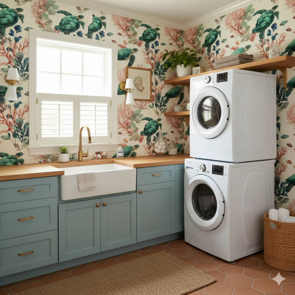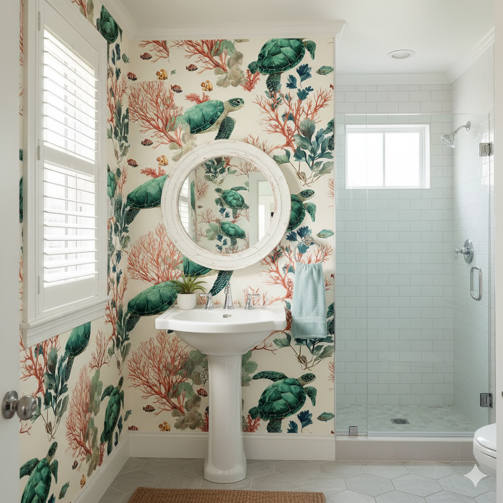 This wallpaper captures the vivid movement of life beneath the waves, where emerald-green sea turtles swim gracefully through forests of coral painted in warm shades of crimson, salmon, and dusty rose. The contrast between the turtles’ jewel-toned shells and the organic branching coral creates a balance of strength and fragility, evoking the beauty of marine sanctuaries. Scattered tropical fish punctuate the design with small flashes of orange, yellow, and black, bringing a lively rhythm to the scene. Ideal for coastal homes, beach cottages, or bathrooms designed to feel like a private escape, Coral Passage transforms walls into living aquariums. It works beautifully as an accent wall in dining spaces or children’s rooms, where the playful yet elegant marine setting encourages wonder and calm. The scale and richness of color make it equally suitable for vacation rentals aiming to deliver a sense of luxury and connection to the sea.