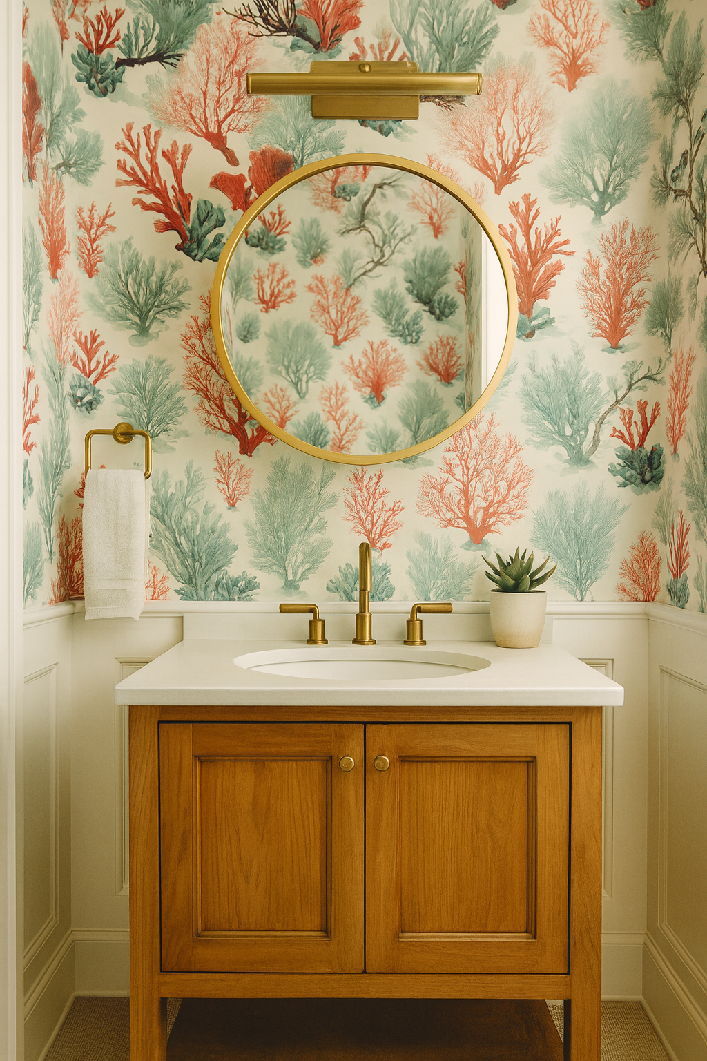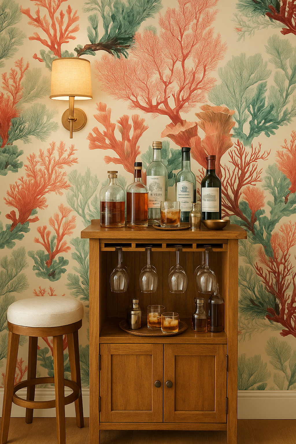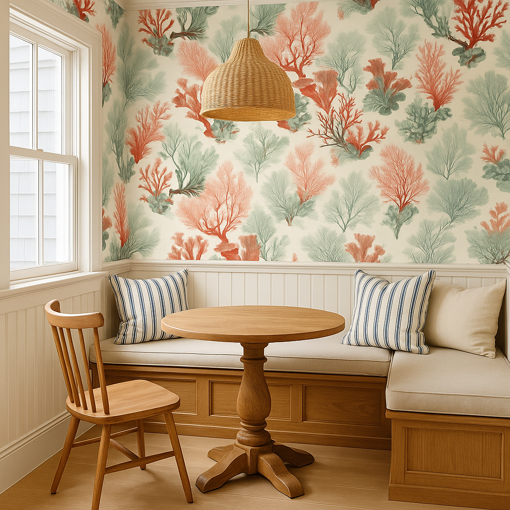 Inspired by underwater formations, "Coral Script" features twisting, branching coral-like shapes in pale sand, gray-blue, and clay red, dancing across a warm backdrop. The pattern feels like it was drawn in slow motion—fluid, organic, and expressive. This oceanic wallpaper is ideal for coastal homes, eclectic dining rooms, or beachy bathrooms that lean toward artistry and abstraction.