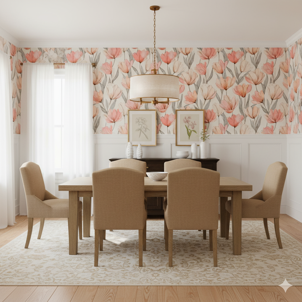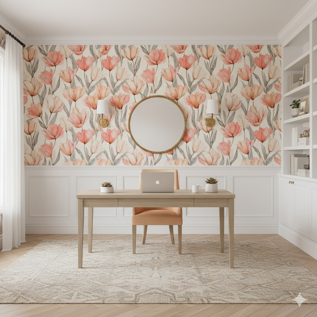 A romantic ode to botanical illustration, Corinne Field layers delicate blush tulips with graphite-toned stems on a parchment ground. The hand-drawn linework and translucent watercolor washes evoke antique notebooks and soft morning light. Its timeless elegance fits bedrooms, conservatories, or reading nooks that call for calm and natural beauty. Corinne Field feels poetic—quietly nostalgic yet undeniably refined.