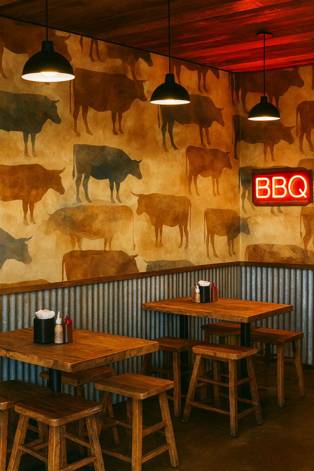 Silhouetted cattle in profile and grazing stances are layered in warm earth tones and cool slate blues, blending softly into a watercolor-style wash. This wallpaper evokes early morning pasture haze, with abstract movement and rustic subtlety. Perfect for a modern ranch kitchen, farmhouse hallway, or gender-neutral nursery with a nod to rural calm. It’s country, but make it contemporary.