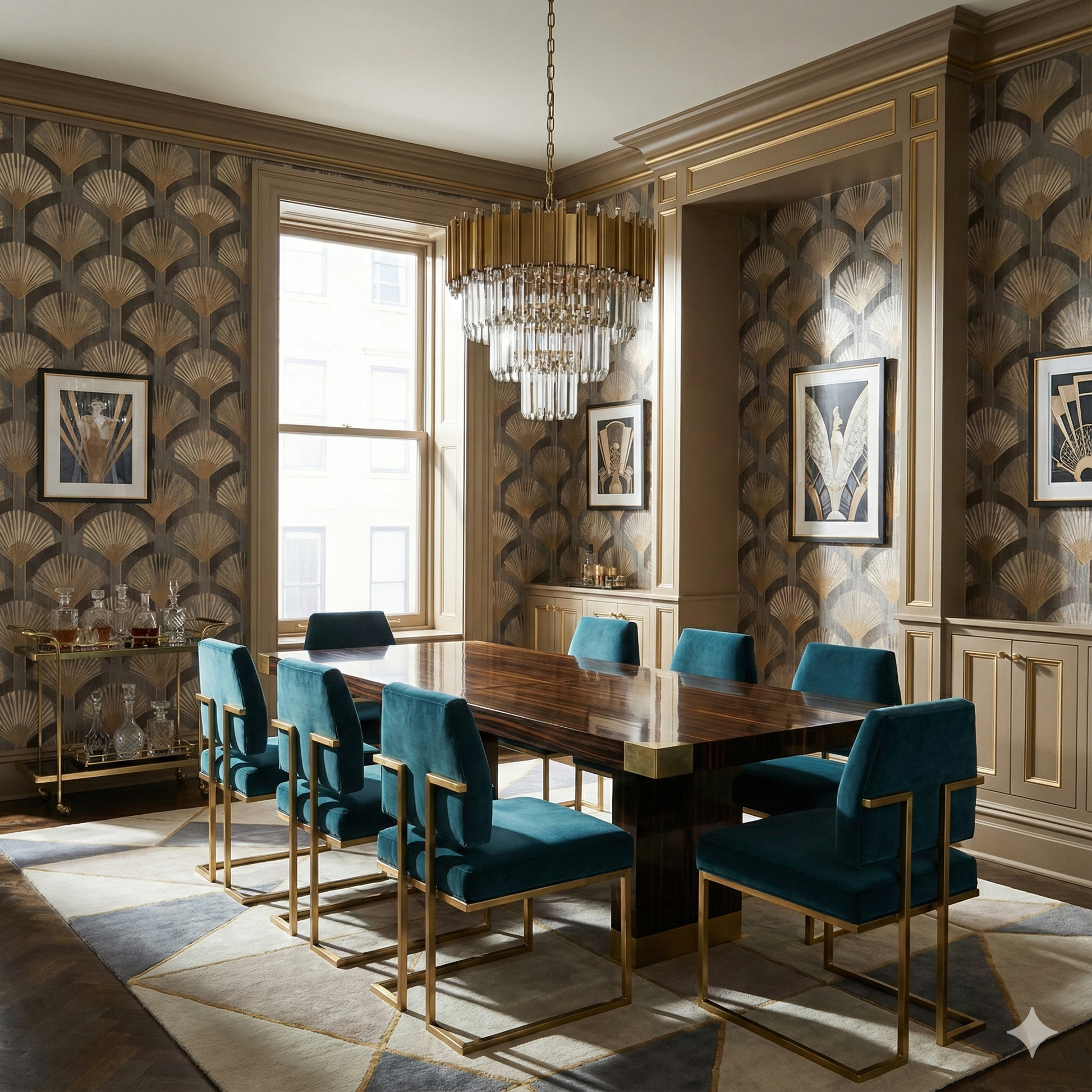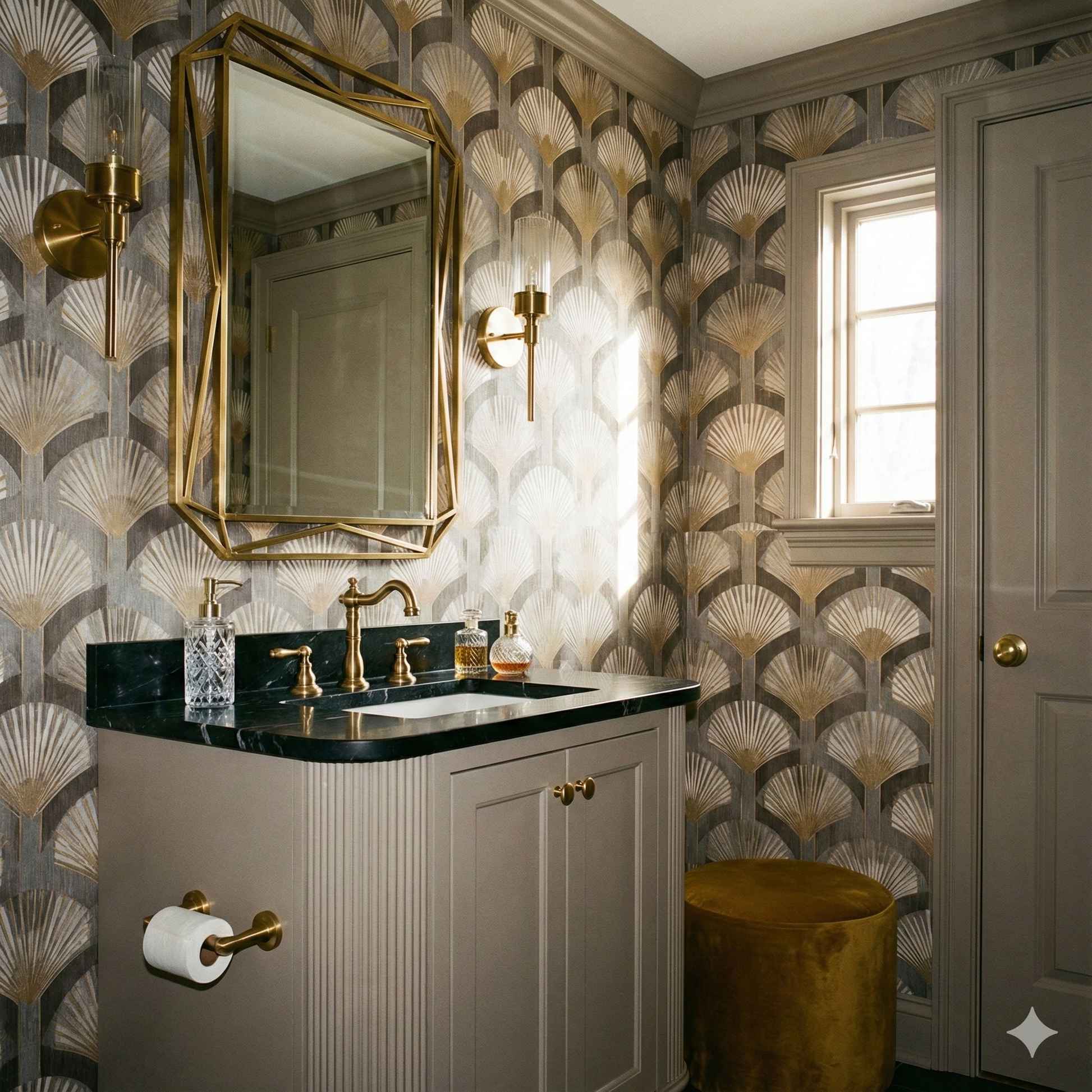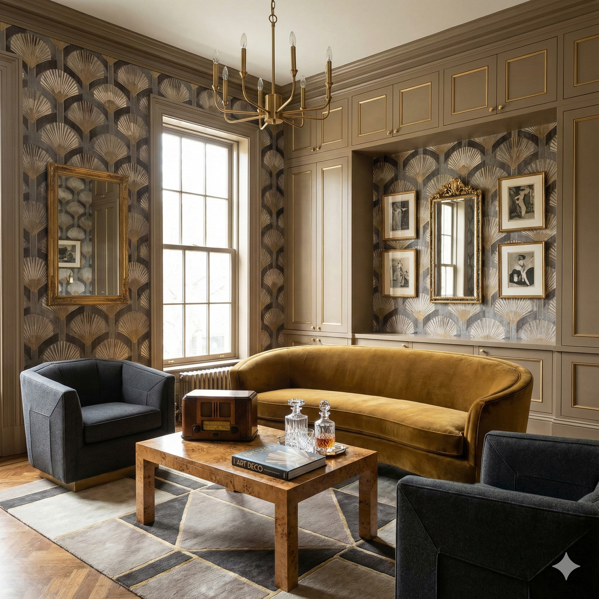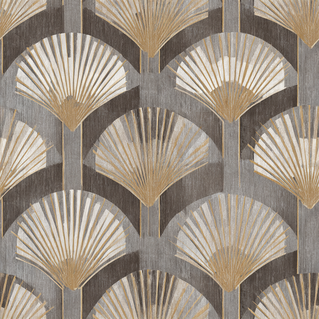 A masterclass in geometric elegance, “Deco Mirage” reinterprets the glamour of the Jazz Age in taupe, graphite, and antique gold. Stylized fan and palm motifs radiate upward like rays of early morning light, creating a sense of structure and sophistication. Its symmetry and restraint evoke Art Deco interiors of the 1930s—opulent but never overstated. This design elevates hallways, dressing rooms, and formal spaces, pairing beautifully with velvet, marble, or dark wood. It’s a celebration of balance, rhythm, and golden-age refinement reborn for the modern home.