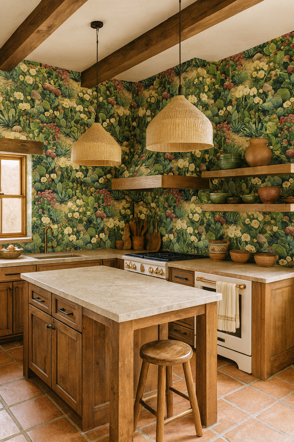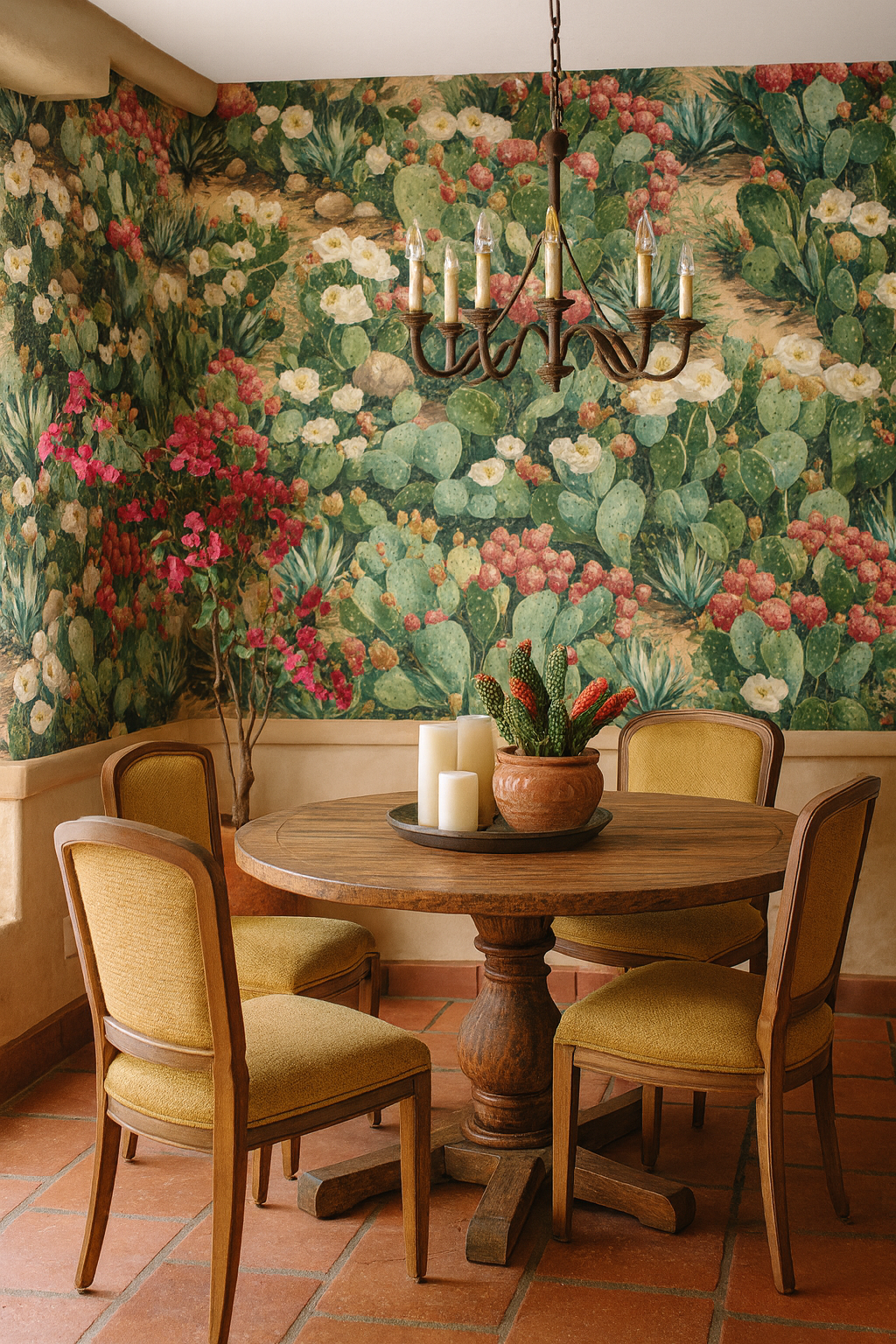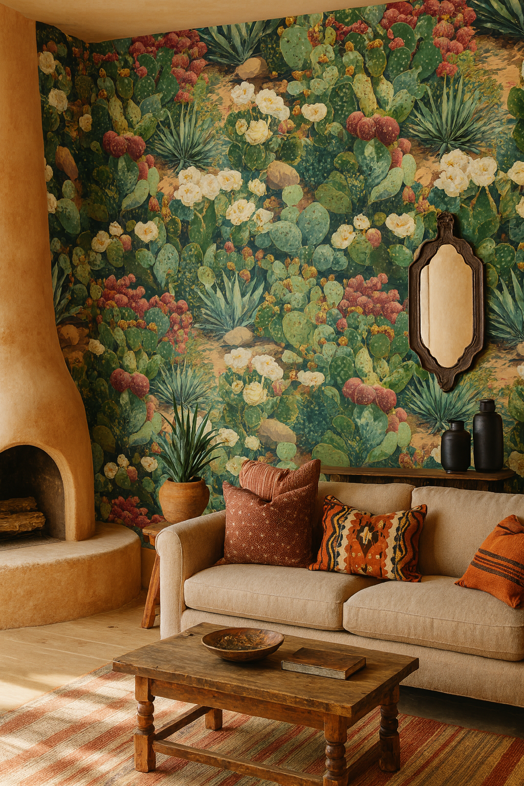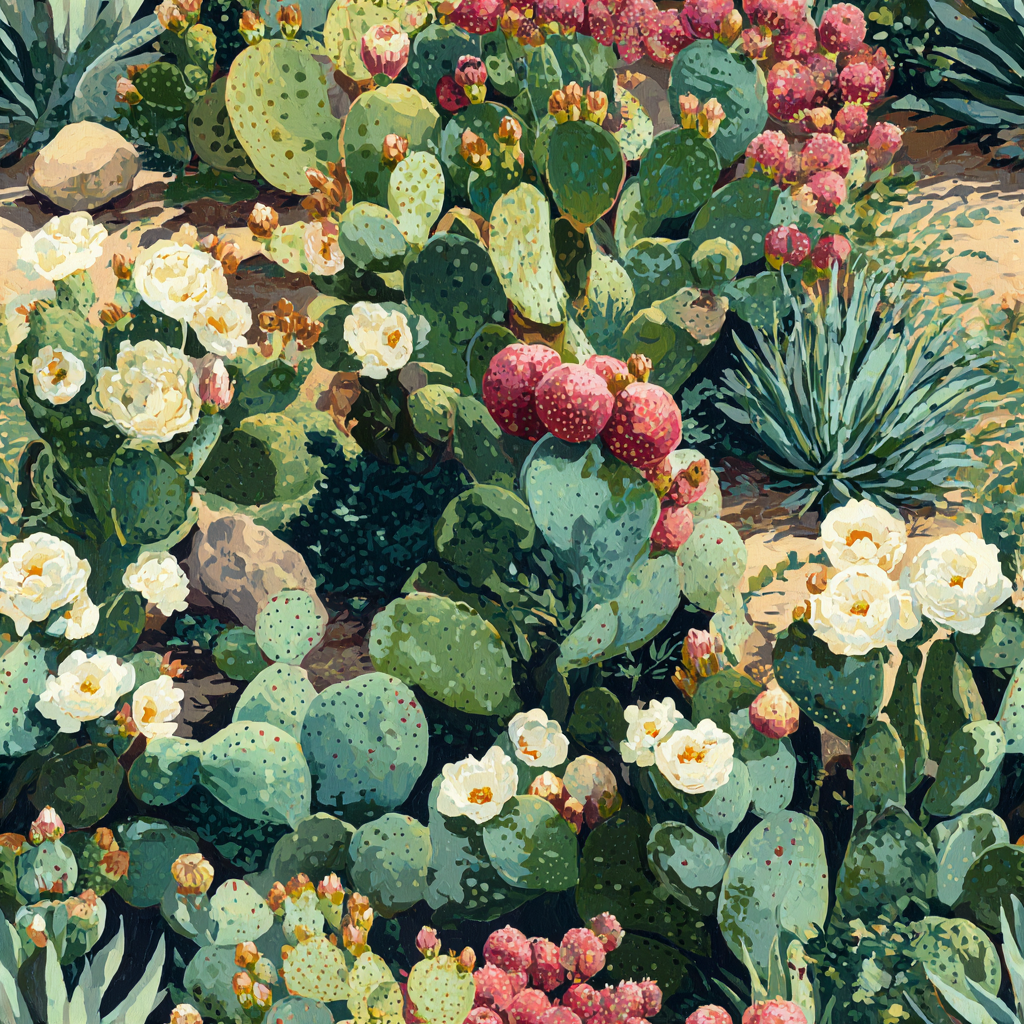 An intricate botanical tapestry of West Texas flora, this design features blooming prickly pear cacti in shades of sage green, coral red, ivory, and buttercream, nestled among desert soil and rocks. The painterly realism brings the arid landscape to life. Perfect for desert-modern homes, sunrooms, or powder rooms that embrace bold flora with earthy sophistication.