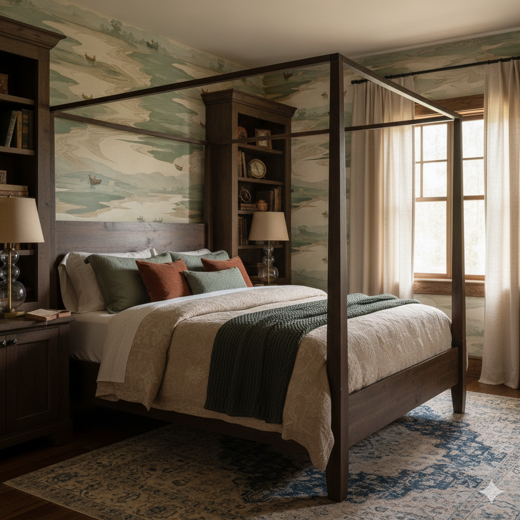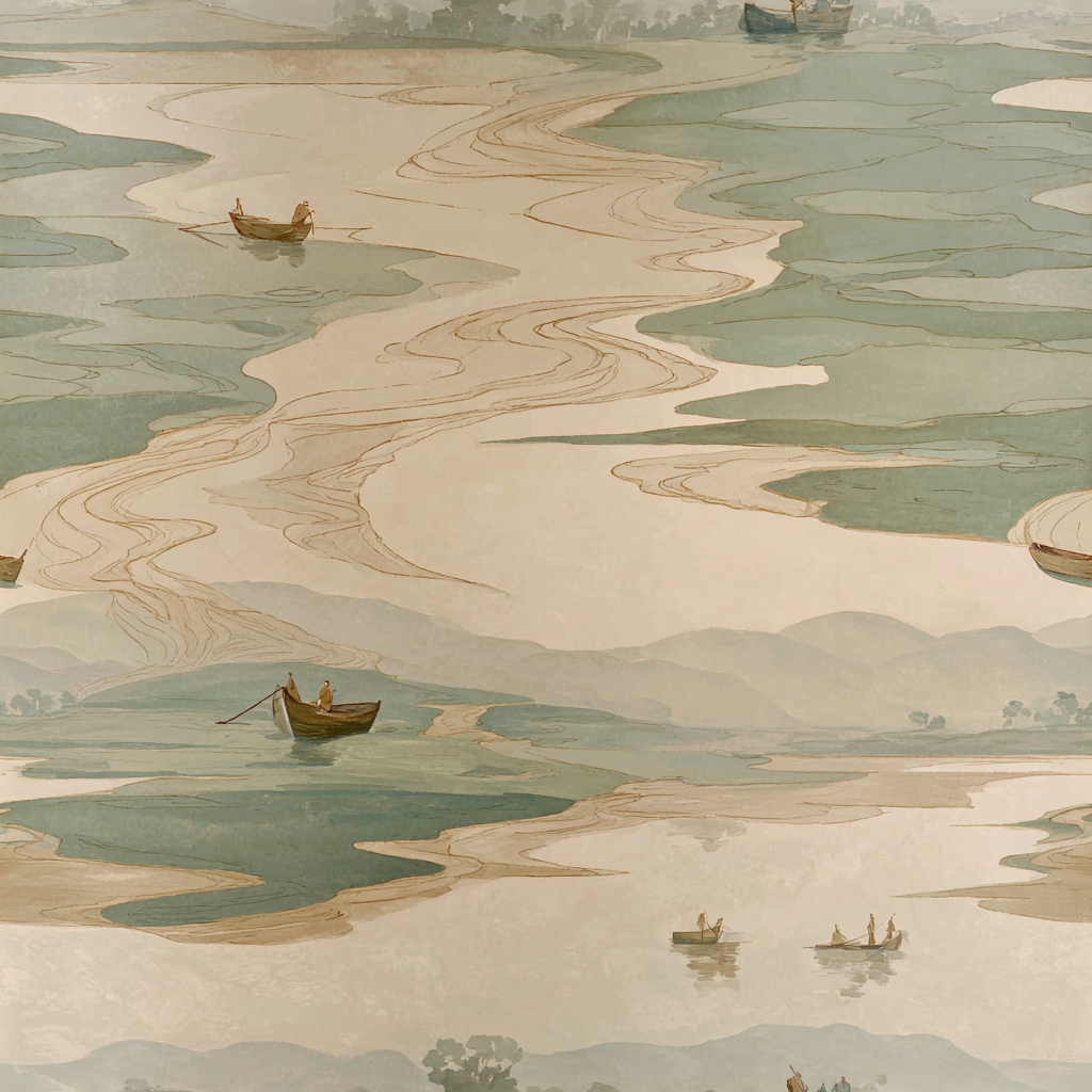 Inspired by classical Chinese scroll paintings, this design depicts winding rivers and distant mountains with delicate boats drifting across wide water surfaces. Rendered in washed jade greens, warm earth tones, and ivory, it feels timeless yet contemporary. The flowing currents and soft brush lines lend a meditative stillness, evoking journeys, trade routes, and ancient waterways. This wallpaper works beautifully in dining rooms, tea rooms, or boutique hotels that want to suggest refinement and heritage. Its horizontal rhythm expands a room, making walls feel wider and more open.
