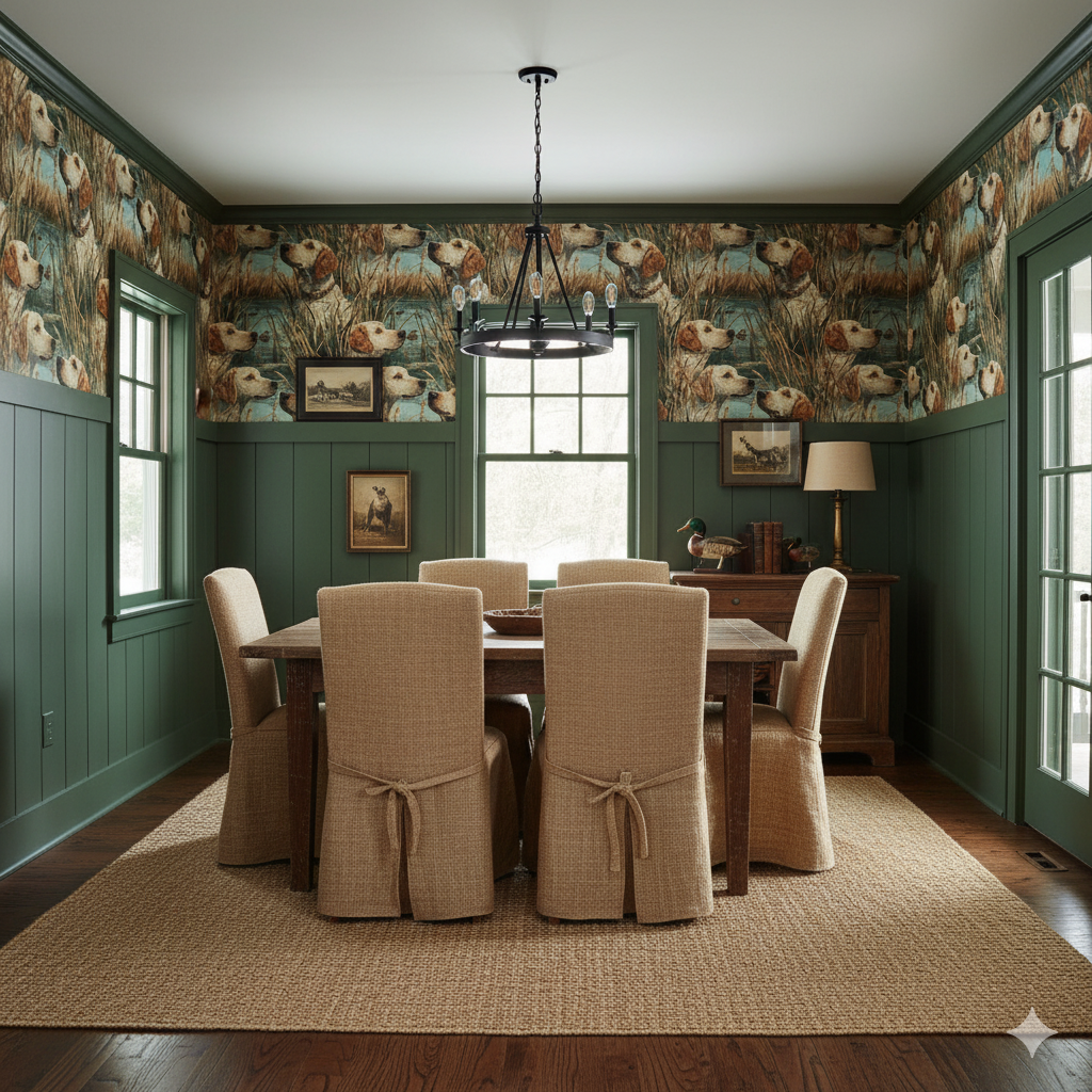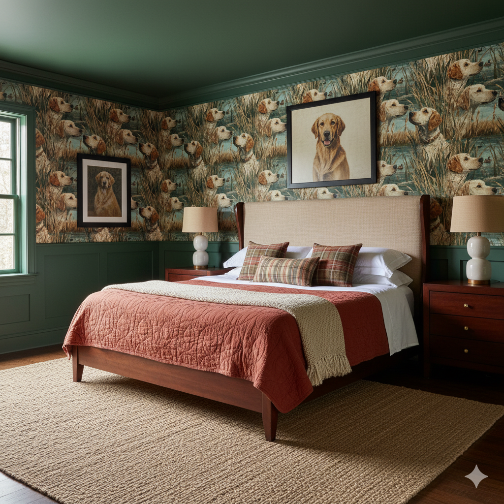 Duckhaven channels the mood of a sportsman’s retreat: earthy, nostalgic, and layered with oil-painted texture. The scene unfolds in strokes of deep teal, russet, and cream, with retrievers waiting alertly in marsh grass as flocks of ducks sweep across a dusky sky. The pattern carries the tactile charm of a vintage field canvas, where texture and tone tell a story of patience and pursuit. Ideal for study walls, lodge interiors, or heritage-inspired spaces, it’s a mural-like tribute to outdoor life—one that balances rugged realism with painterly warmth.