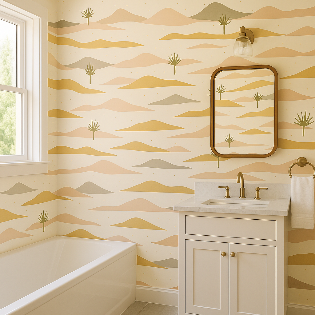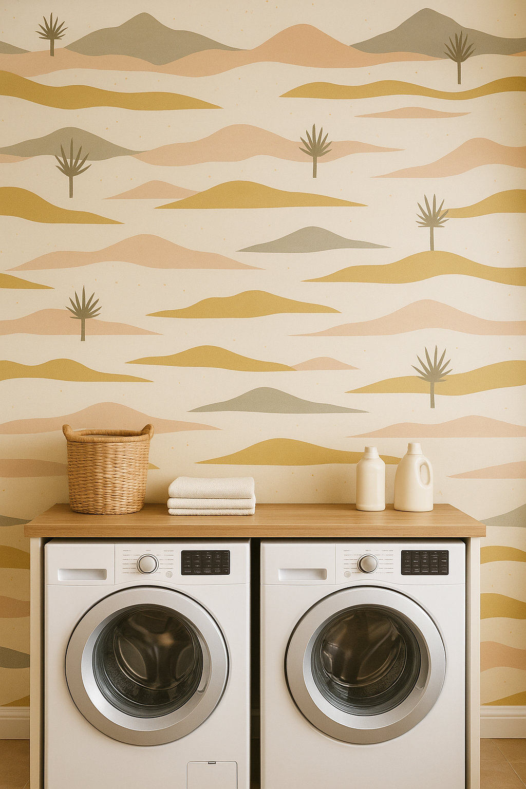 Minimal yet full of movement, Dune Lines evokes the soft sweep of desert landscapes through gentle curves and sparse vegetation. Neutral tones of sand, blush, and clay form stylized hills, while small desert plants dot the scene with quiet elegance. Perfect for Japandi-inspired bedrooms, nurseries, or modern boho interiors, this pattern brings calming energy into any space. Subtle, abstract, and organic—Dune Lines offers a fresh take on nature-inspired design.