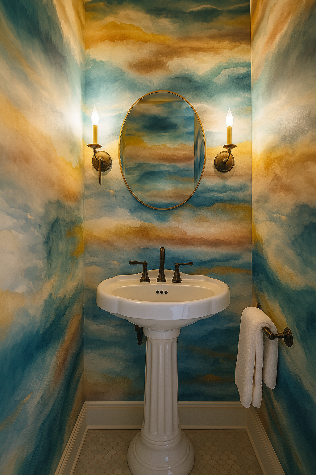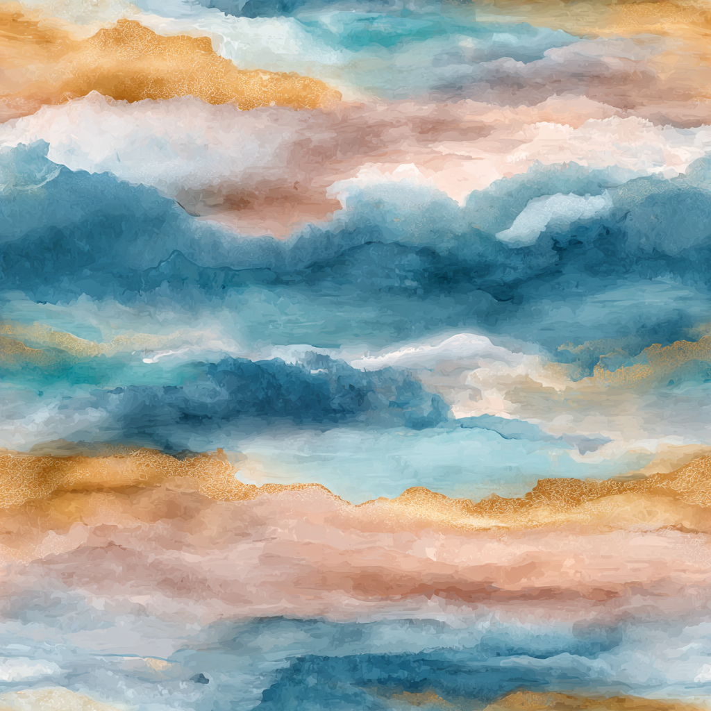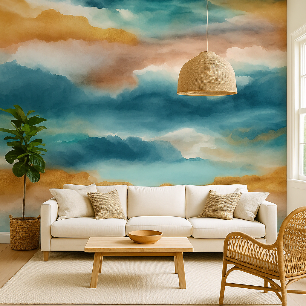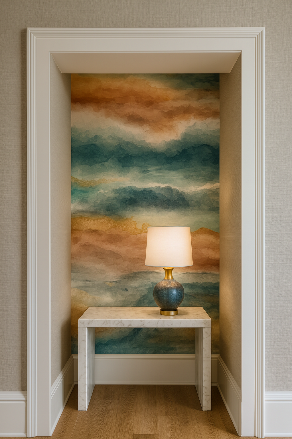 Like watching a sunset roll across shifting sands, Dune Mirage layers watercolor bands of warm peach, indigo blue, copper, and soft sky in painterly horizontal movement. Calm yet colorful, it adds a desert palette with a dreamy twist—perfect for Southwest-inspired interiors, spa bathrooms, or bohemian bedrooms that lean modern.