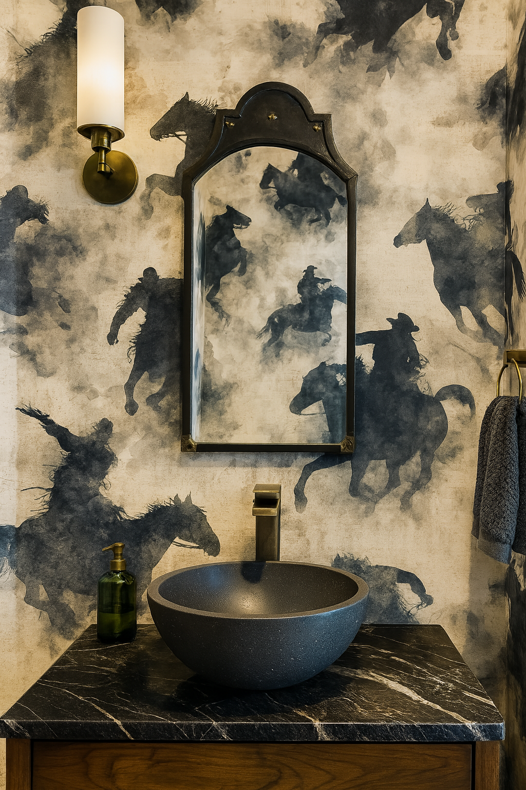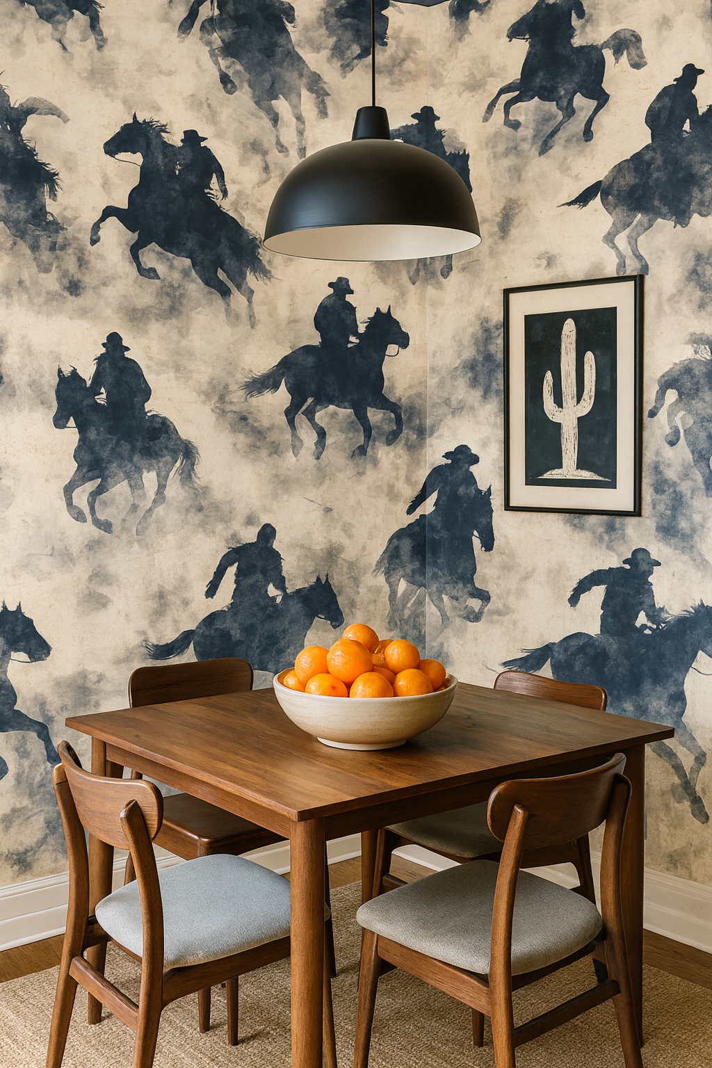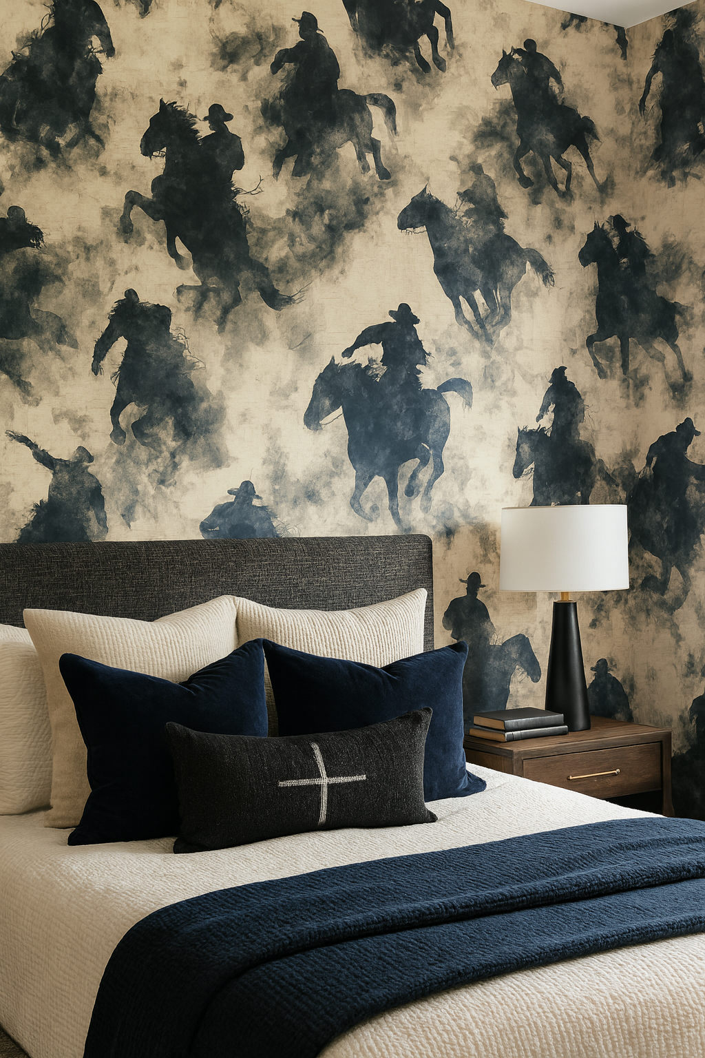 Dust Riders captures the kinetic power of the Wild West in a moody watercolor silhouette style. Cowboys on bucking broncos burst through swirling desert dust in rich indigo tones on a parchment backdrop. Gritty, atmospheric, and masculine, this design is perfect for Western-themed bedrooms, whiskey lounges, or ranch homes with a rebellious edge.
