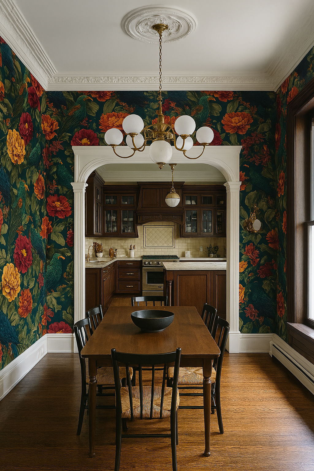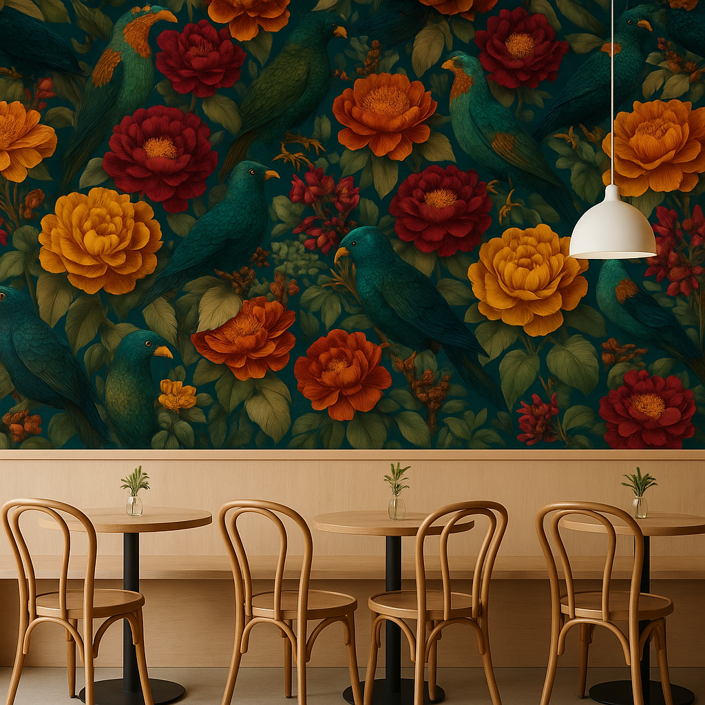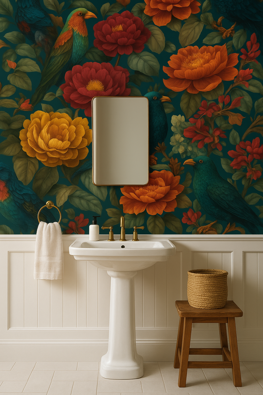 A visual symphony of life and color, Eden Menagerie brims with tropical grandeur. Jewel-toned birds perch proudly among oversized peonies, marigolds, and botanical vines, set against a deep teal-green backdrop. This maximalist print is theatrical in all the right ways—lush, dramatic, and dripping with storybook opulence. Ideal for powder rooms, parlors, or creative studios, it turns every wall into a living canvas. Pair with velvet, vintage brass, or lacquered accents for full visual drama.