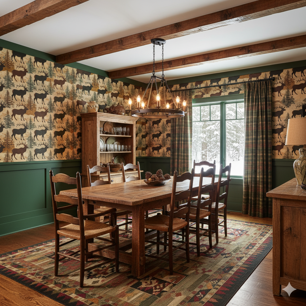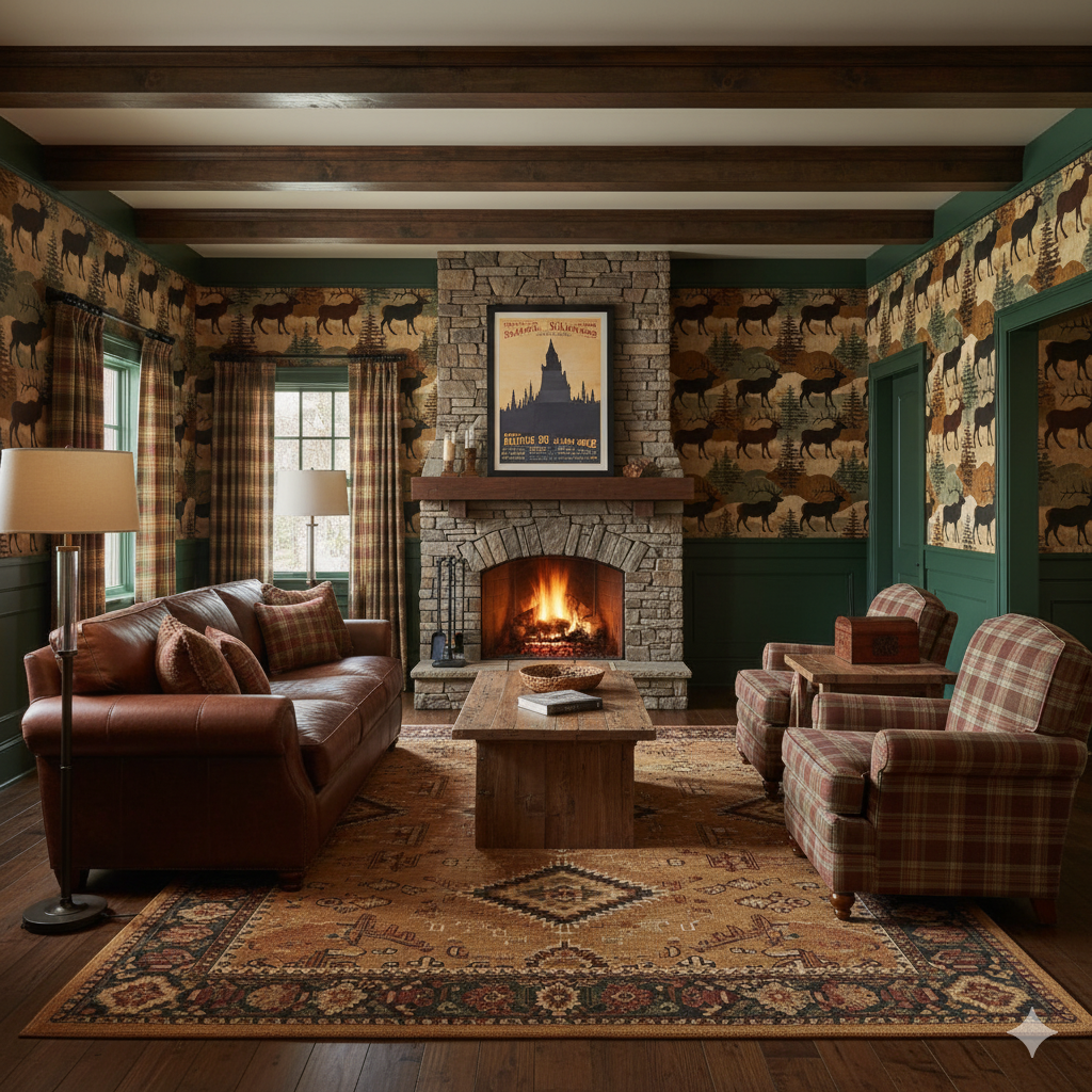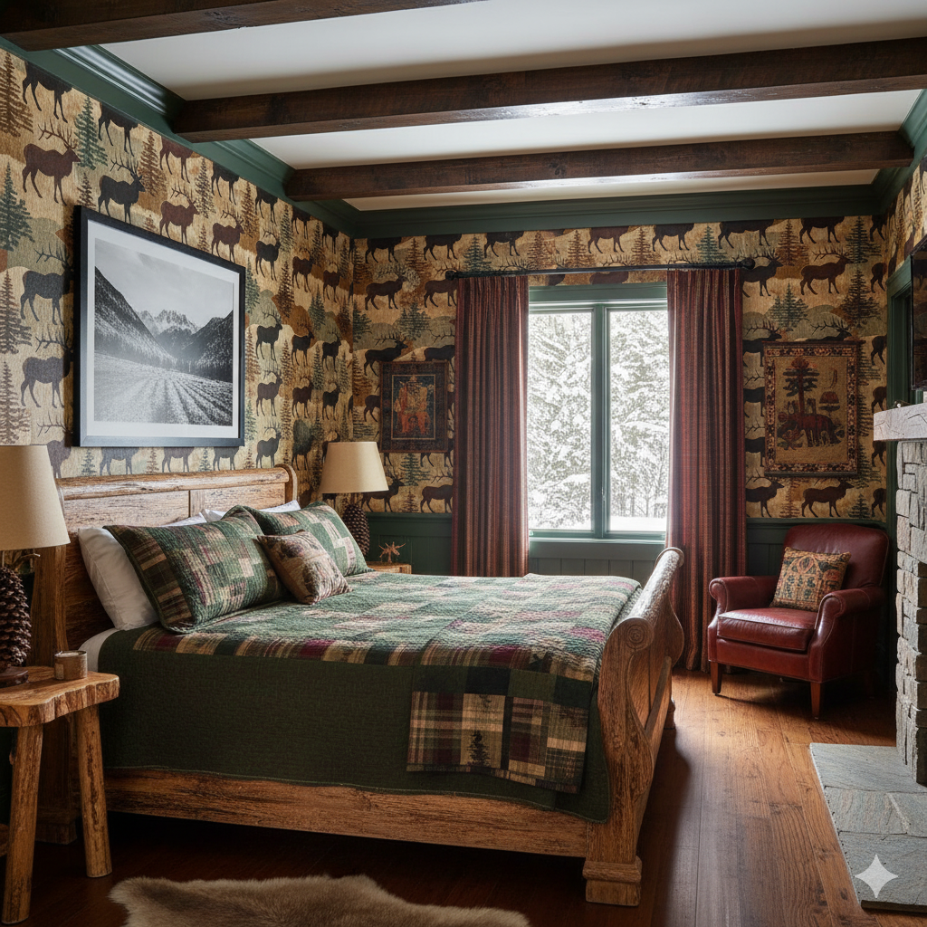 Majestic and grounded, Elkford Range captures the timeless calm of forested mountain valleys. Silhouetted elk stand among layered evergreens, rendered in muted tones of chestnut, pine, and sand. The design feels tactile and dimensional, recalling woven textiles or lodge upholstery. Ideal for cabins, lodges, or masculine living spaces, it brings the spirit of the wild indoors without overpowering the room. Paired with natural stone, iron, or warm wool textures, it exudes authenticity and mountain strength — a modern homage to North American wilderness.