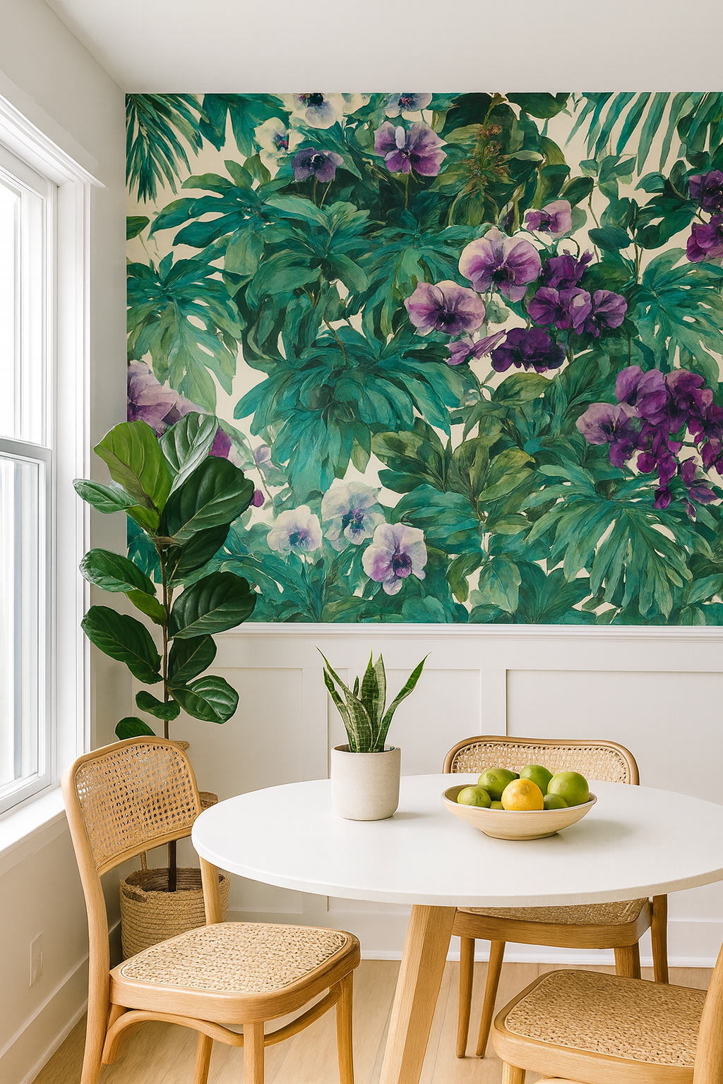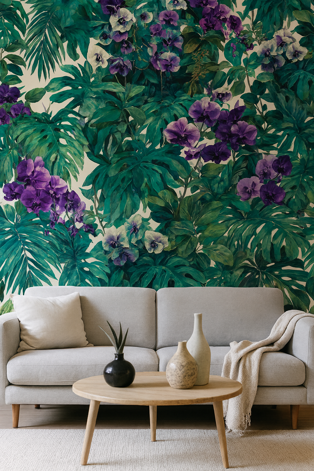 A lush jungle composition with vibrant orchids, creeping vines, and layered monstera leaves painted in deep emerald, violet, and teal. The painterly brushwork captures the humidity and density of a hidden rainforest sanctuary—wild, rich, and full of movement.