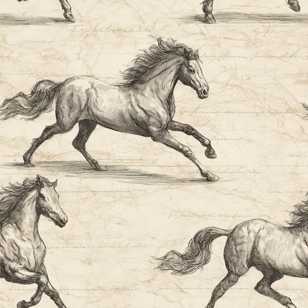 Equinox Run captures the primal energy of horses in full gallop, drawn with the delicate authority of a 19th-century anatomical study. Each movement is etched in ink across parchment veined with faint script, blurring the line between art and archive. The result is timeless — intellectual yet deeply emotive. Perfect for libraries, stables, or farmhouse entryways, Equinox Run channels the romance of classical equine portraiture with the restraint of fine draftsmanship. It pairs beautifully with antique frames, leather furniture, and walls that tell stories of heritage and motion.