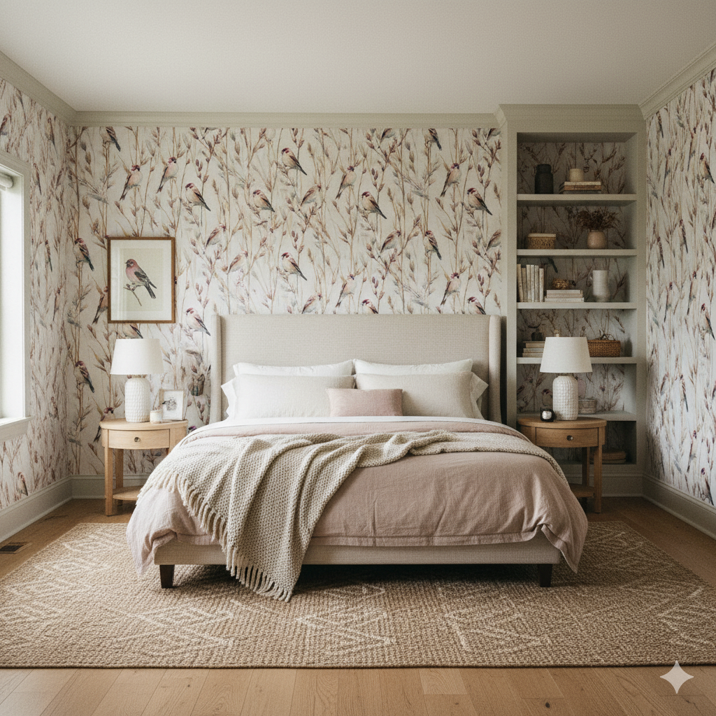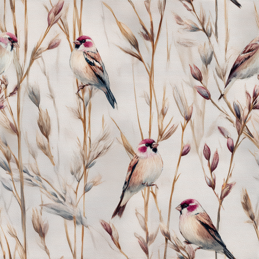 Finchmoor captures the delicate poetry of meadow life. Hand-painted finches perch on slender stalks of dried grass, their rose-tinted plumage glowing softly against a parchment-toned sky. The gentle balance of blush, fawn, and smoke-gray evokes the stillness of dawn, when fields hum quietly before the day’s first light. This wallpaper lends an ethereal calm to bedrooms, reading corners, or breakfast nooks, offering a subtle nod to vintage English botanical illustration. Finchmoor transforms walls into soft vignettes of nature’s lyricism — elegant, airy, and timelessly pastoral.