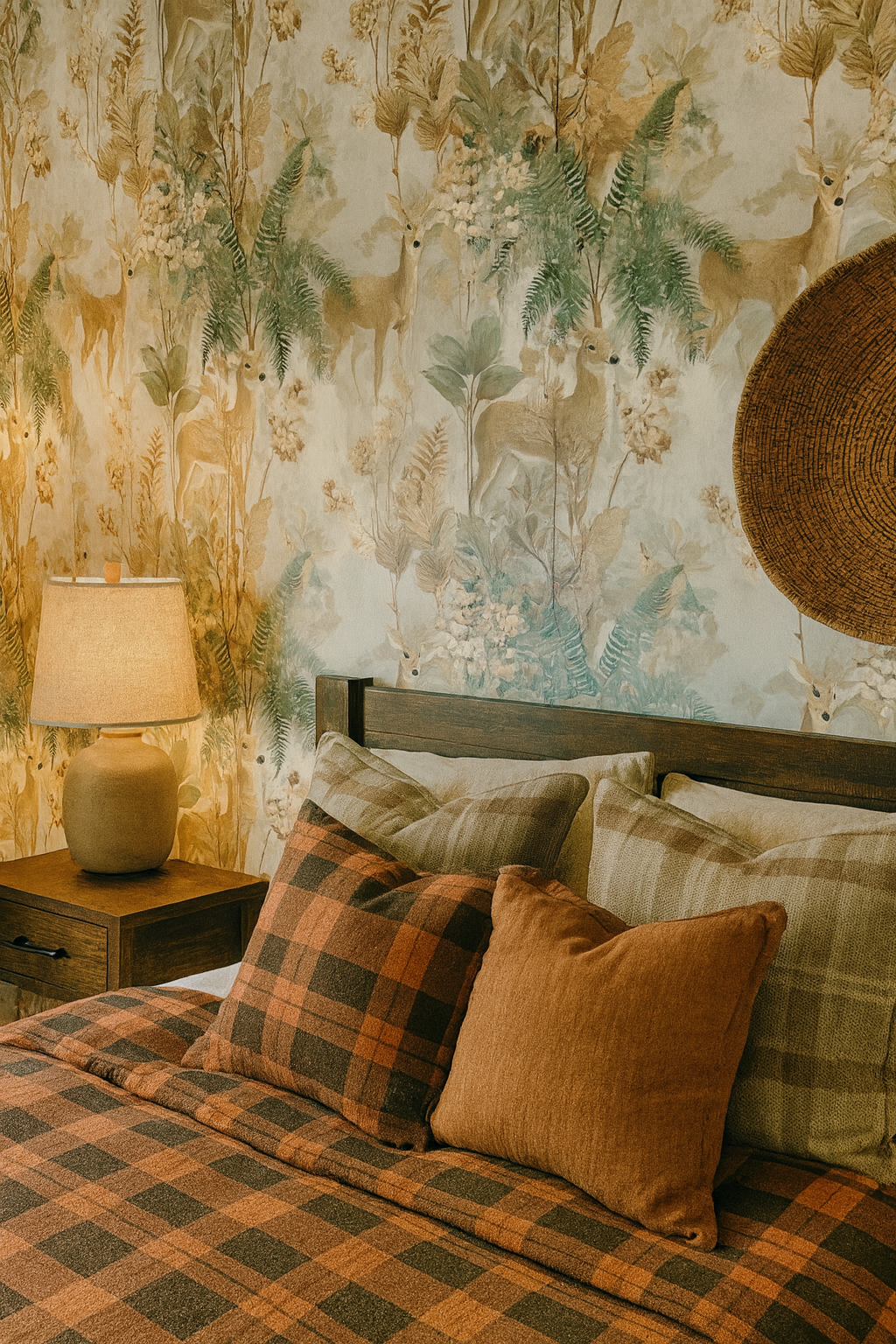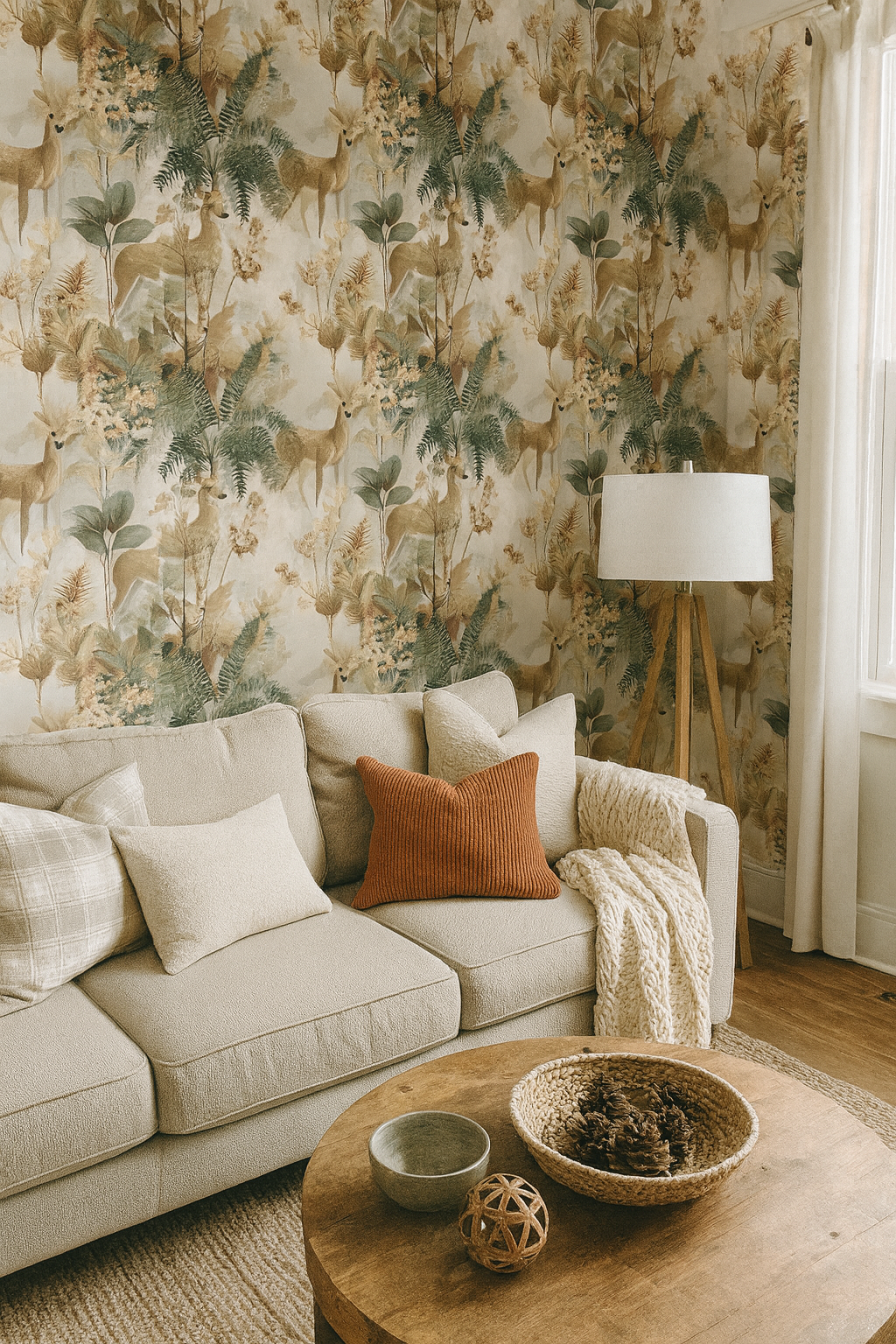 This richly layered woodland scene captures white-tailed deer nestled among delicate ferns, turning leaves, and dried hydrangeas. With warm earthy tones—olive, russet, chestnut, and parchment—the composition feels like a still from an old nature field guide. Ideal for lodge-style statement wallpaper, rustic nursery décor, or autumnal textiles that echo quiet woodland mystery.