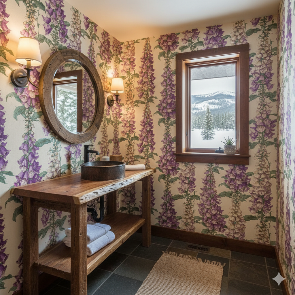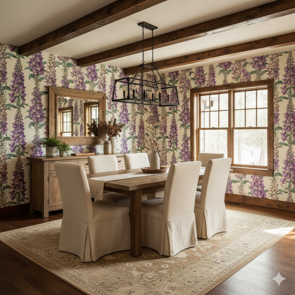 This wallpaper features towering foxglove spires in shades of rich violet and cream, their bell-shaped blossoms stacked like a vertical chorus line of wildflowers. Each bloom is intricately detailed with speckled interiors and fine linework that captures the natural drama of Digitalis purpurea in full bloom. The design balances botanical illustration precision with painterly warmth, set against a soft ivory background that highlights the saturated purples and cool green leaves. Ideal for homeowners seeking floral statement wallpaper, Foxfire Choir transforms dining rooms, entryways, or sunrooms into immersive garden spaces. Its vertical rhythm also makes it an excellent choice for accent walls where height and structure are emphasized, pairing beautifully with both antique furnishings and modern interiors.