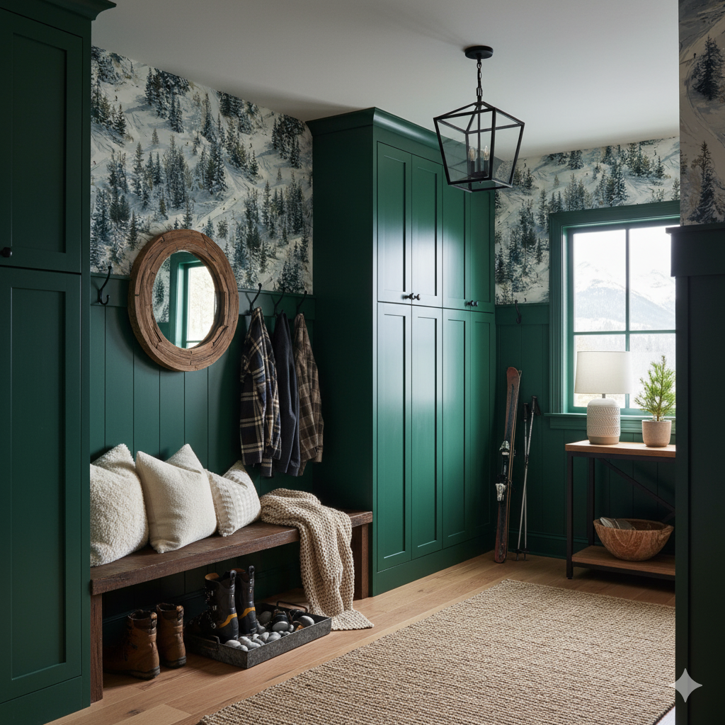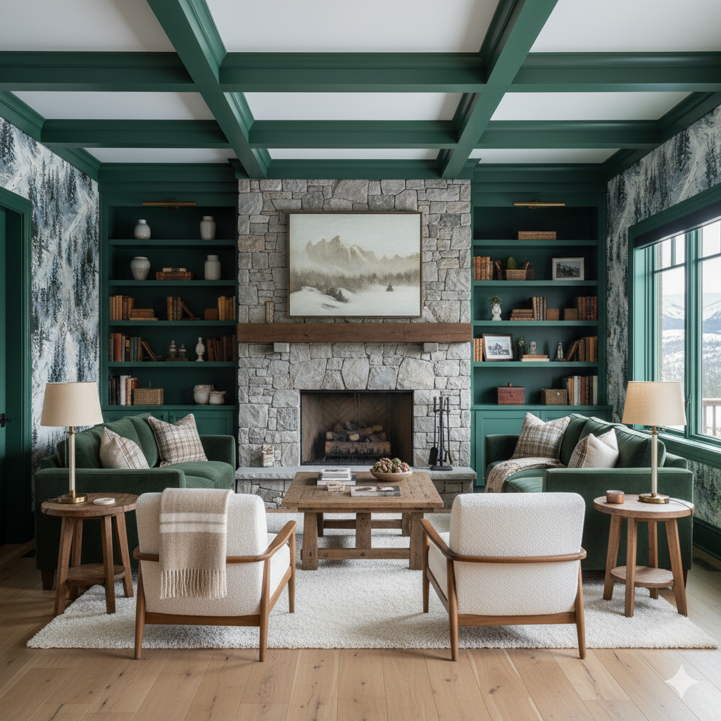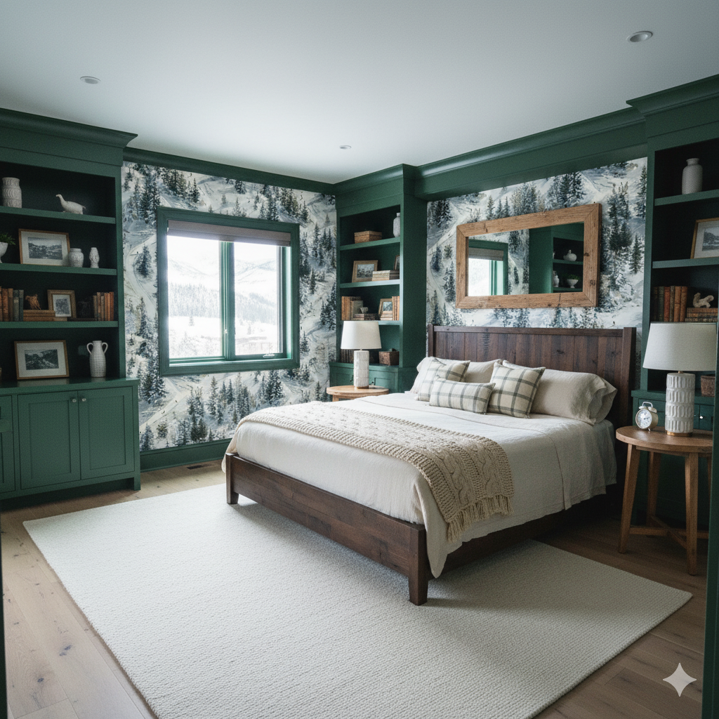 A sweeping alpine scene unfurls across this design, where trails wind through snow-laden pines and tiny skiers carve their way down hidden slopes. The muted grays, icy blues, and soft taupes create a cinematic sense of scale, like gazing out over a high-elevation ridge. Frostline Descent brings sophistication to a nature-inspired wall—ideal for modern chalets, mountain retreats, or even urban homes wanting a wintery, contemplative atmosphere. It feels alive with crisp air and distant echoes of movement.