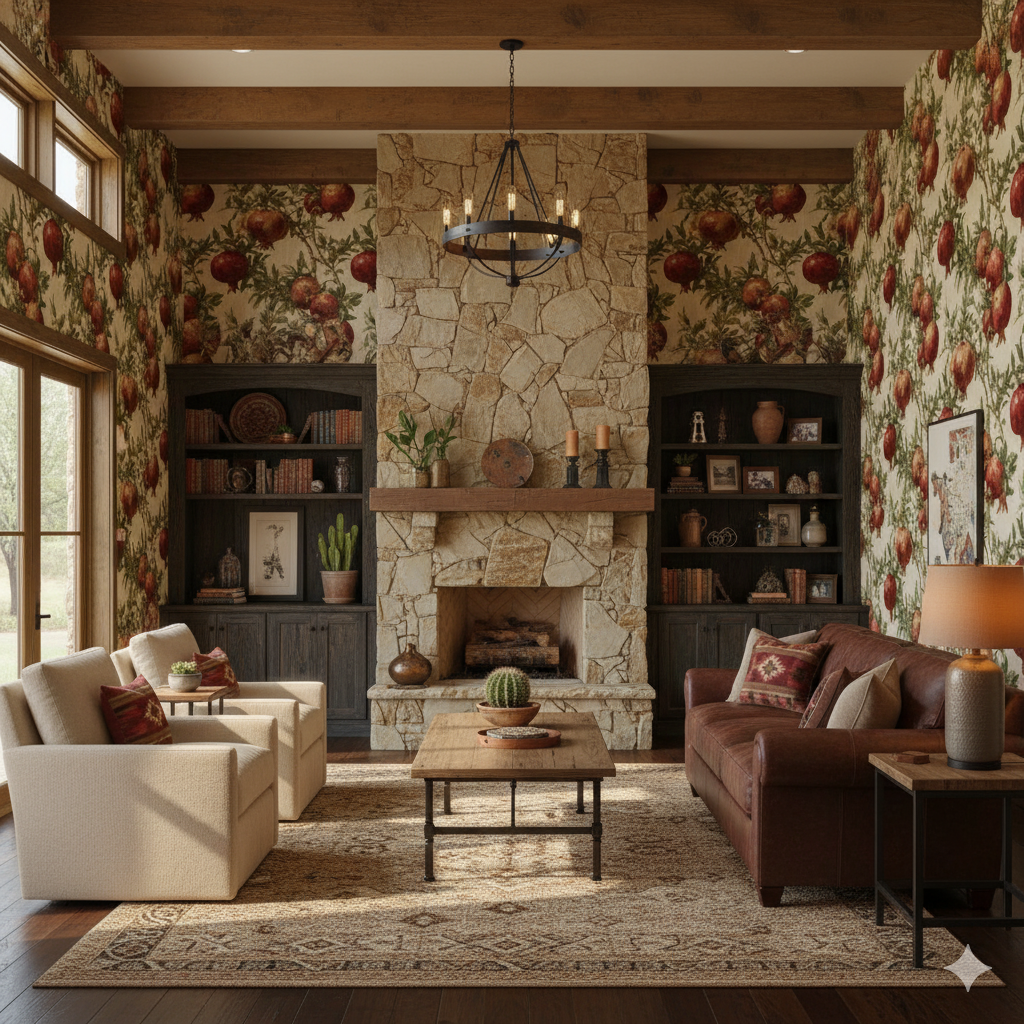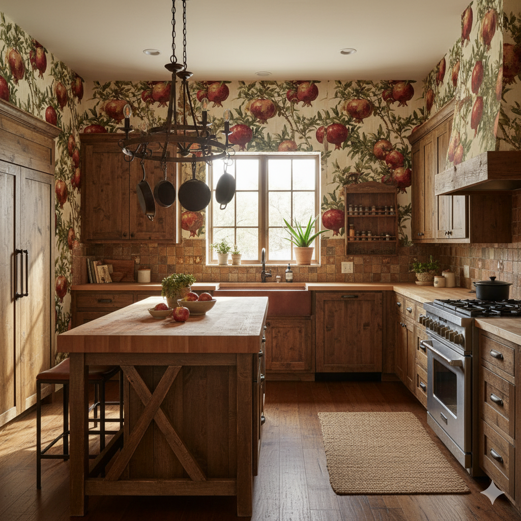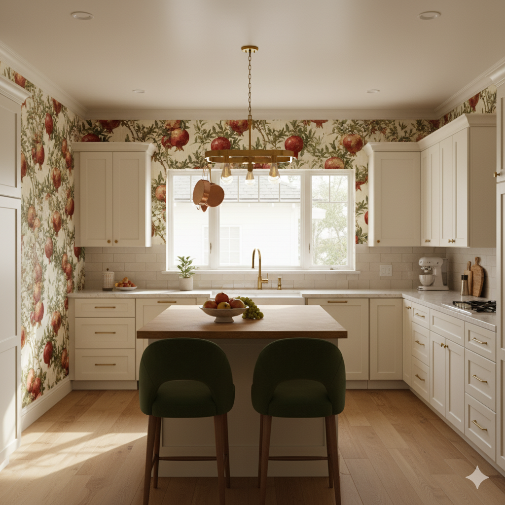 Jewel-toned pomegranates hang heavy from twisting branches, their crimson skins rich with painterly texture. Paired with olive-green leaves and a warm neutral ground, this wallpaper adds Mediterranean drama to wine rooms, entryways, or accent walls seeking a sense of richness and vitality.