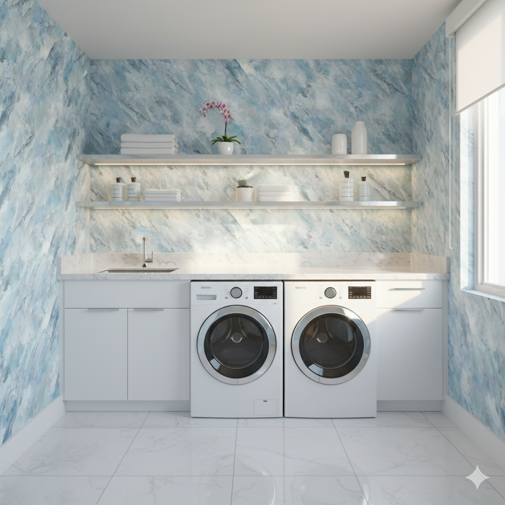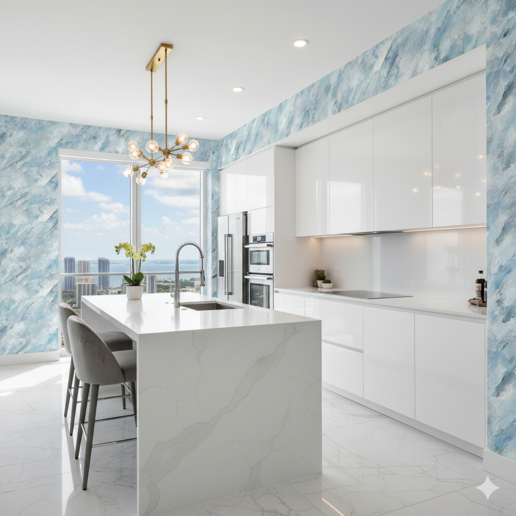 Abstract washes of ice blue, frosted gray, and snowy white flow diagonally across the surface, mimicking glacial textures and shifting winter skies. Contemporary yet organic, this wallpaper works beautifully in spa bathrooms, coastal interiors, or modern living spaces.