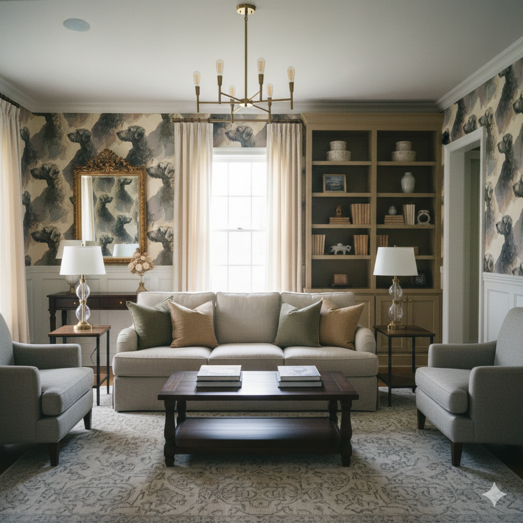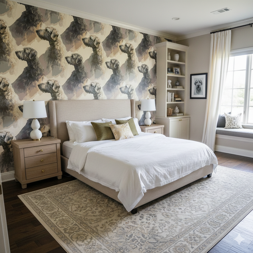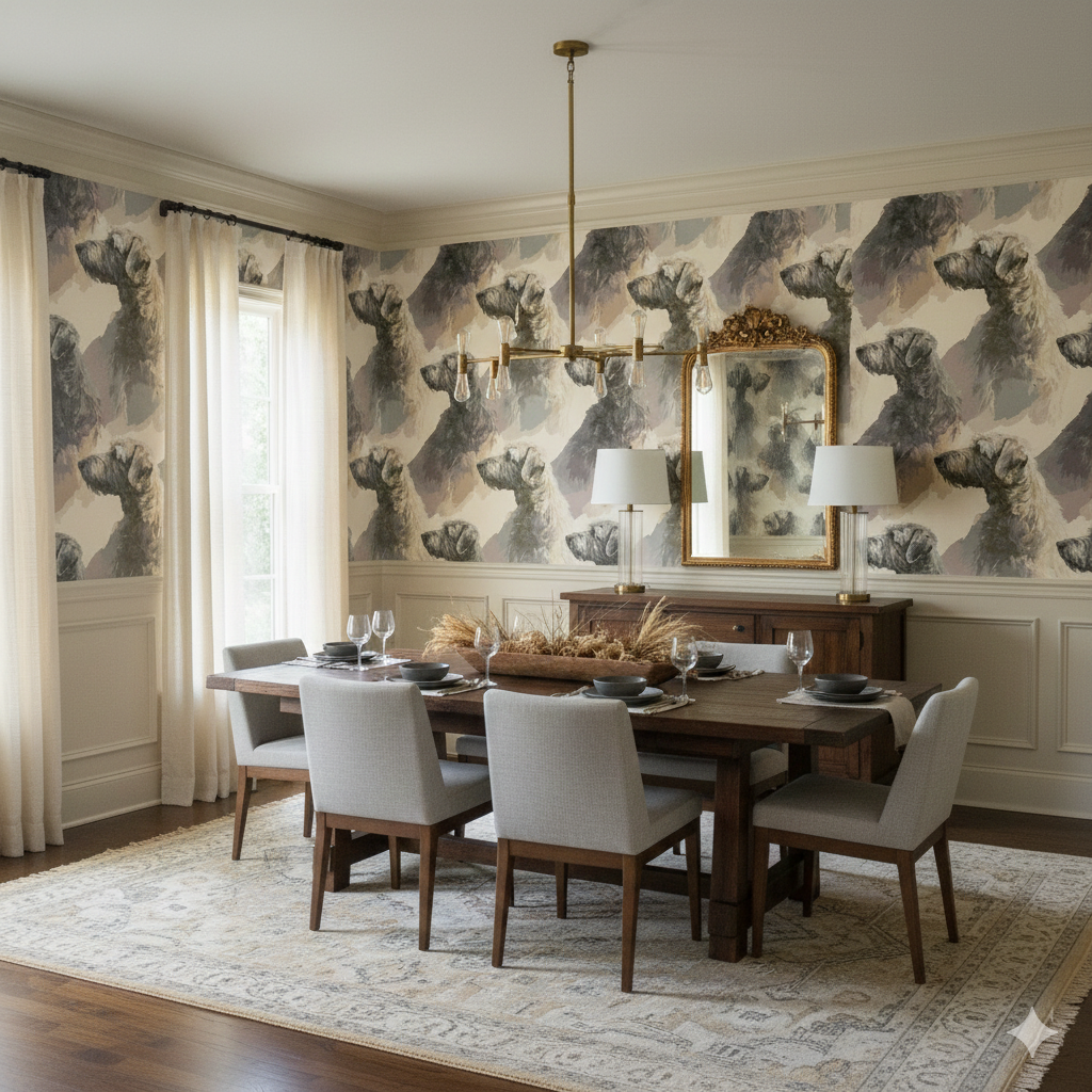 Glenhaven Fold is rugged refinement at its finest — a layered depiction of Irish Wolfhounds in soft gradients of taupe, fog gray, and sable. Their wiry fur and noble bearing exude quiet strength, while painterly transitions evoke mist rolling across the Irish countryside. The tonal depth adds warmth and tactility, making it ideal for cozy dens, stone fireplaces, or grand country interiors. Glenhaven Fold is not just pastoral — it’s mythic, grounding modern homes with ancestral grace.