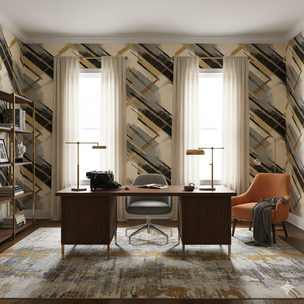This geometric abstraction plays with momentum and contrast, layering angled planes of ochre, charcoal, and soft gray against a parchment backdrop. The overlapping diagonal strokes create a sense of upward energy, as if architecture and painting have collided in motion. The palette of warm gold, black, and stone gray feels both industrial and sophisticated, lending itself well to modern lofts, creative studios, or urban dining spaces that want to balance grit with elegance. Its design brings to mind Bauhaus and Constructivist influences, yet softened by its weathered textures, making it equally fitting for contemporary interiors as well as eclectic vintage spaces.