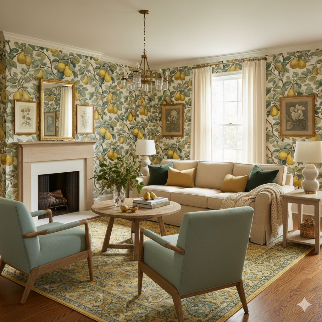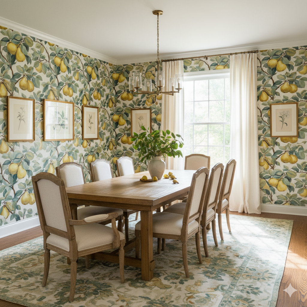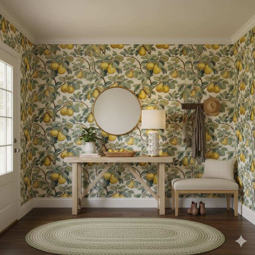 Lush pear branches with golden-yellow fruit and cool green leaves adorn this classic orchard-inspired pattern. Each detail feels hand-painted, echoing vintage botanical prints while radiating abundance and warmth. This wallpaper is perfect for farmhouse kitchens, breakfast nooks, or dining spaces, pairing beautifully with rustic woods and natural stone.
