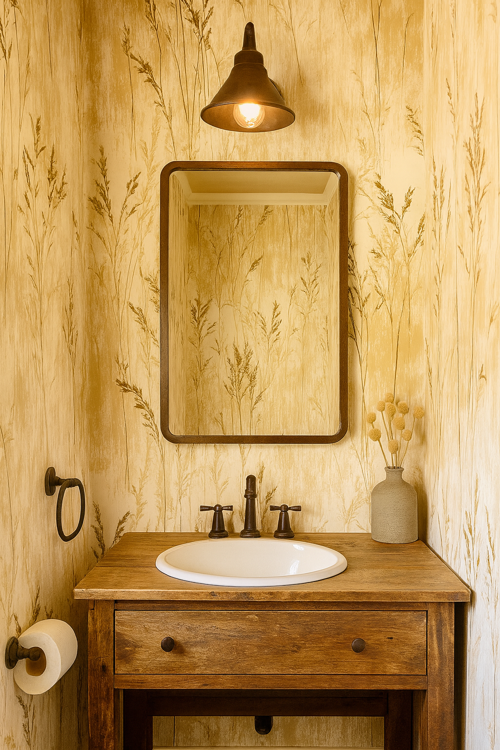 Channel windswept prairies with Golden Swayfield, a graceful vertical design of tall meadow grasses painted in gentle gold and wheat tones over a neutral base. This painterly pattern has subtle movement and organic rhythm, evoking dried flora swaying in breeze. Ideal for modern rustic living rooms, nature-inspired hallways, or country cottage retreats, it brings grounded warmth and texture.