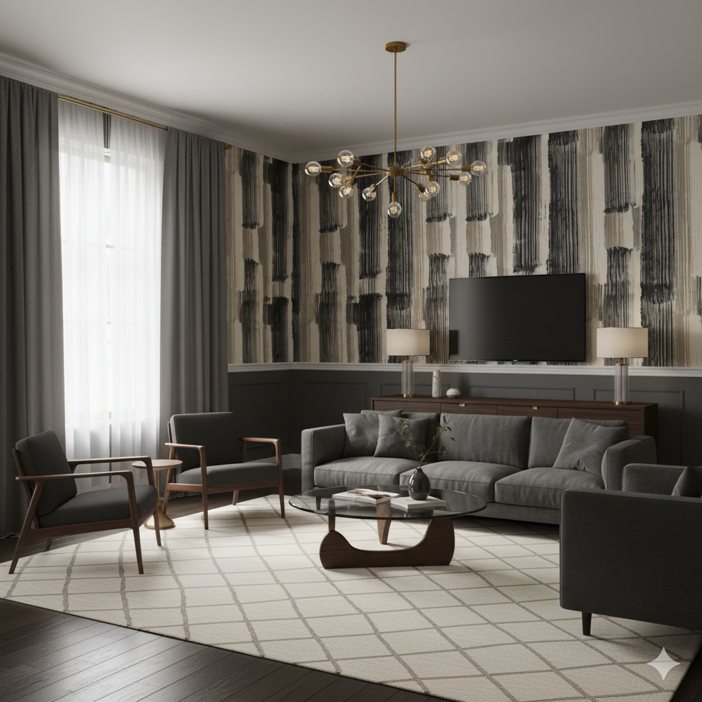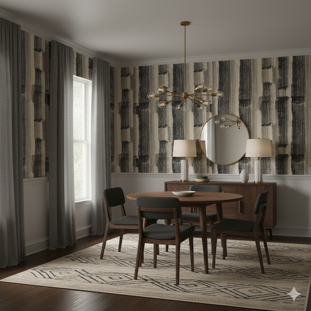 Raw, rhythmic, and moody, Gravit Noir feels like an artist’s canvas stretched between modern abstraction and elemental design. Vertical sweeps of charcoal, sand, and black drift into one another, evoking movement in stone, wind, and ink. The visual layering creates depth and dimension while maintaining neutrality. It’s ideal for high-impact, low-clutter spaces—urban lofts, contemporary offices, or dining areas craving texture over pattern. Gravit Noir is a study in subtle drama: bold in presence, timeless in tone.
