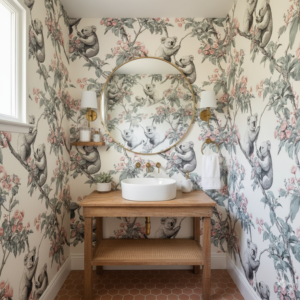 Delicate engravings bring koalas to life as they perch within eucalyptus trees blooming with pink blossoms. The finely hatched linework balances naturalistic detail with vintage charm, like illustrations pulled from an old naturalist’s field guide. The limited palette of gray, blush, and cream makes the composition soothing, with just enough color to enliven the scene. This wallpaper works beautifully in nurseries, libraries, or cozy reading nooks, where its mix of nostalgia and tenderness adds warmth. Pair with muted pastels, soft textiles, or heritage furniture for a space that feels gentle and grounded.