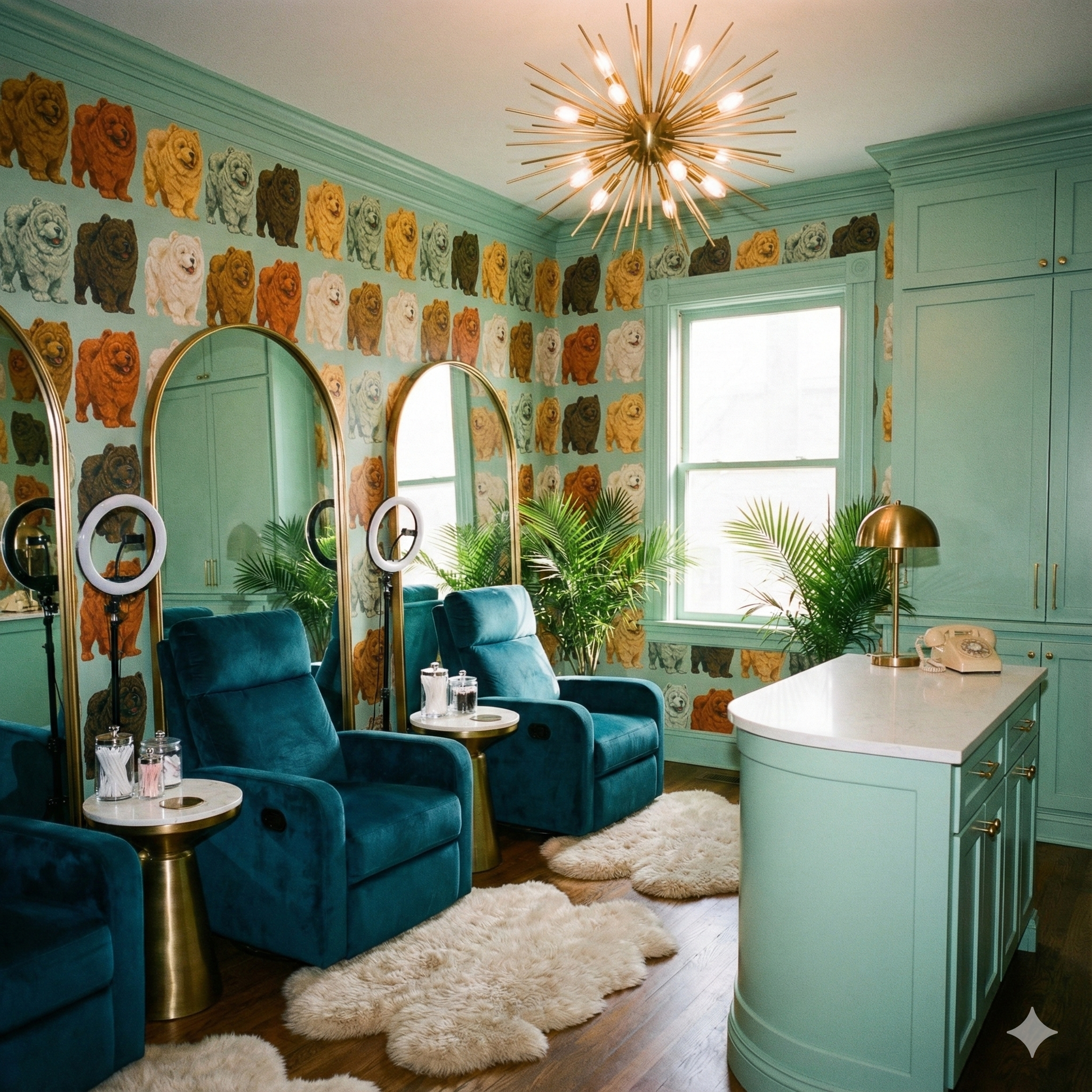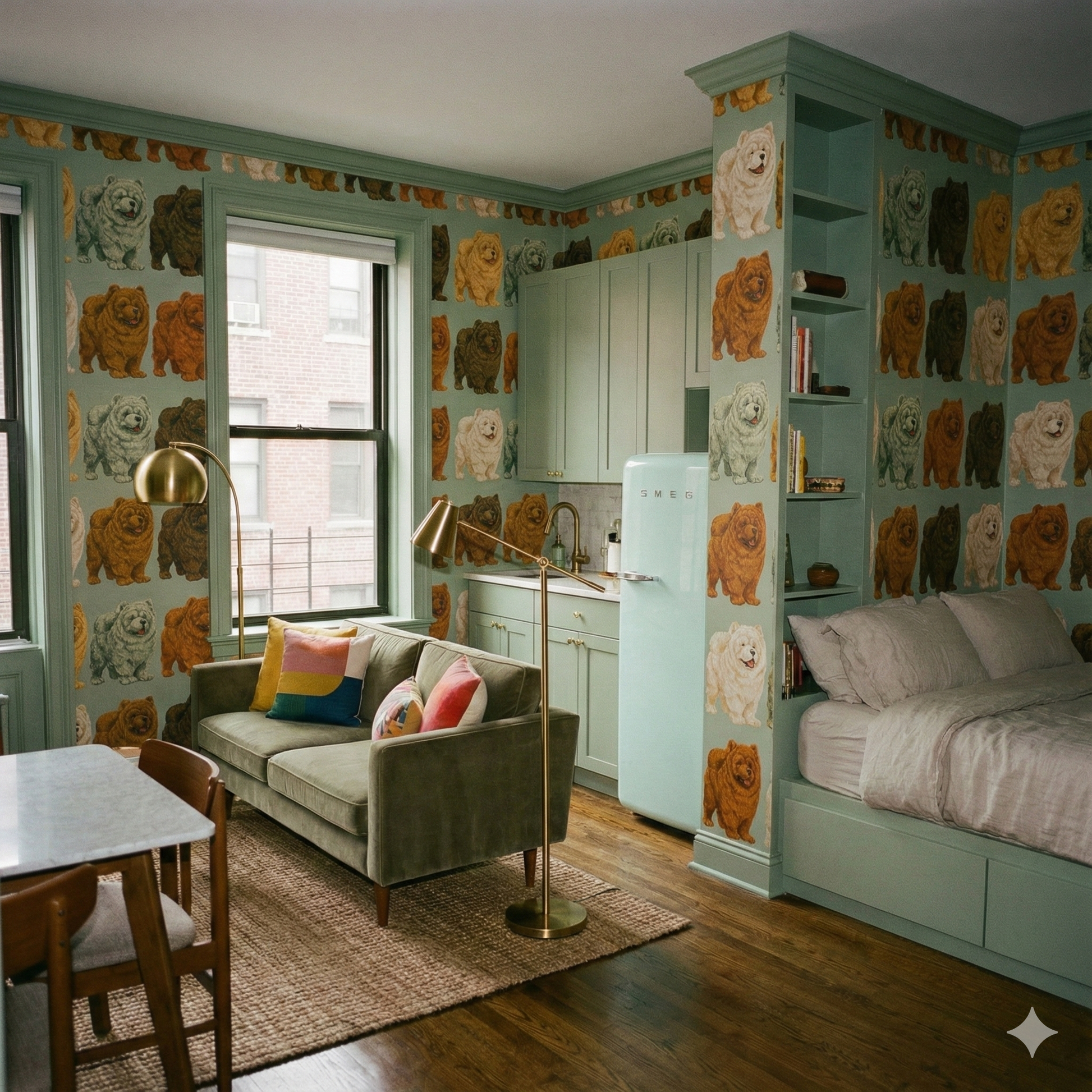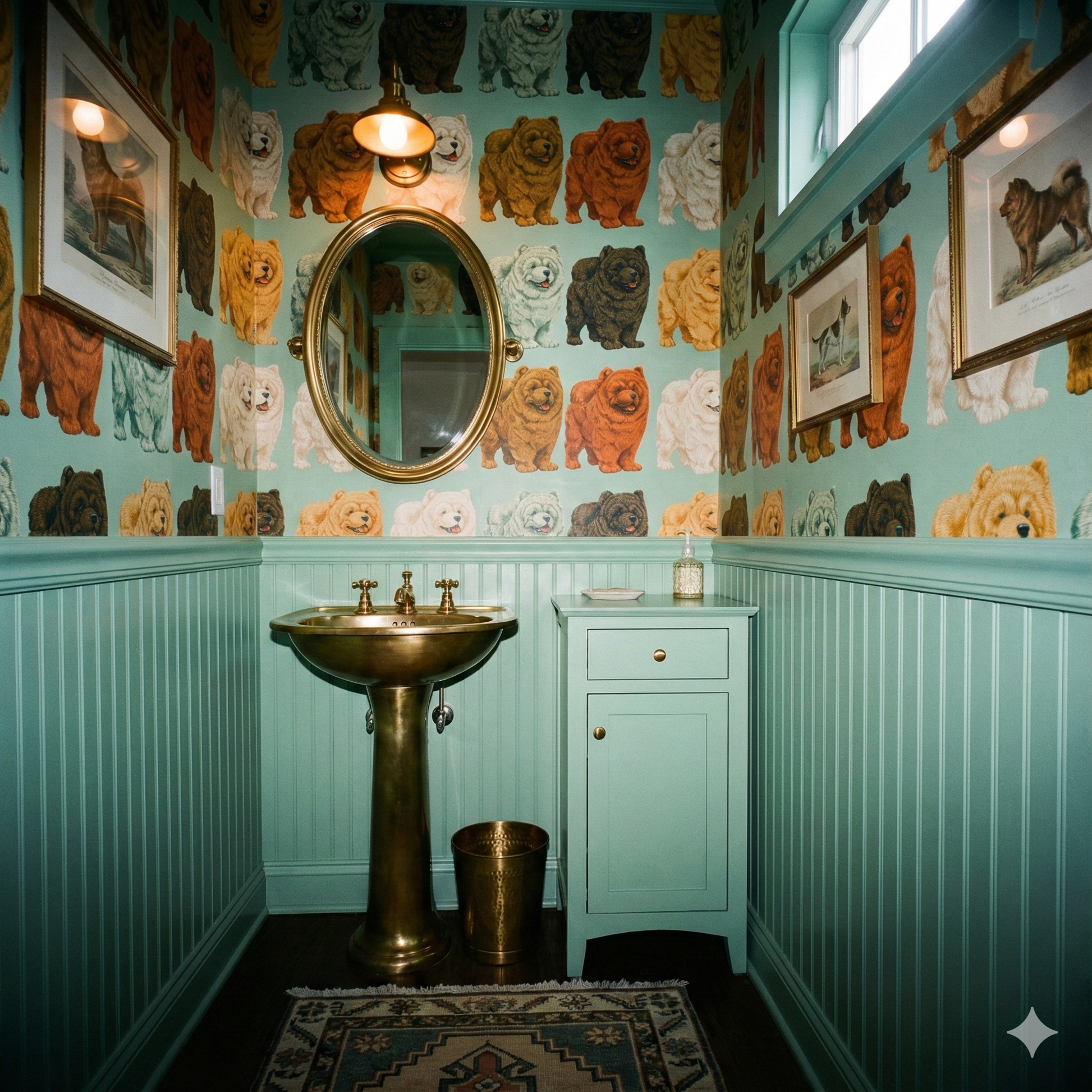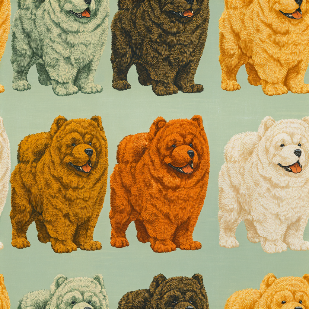 Lush yet disciplined, Halston Grove celebrates the iconic Chow Chow with bold color blocking and sharp ink texture. Vibrant shades of rust, amber, and ivory stand out against a muted celadon-green background, creating a composition that feels both pop and heritage-inspired. The repetition of plush, rounded forms gives the design sculptural rhythm — tactile and endearing without slipping into nostalgia. This wallpaper thrives in eclectic spaces, children’s rooms with vintage flair, or even boutique cafes where personality meets polish. Halston Grove feels like high design with a smile — modern maximalism through a heritage lens.