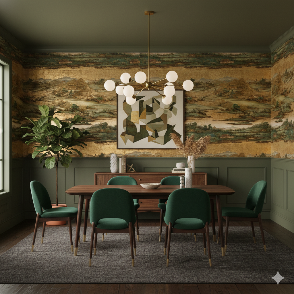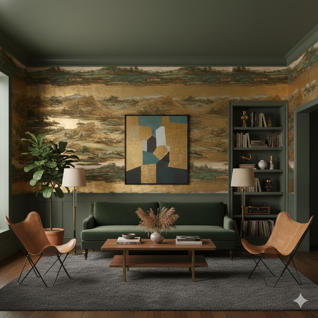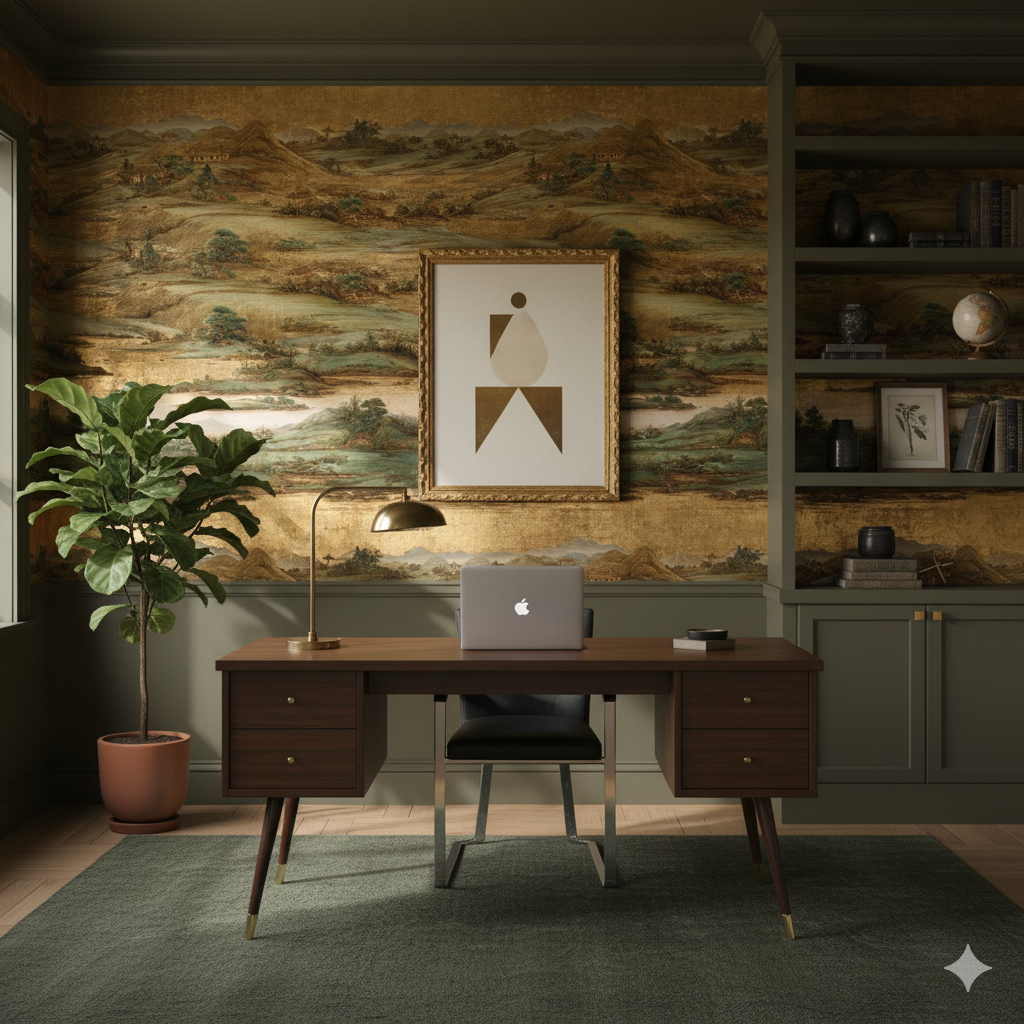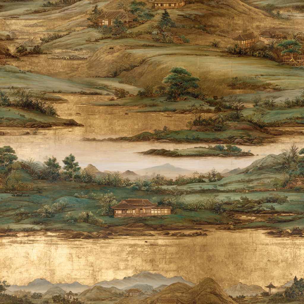 Han River Scroll channels the grandeur of Korean landscape painting through sweeping panoramic detail and gilded undertones. Rolling hills, quiet temples, and reflective waters unfold in rhythmic layers of sage, bronze, and muted celadon. The scene reads like a living mural—majestic yet meditative—making it ideal for statement walls, gallery corridors, or boutique hotels. The gold-leaf impression adds a sense of heritage and opulence without overwhelming, grounding the design in cultural storytelling and painterly grace.