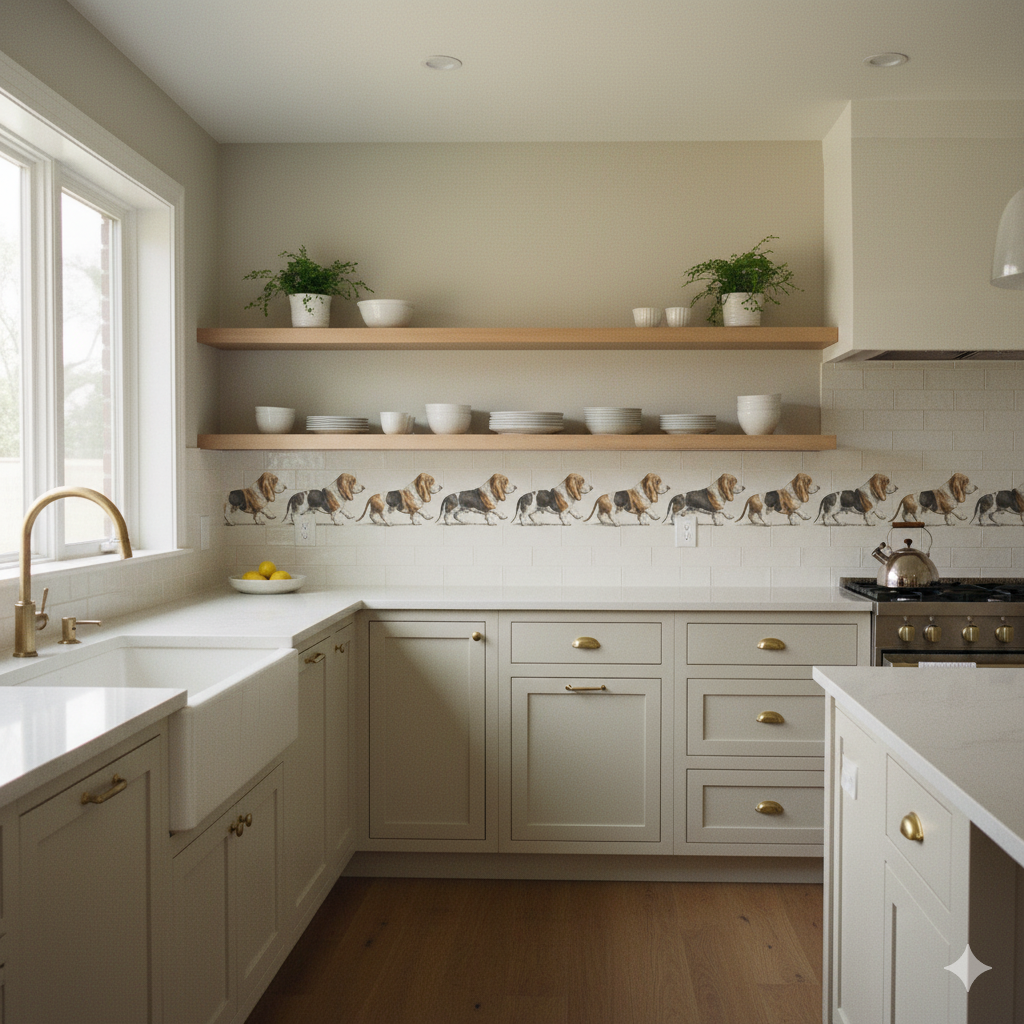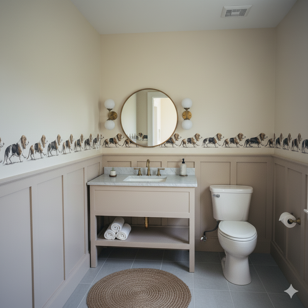 Whimsical yet sophisticated, Harlow Parade celebrates the unmistakable charm of the Basset Hound. Rendered in exquisite illustrative detail, each dog trots nose-to-tail across a warm cream background, forming a playful linear repeat that’s equal parts humorous and refined. The simplicity of the composition gives it unexpected versatility — perfect for mudrooms, children’s spaces, or eclectic hallways. Harlow Parade carries the wit of British wallpaper tradition while maintaining the minimalist sensibility of modern design, infusing any space with warmth and quiet personality.