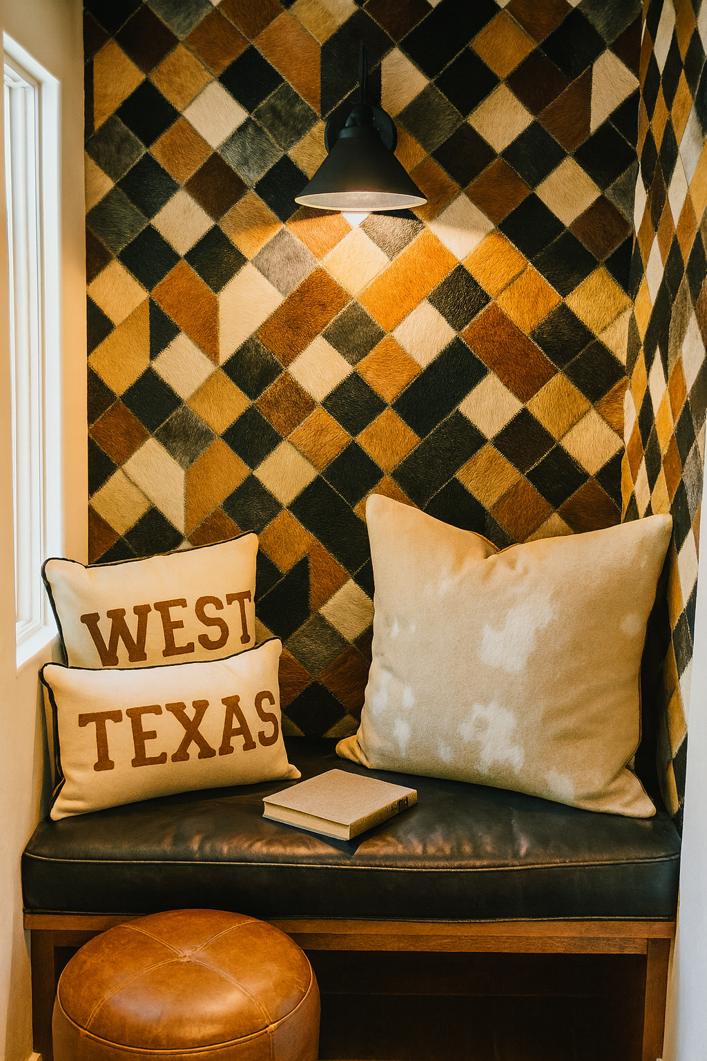 A luxe patchwork of faux hide textures arranged in a tight diamond grid, featuring shades of chestnut, ivory, charcoal, and grey. Each square mimics stitched leatherwork with ultra-realistic fur detailing, making it perfect for Western lodges, upscale ranch homes, or modern rustic spaces. This wallpaper brings the richness of hide rugs to your walls—no cows harmed, all style delivered.