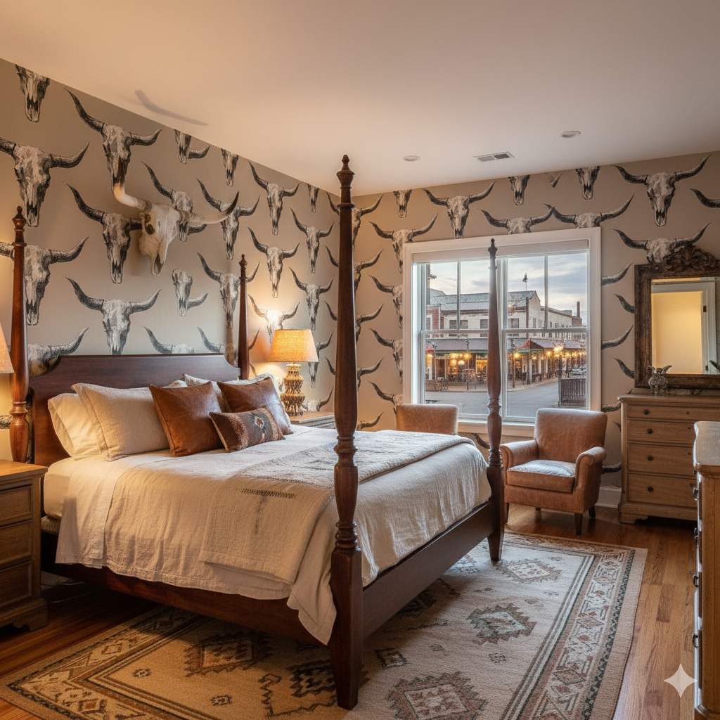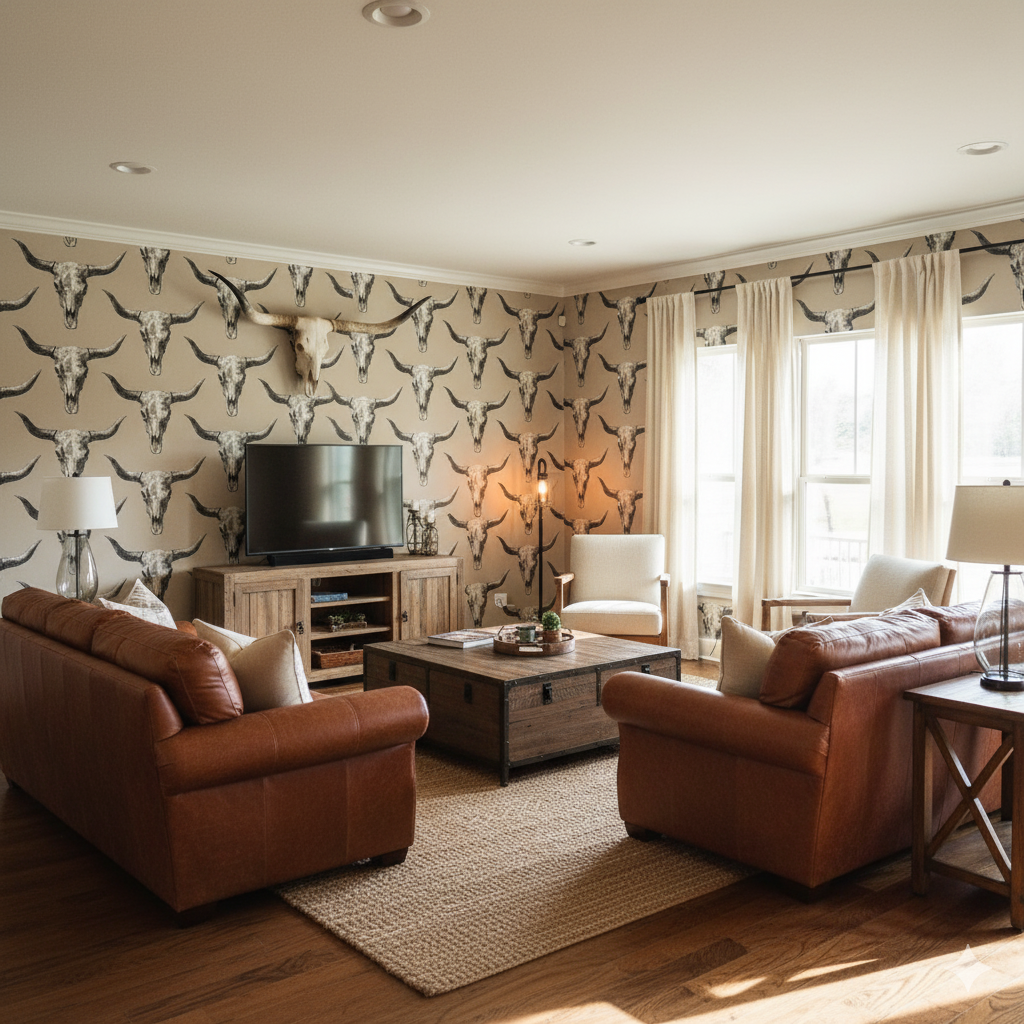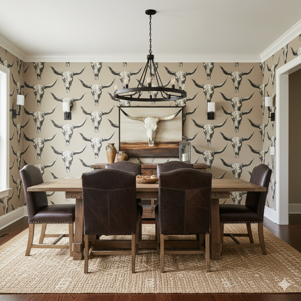 Here, oversized longhorn skulls dominate the repeat, their sweeping horns rendered in meticulous pen-and-ink detail. The sandy beige backdrop enhances the raw, weathered quality of the imagery, nodding to desert landscapes and old cattle trails. This design carries a rugged, masculine edge, ideal for a lodge-style den, a whiskey bar corner, or a Western-themed dining room. The skull motif leans into Americana heritage while maintaining an artistic, almost tattoo-like linework, making it versatile in both modern cowboy aesthetics and eclectic Southwestern interiors.