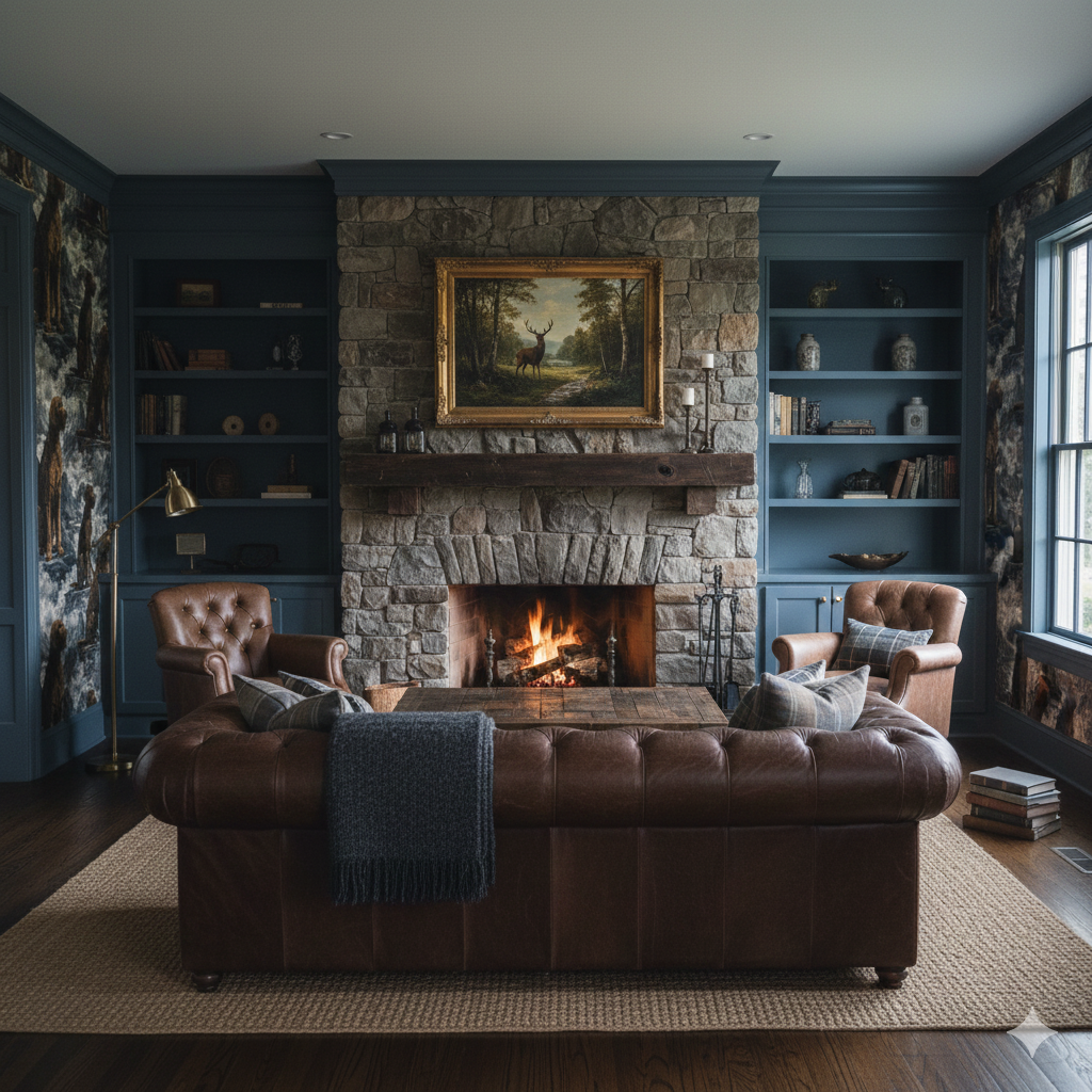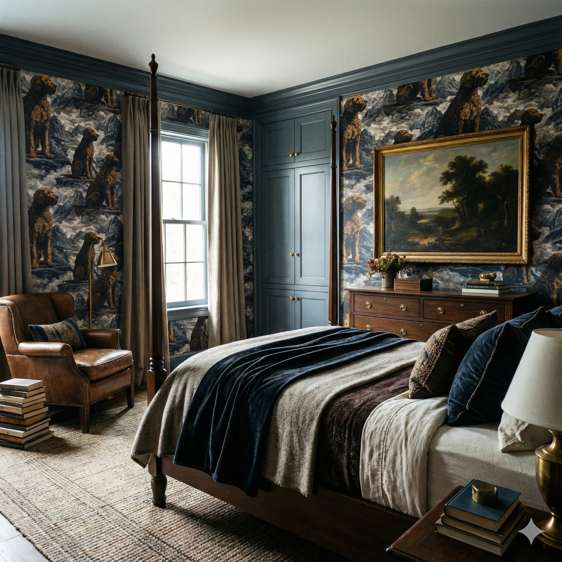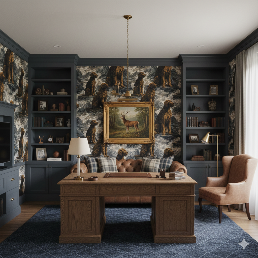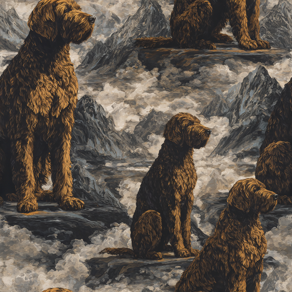A stately scene unfolds among storm-hued peaks and low drifting clouds — deep brown, near mahogany-coated dogs sit like ancient sentinels overlooking a mountain pass. Their wiry coats, painted with deliberate texture, evoke the rugged endurance of alpine life. Shades of burnt sienna and iron gray intermingle with soft mist and rock tones, forming a palette both grounded and austere. “Highvale Keeper” feels less like décor and more like a visual hymn to loyalty and landscape — a mural that belongs in a mountain lodge, rustic retreat, or study lined with leather-bound books and stone hearth warmth. It carries the quiet dignity of the outdoors and the spiritual calm of solitude.