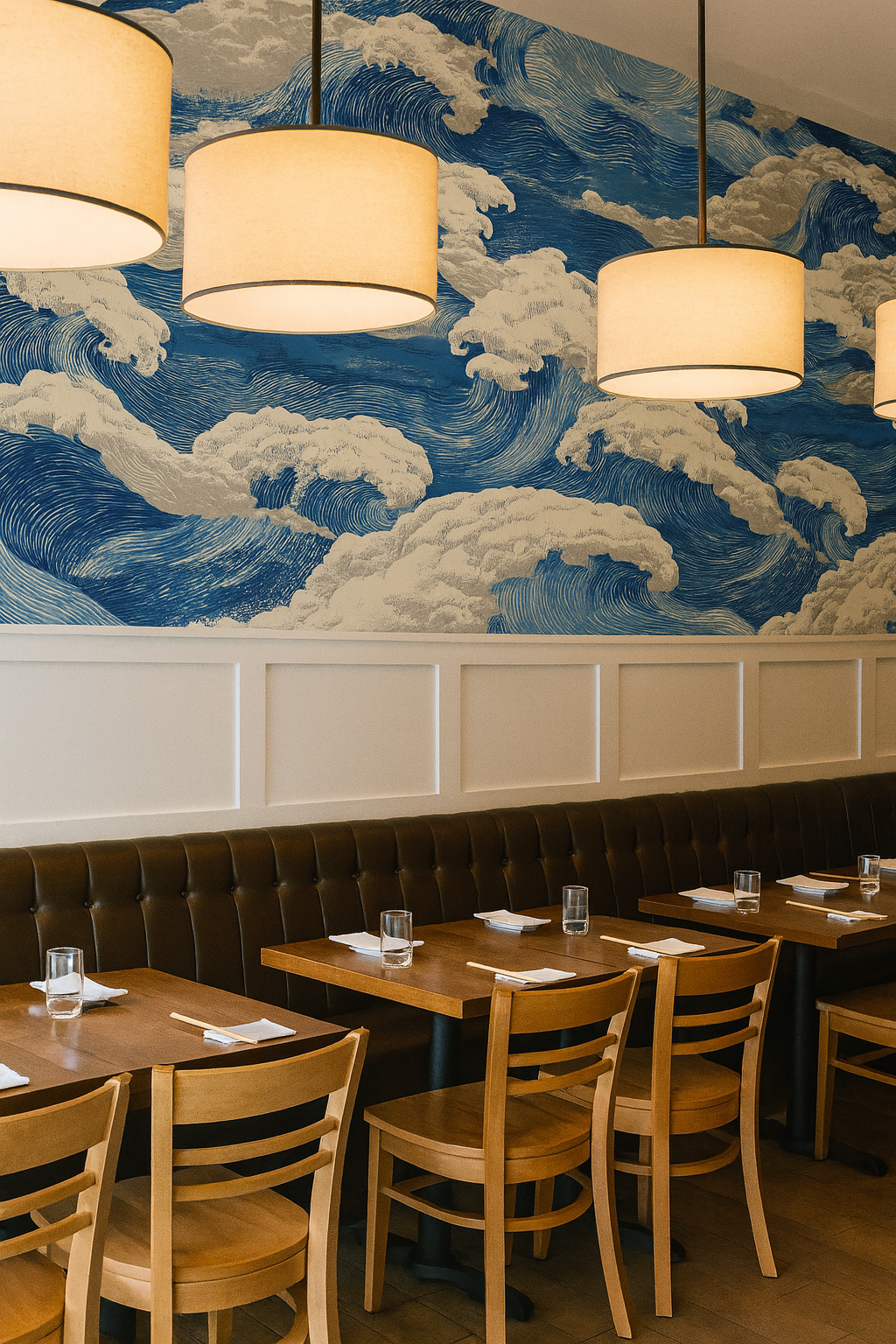 With dramatic, woodblock-inspired energy, this pattern channels Japanese ukiyo-e prints—particularly the movement of ocean waves and curling clouds. The deep indigo blue contrasts sharply against foamy whites, emphasizing rhythm and tension. Perfect for maximalist coastal or heritage-inspired themes.