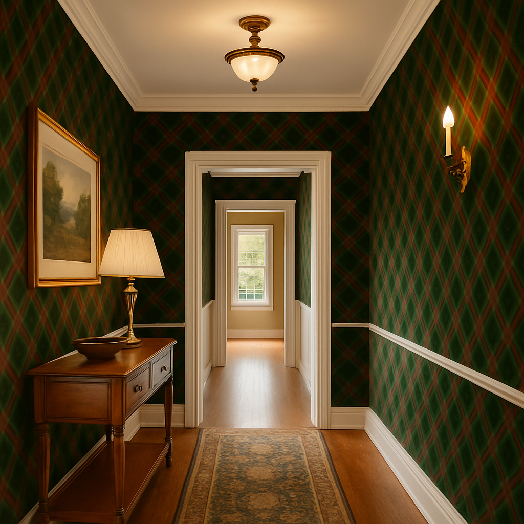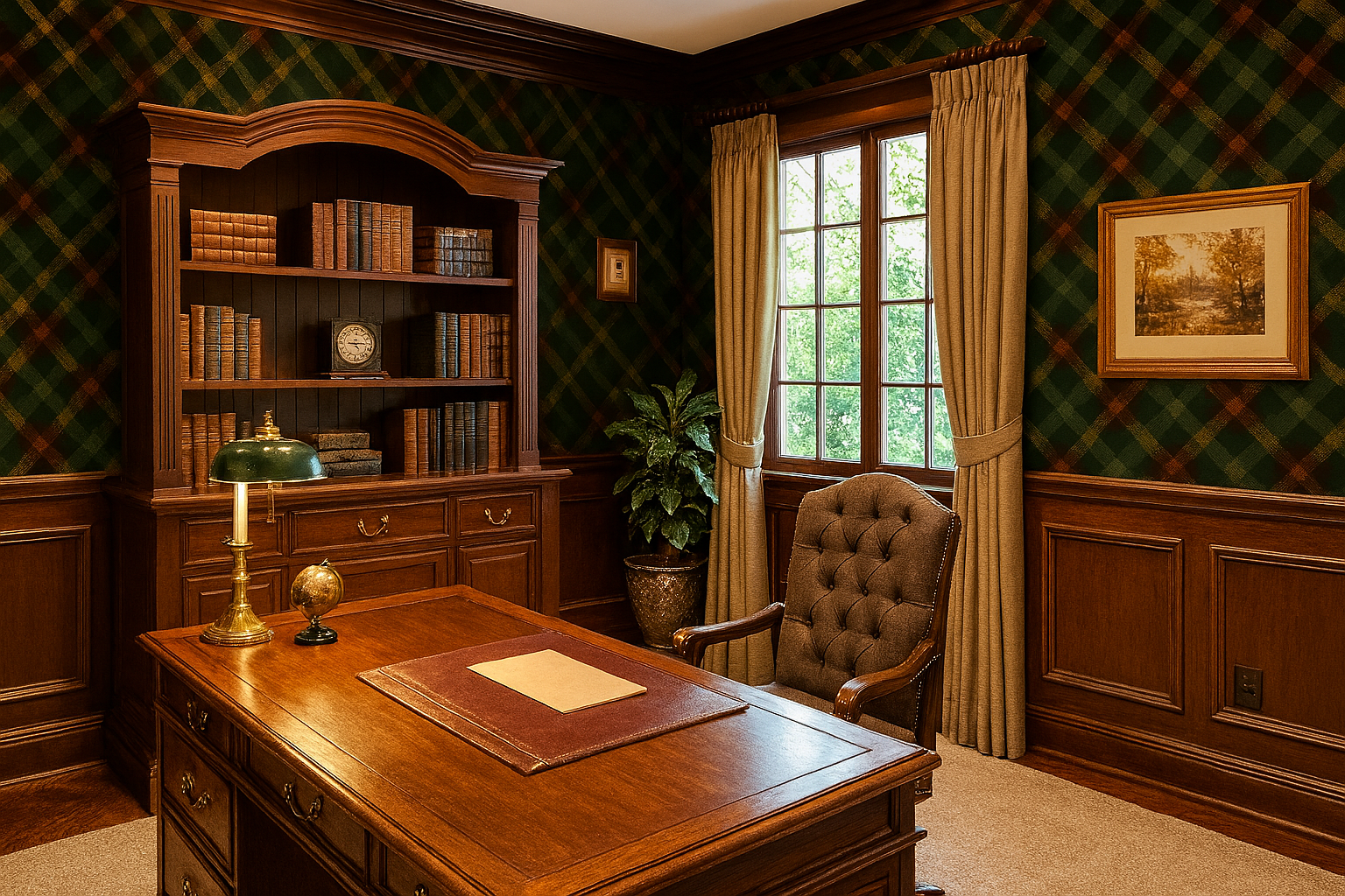 A timeless classic plaid in deep forest green, navy, and beige, this pattern channels equestrian clubs and country estates. The symmetrical balance and rich tones make it perfect for a masculine study, heritage dining room, or a preppy, layered interior.