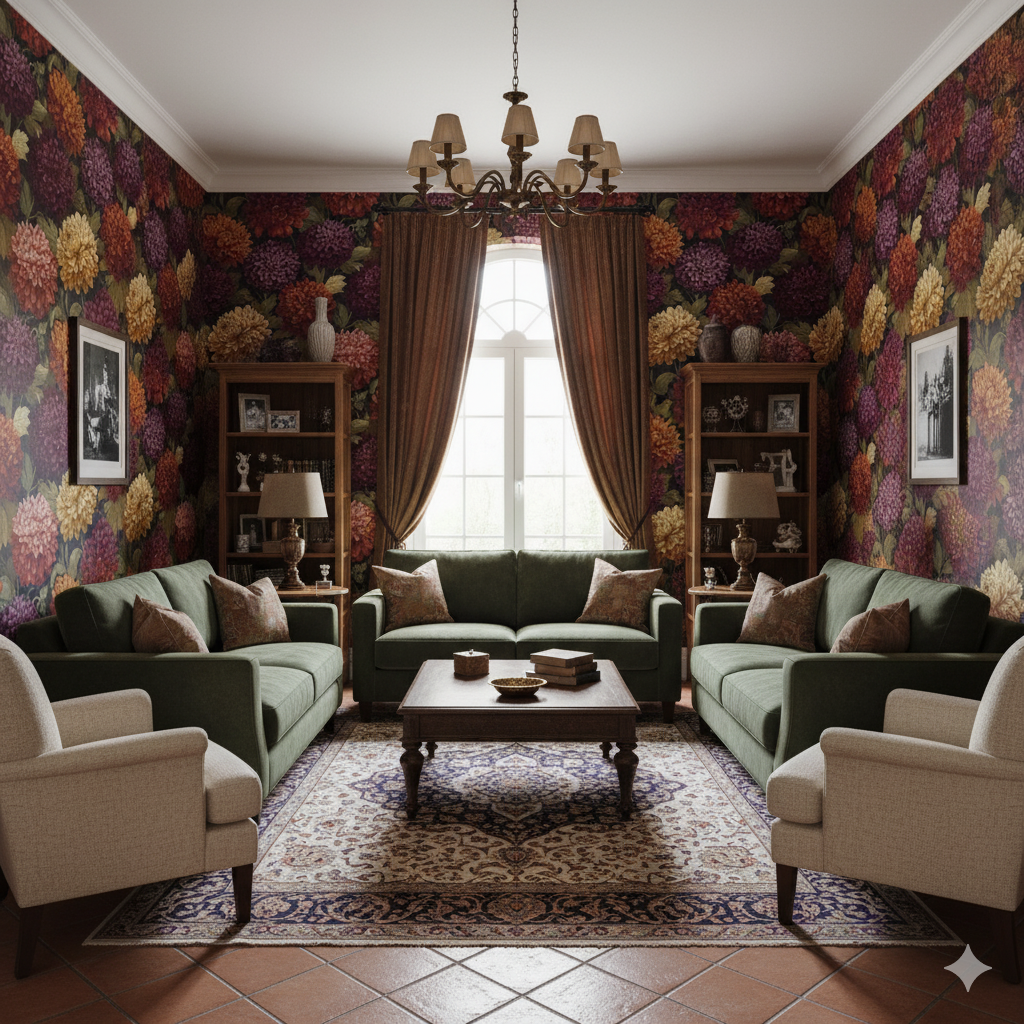 Oversized chrysanthemums in jewel tones—plum, marigold, crimson, and garnet—burst across a dark background, their dense petals layered like fireworks in bloom. The richness of the palette and scale gives the design a sense of drama and opulence, recalling traditional Japanese florals and Victorian garden illustrations alike. Imperial Bloom is perfect for creating a moody, maximalist statement wall in a dining room, parlor, or boutique hotel setting. When paired with velvet upholstery, brass fixtures, and dark wood furniture, it transforms a space into a lush, decadent retreat.