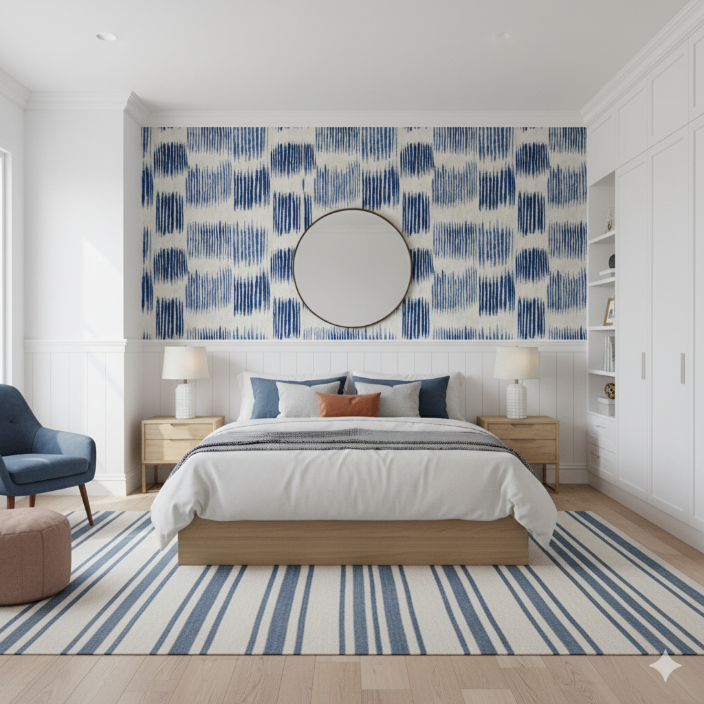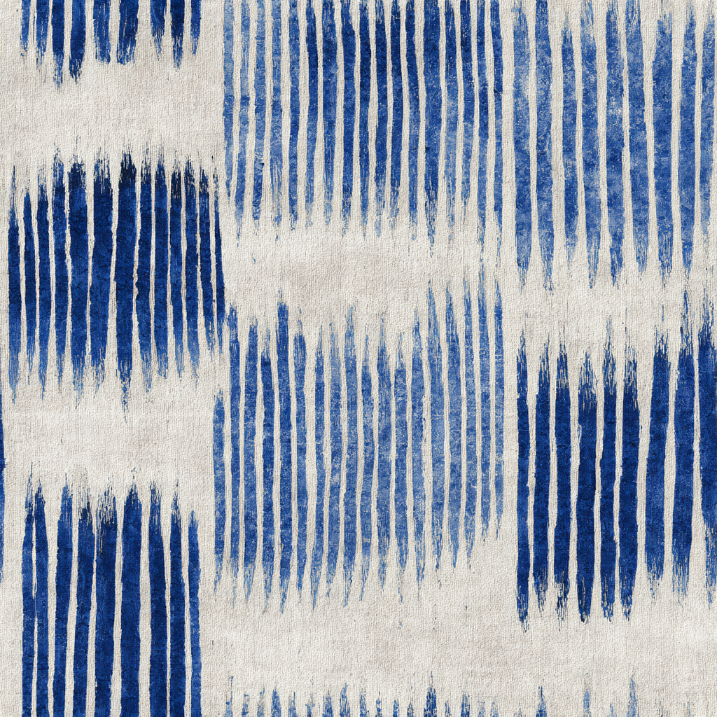 Indigo Vale captures the meditative pulse of hand-painted indigo cloth, transforming repetition into rhythm. Cascading brushstrokes fade from deep cobalt to sky blue, each mark carrying the imperfect beauty of a human touch. The texture mimics washed linen, evoking coastal calm and artisanal craft. This design brings understated depth to bedrooms, beach homes, or minimalist spaces craving organic pattern and tonal serenity.