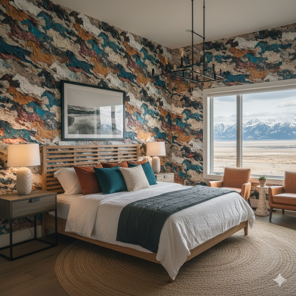 Iron Canyon captures the primal power of motion through raw impasto texture and sculptural pigment. Horses surge across the surface like carved reliefs, their bodies formed from thick strokes of terracotta, indigo, charcoal, and clay. The palette feels sunbaked and elemental, a meeting of desert dust and untamed energy. This design is ideal for spaces that crave bold materiality — think lodge-style great rooms, creative studios, or contemporary interiors where walls should feel alive. Iron Canyon bridges fine art and frontier spirit, offering texture you can almost feel beneath your fingertips.