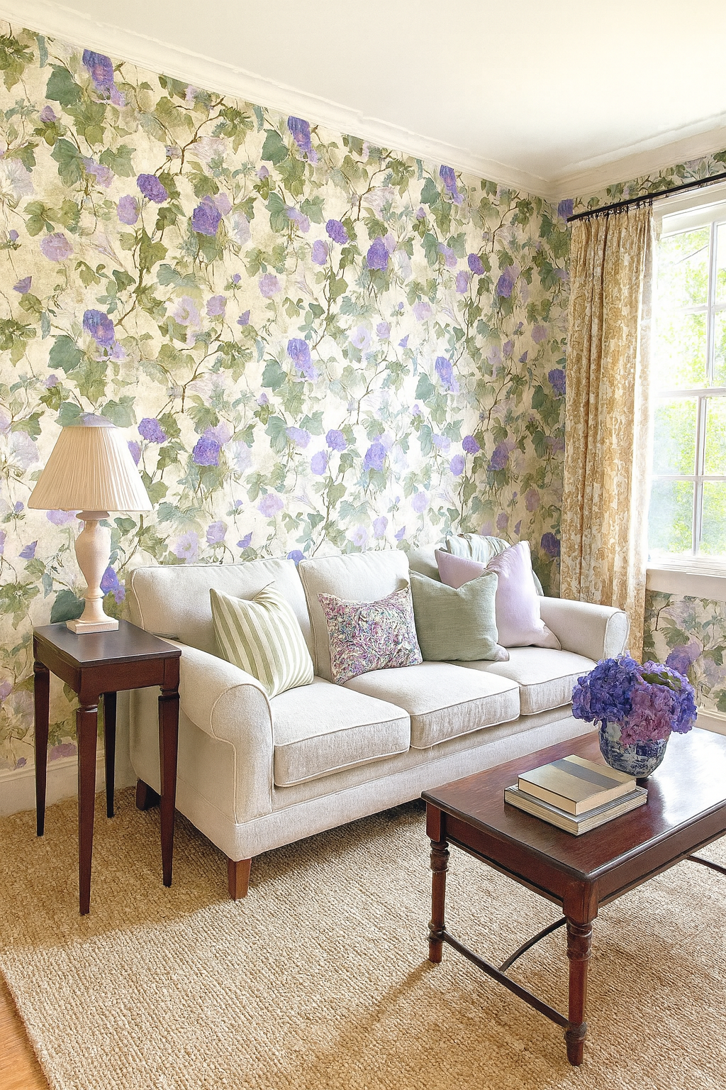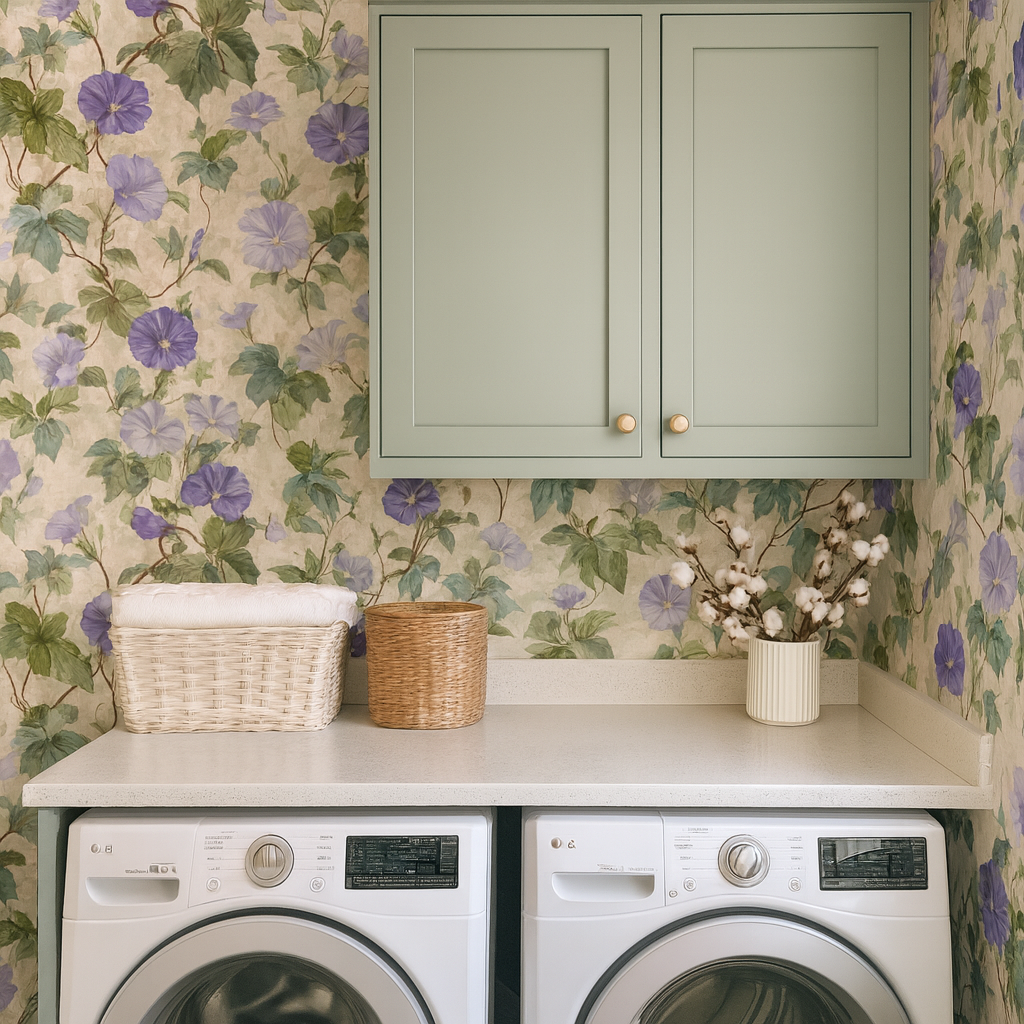 A lush tangle of morning glories in lavender and violet climbs through painterly ivy vines over a parchment-style stone background. Ivy & Amethyst feels both aged and alive—ideal for garden rooms, English conservatories, or romantic entryways that call for subtle color and flowing movement.