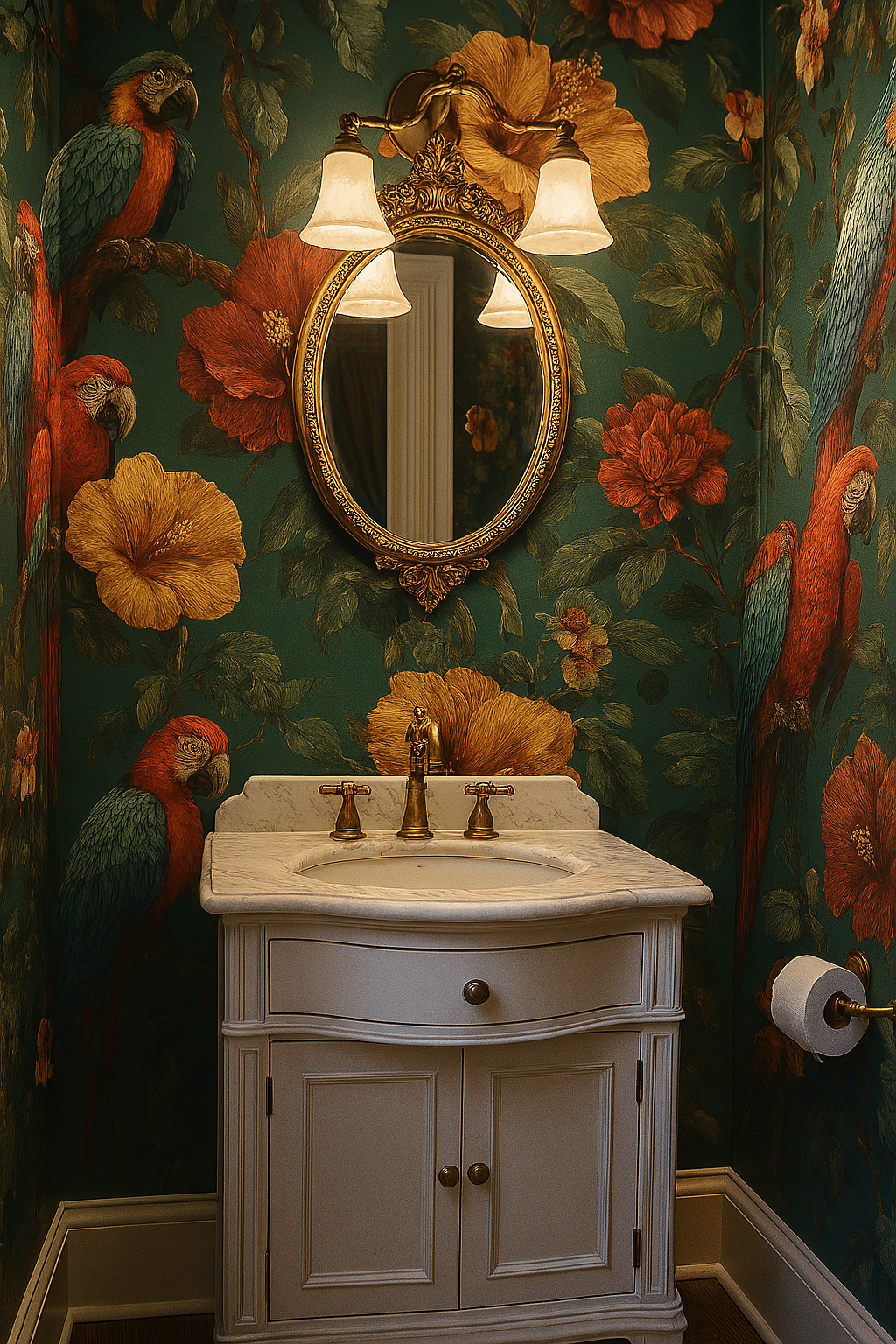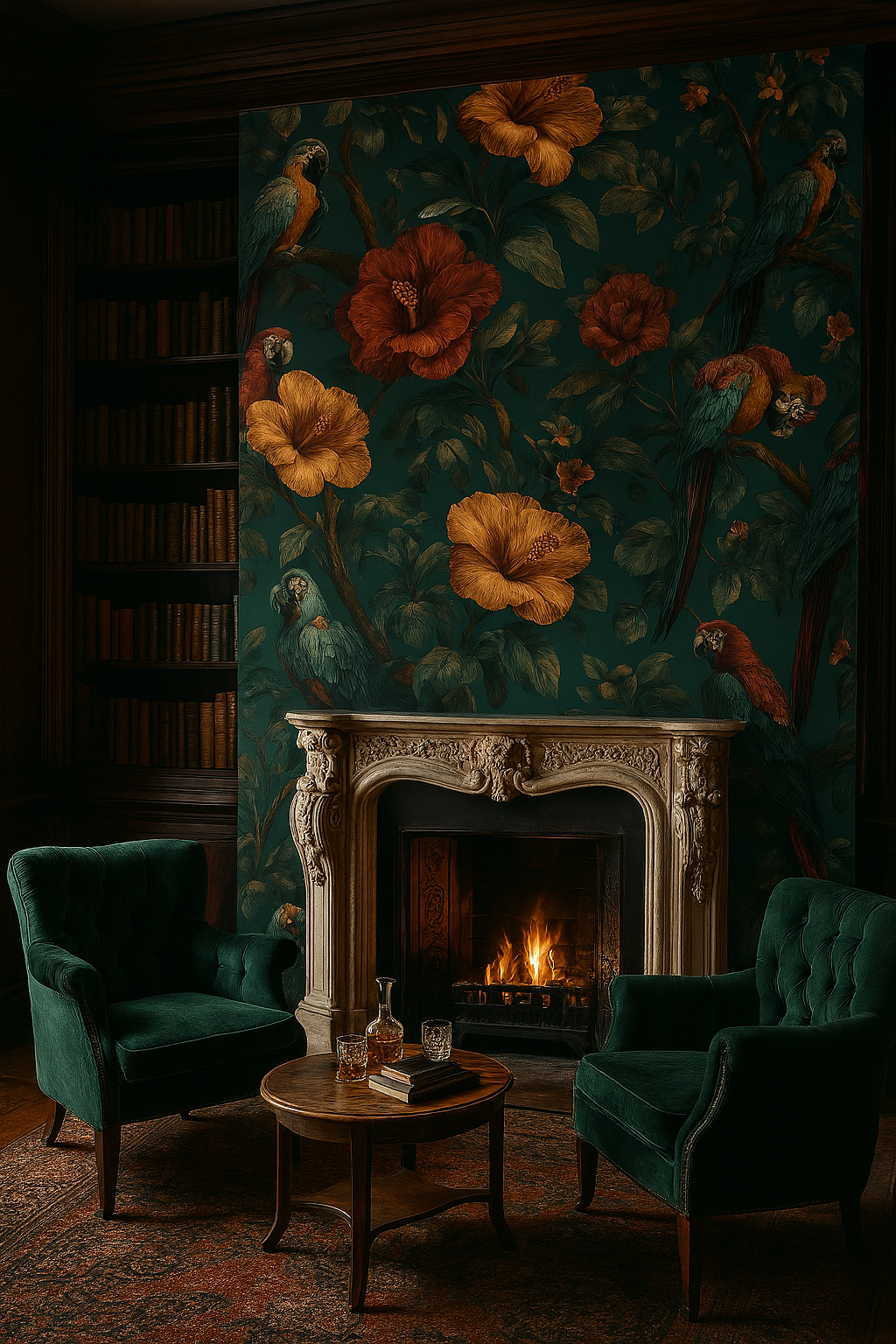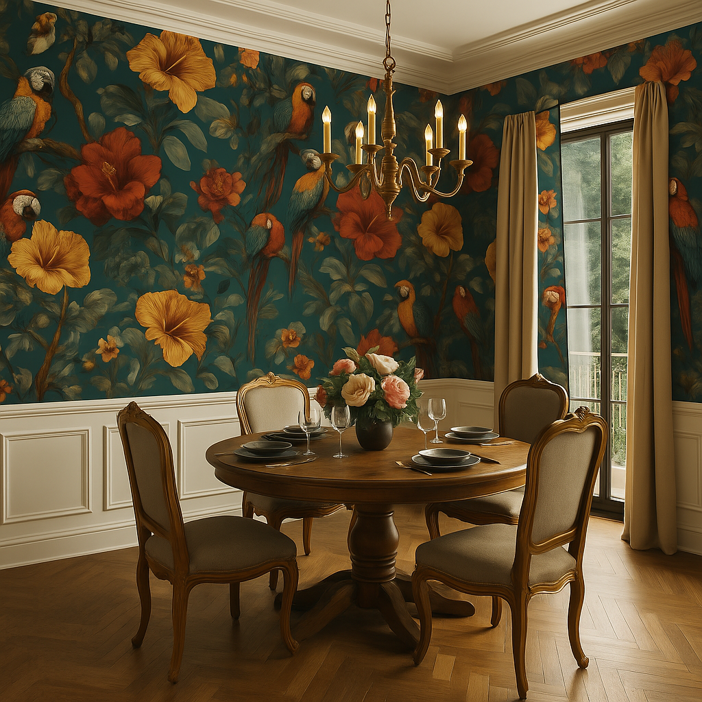 Step into a painted rainforest with Jungle Tapestry, where parrots perch among giant hibiscus blooms in vintage golds and reds. A deep teal background adds mood, while the lush pattern creates the feeling of a storybook jungle wrapped in velvet. Ideal for maximalist living rooms, tropical lounges, or bold powder rooms—it’s a little wild, a little regal, and totally unforgettable.