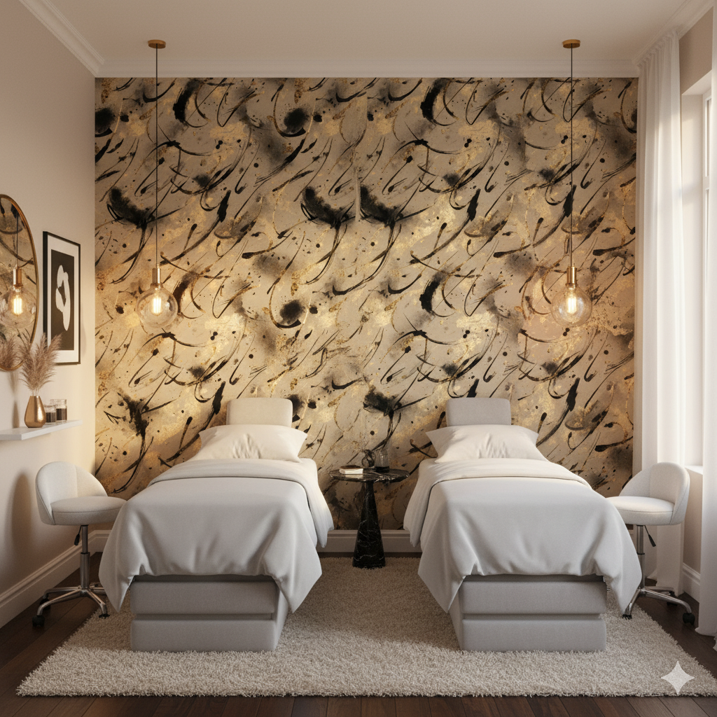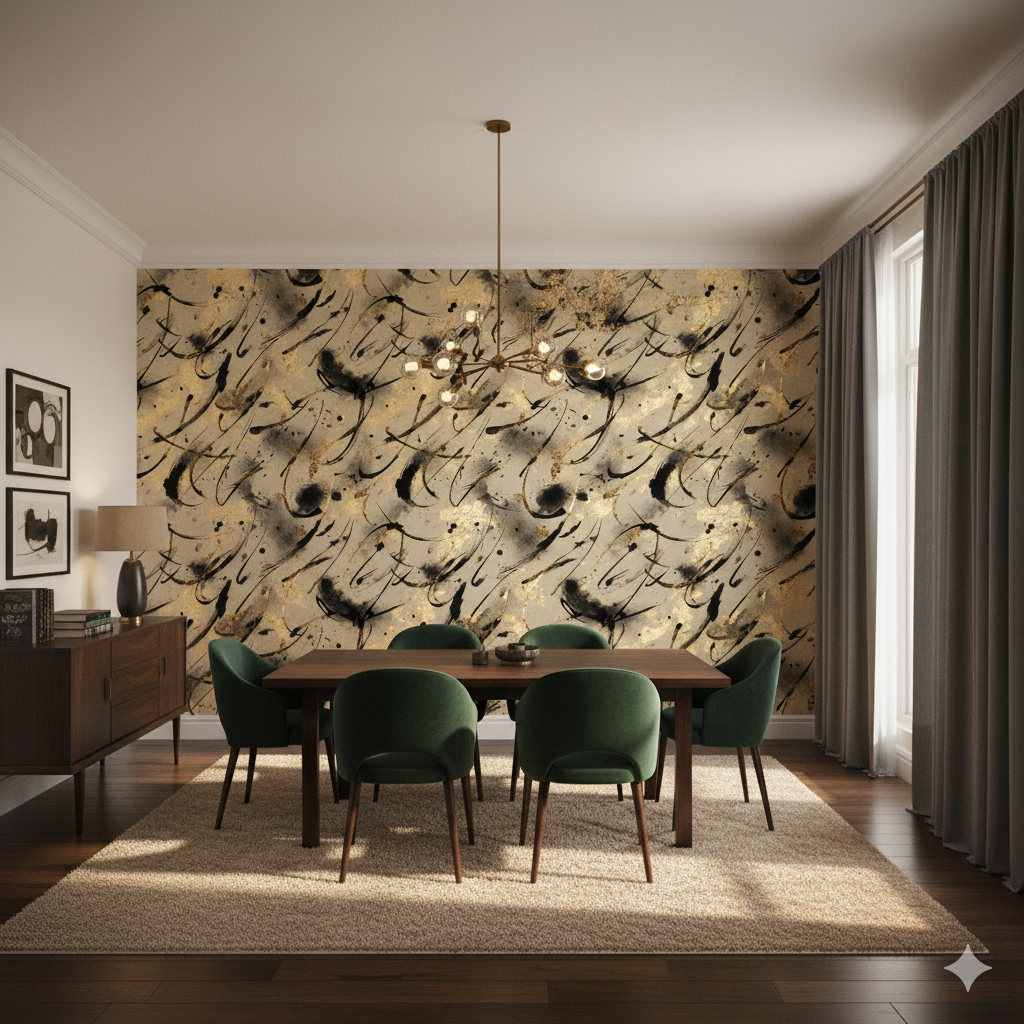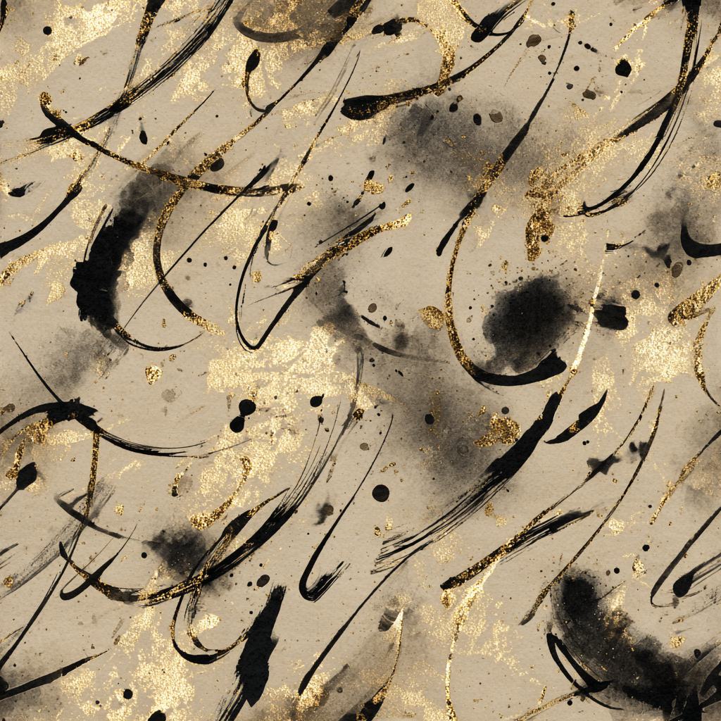 This abstract design brims with movement — black ink-like swirls and splatters tumble across a warm taupe ground, accented with flecks and streaks of radiant gold. It feels improvisational, like a jazz composition made visual, where energy flows freely yet with deliberate rhythm. The painterly gestures create an urban, contemporary edge, yet the metallic highlights elevate it into something chic and glamorous. Ideal for creative studios, cocktail bars, or eclectic living rooms, this wallpaper makes a statement of artistic boldness, channeling both chaos and elegance in equal measure.