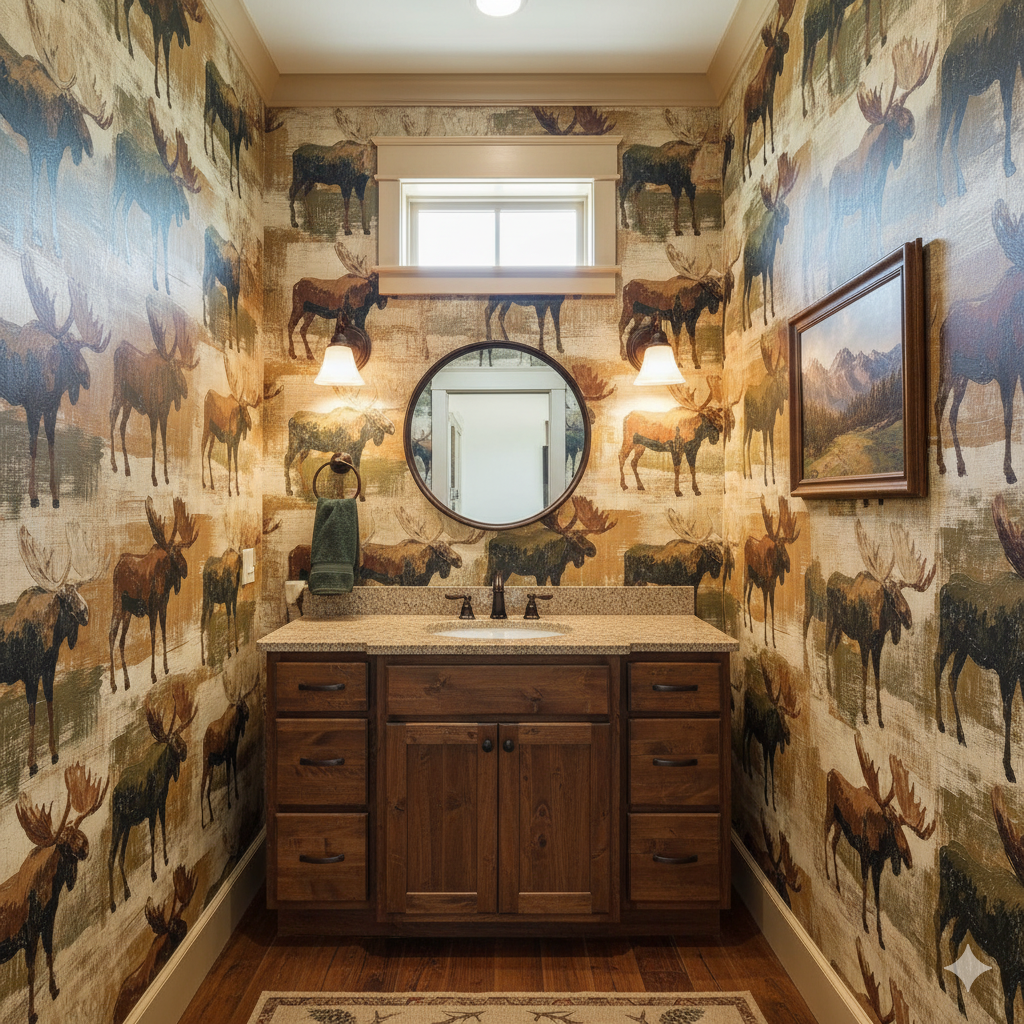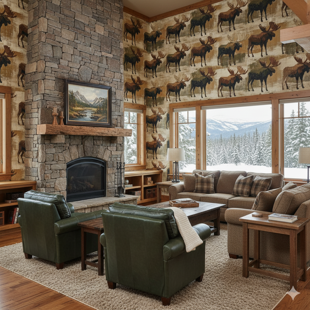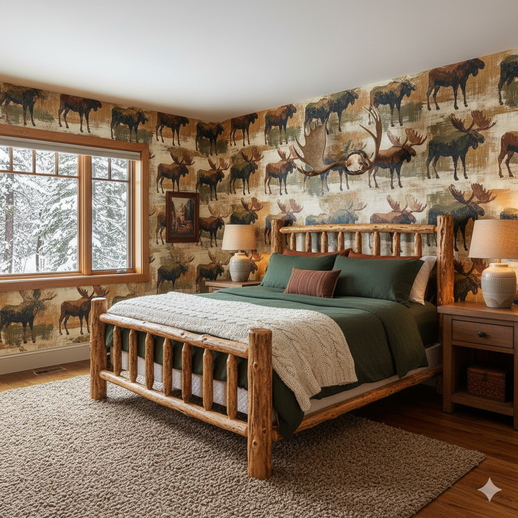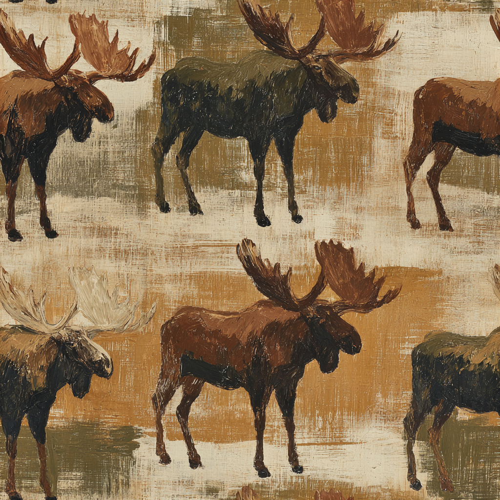 Kingsley Range brings a stately wilderness energy into the home — a tribute to northern forests and the raw, untamed strength of nature. Rich painterly moose silhouettes stride across a backdrop of ochre, tobacco, and weathered bark tones, each stroke intentionally layered to mimic the texture of oil on canvas. There’s a rugged sophistication to it — masculine yet timeless, earthy yet artistic. Perfect for lodges, cabins, and modern rustic spaces that crave warmth and depth, this wallpaper pairs beautifully with dark wood, antler accents, and leather furnishings. It evokes autumn hikes and crackling fires, blending natural strength with an art collector’s sensibility.