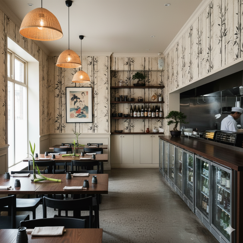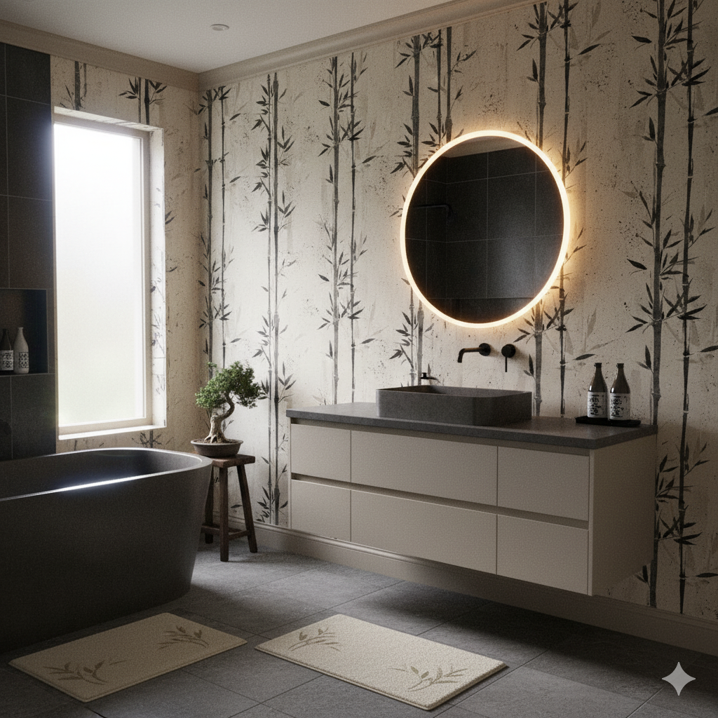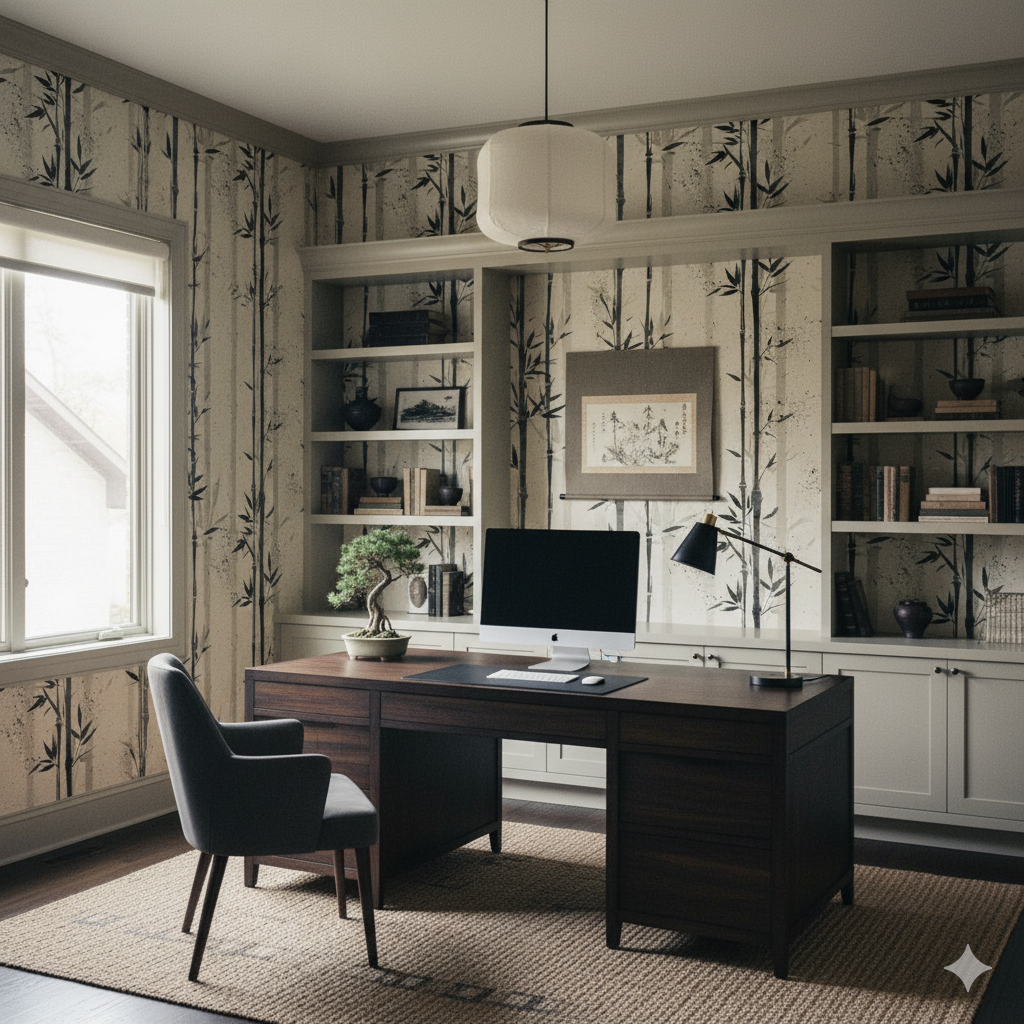 Kyoto Reed draws inspiration from traditional Japanese sumi-e ink painting, capturing vertical bamboo stalks with a minimal, meditative energy. Layers of black and soft gray ink appear to bleed naturally into the parchment-like backdrop, giving the design a sense of depth and quiet movement. This wallpaper embodies restraint and calm—ideal for spa bathrooms, Zen-inspired living spaces, or minimalist interiors. It pairs perfectly with pale woods, neutral textiles, and warm lighting to create a sanctuary-like atmosphere.
