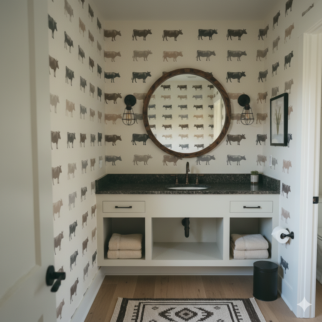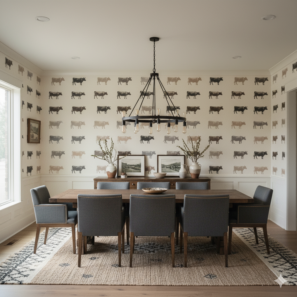 Laramie Row brings rustic repetition into a design of modern serenity. Silhouettes of grazing cattle march in orderly procession across a pale parchment ground, their tones fading gracefully from espresso to soft clay and sand. There’s a nostalgic comfort in its simplicity — an homage to the cadence of open fields and early ranch etchings. This wallpaper carries an understated western rhythm perfect for entryways, living rooms, or children’s spaces where storybook charm meets mature design sensibility. Laramie Row pairs effortlessly with tan leather, ivory upholstery, and natural oak accents, striking a balance between warmth and restraint.