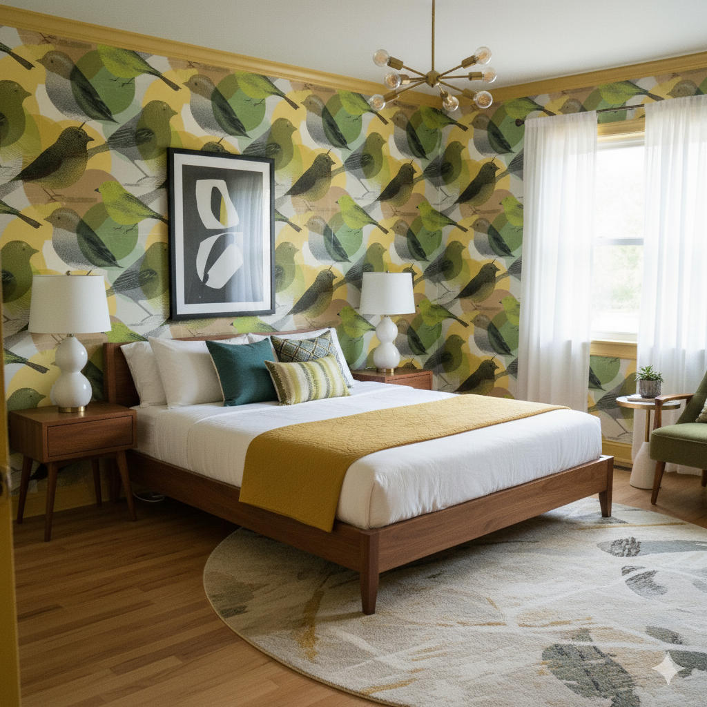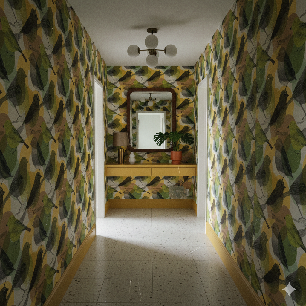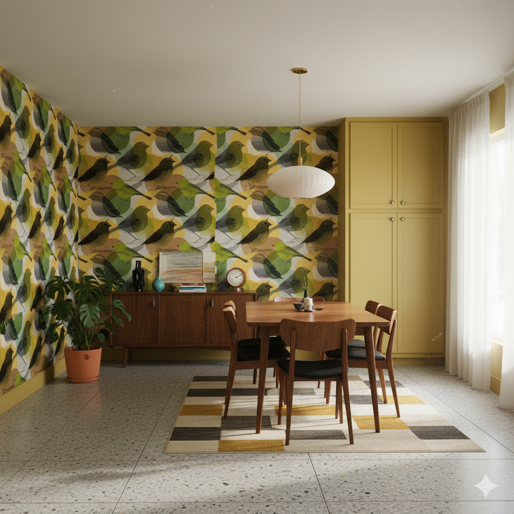 Larkshade layers translucent shapes of olive, amber, and moss in a rhythmic interplay of abstract bird silhouettes. The halftone detailing gives it a nostalgic nod to mid-century printmaking, while the overlapping forms add depth and motion. The result feels like sunlight filtering through branches — soft, graphic, and quietly alive. Larkshade brings a grounded vibrancy to creative studios, reading nooks, or contemporary kitchens, pairing beautifully with light oak, black steel, or botanical accents. It’s an ode to organic rhythm — a harmony between form, texture, and the calm intelligence of nature translated through modern design.