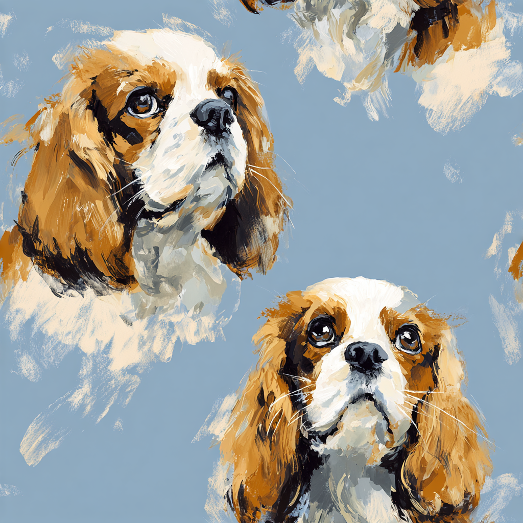 Larkspur Blue radiates charm through painterly softness — expressive brushstrokes bring to life the gentle face of the Cavalier King Charles Spaniel against a muted cornflower blue ground. Each portrait carries warmth and devotion, as though painted in oil by a loving hand. The palette of chestnut, cream, and powder blue lends calm and sentimentality, ideal for nurseries, cozy parlors, or pet-centric interiors. Larkspur Blue is both classic and whimsical — art and affection, side by side.