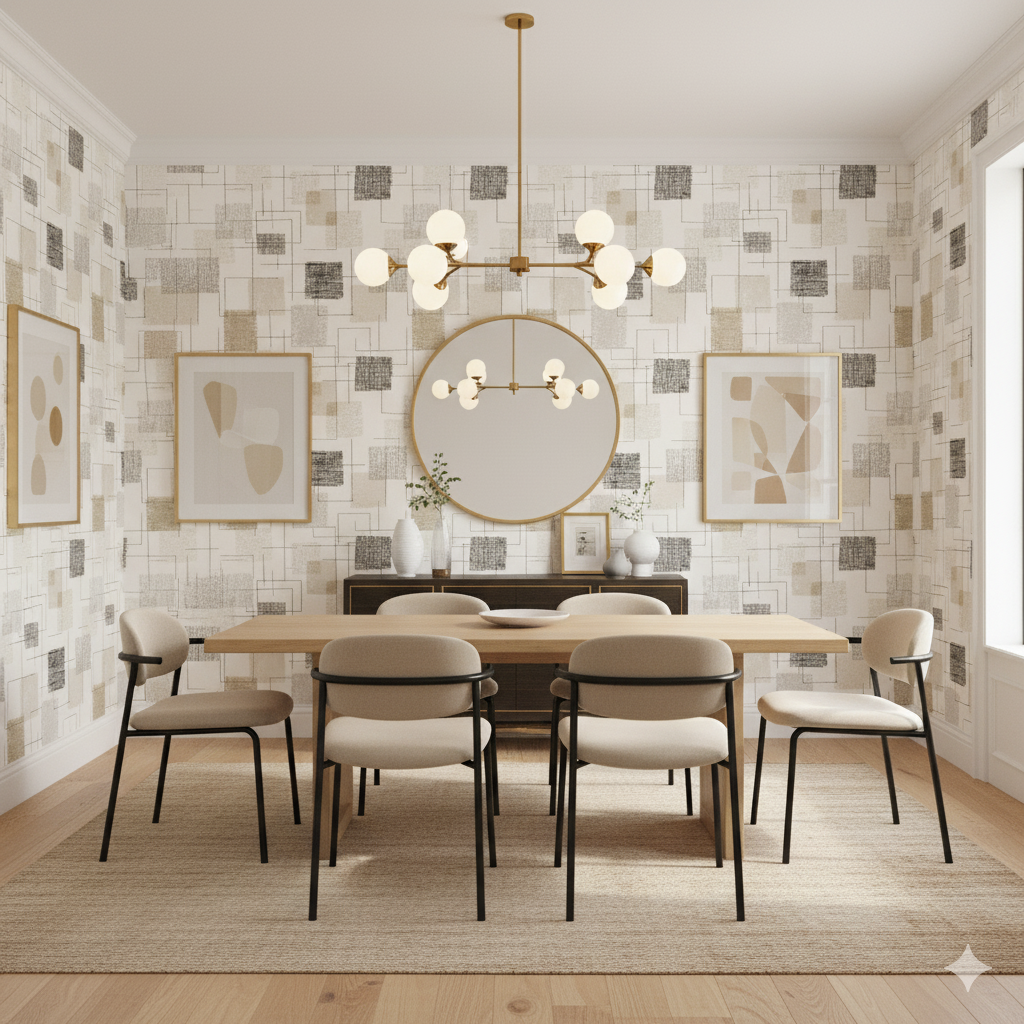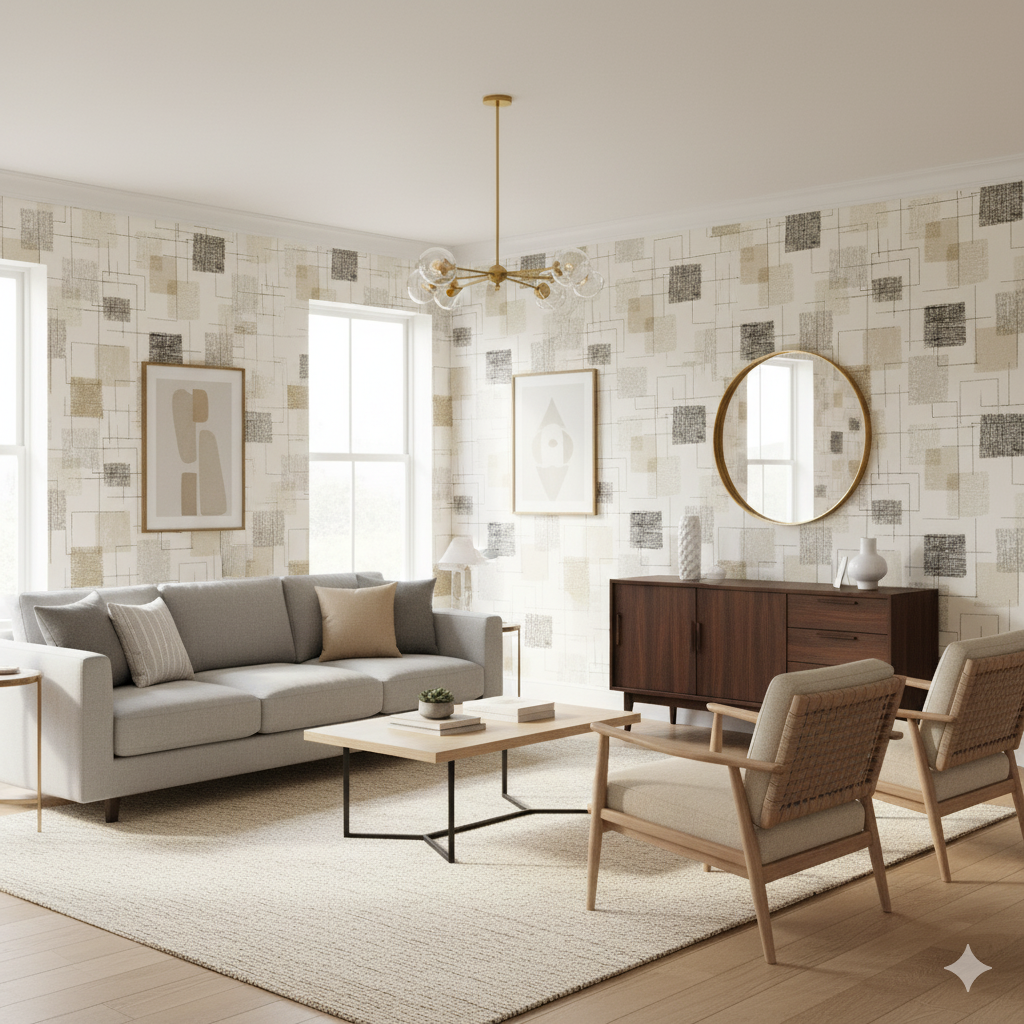 Abstract squares of cross-hatched black, taupe, and ivory float within a minimalist linear framework, creating a rhythm that feels both ordered and freehand. It references midcentury textile designs and Bauhaus drafting aesthetics, giving it a distinctly architectural personality. The neutral palette makes it adaptable, while the gridlike rhythm adds subtle structure to a space. Perfect for office walls, creative studios, or contemporary living rooms, this wallpaper pairs beautifully with black-framed furniture, matte ceramics, or soft tonal upholstery. It’s understated yet clever, designed for those who appreciate modernist elegance.