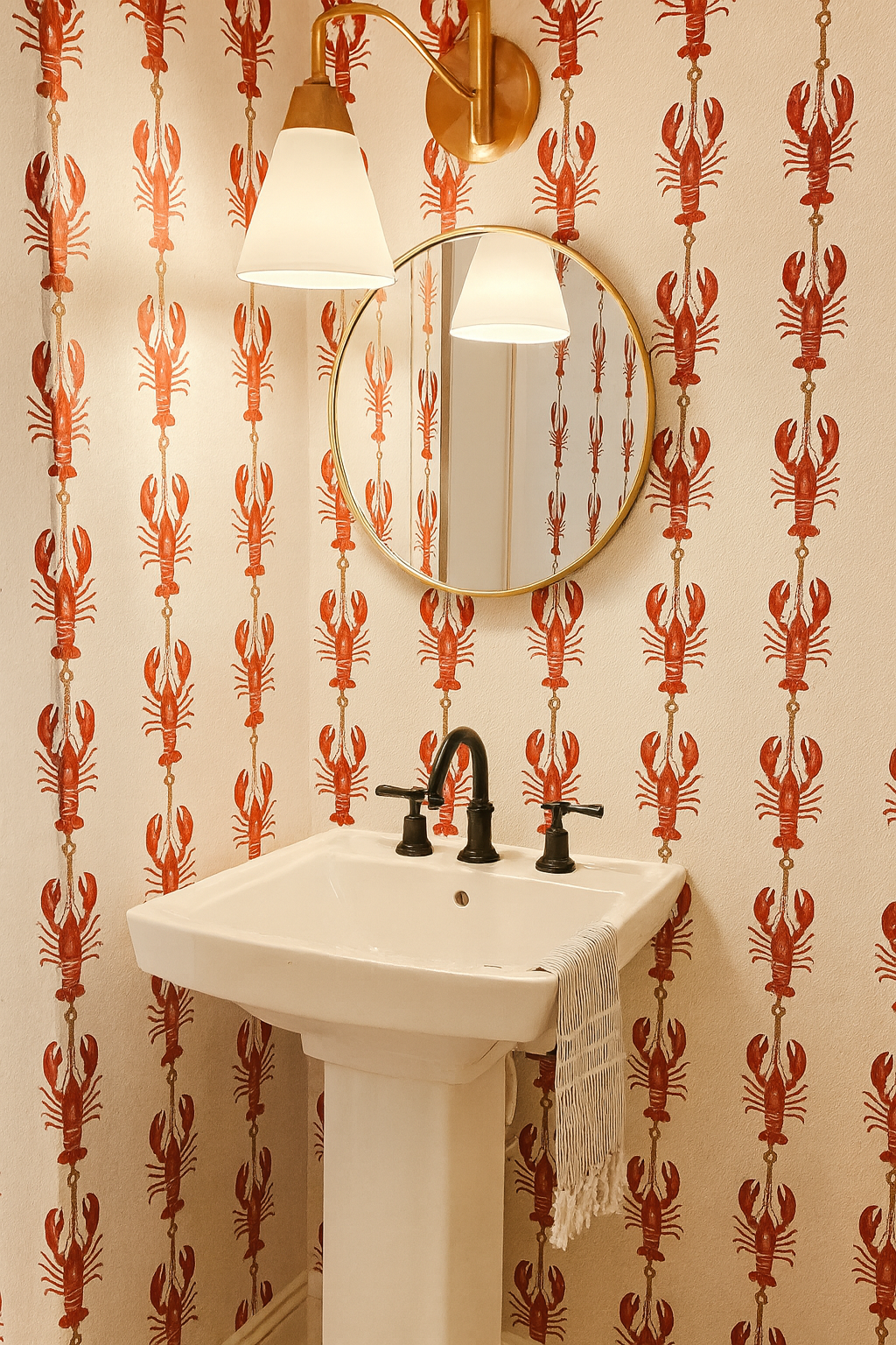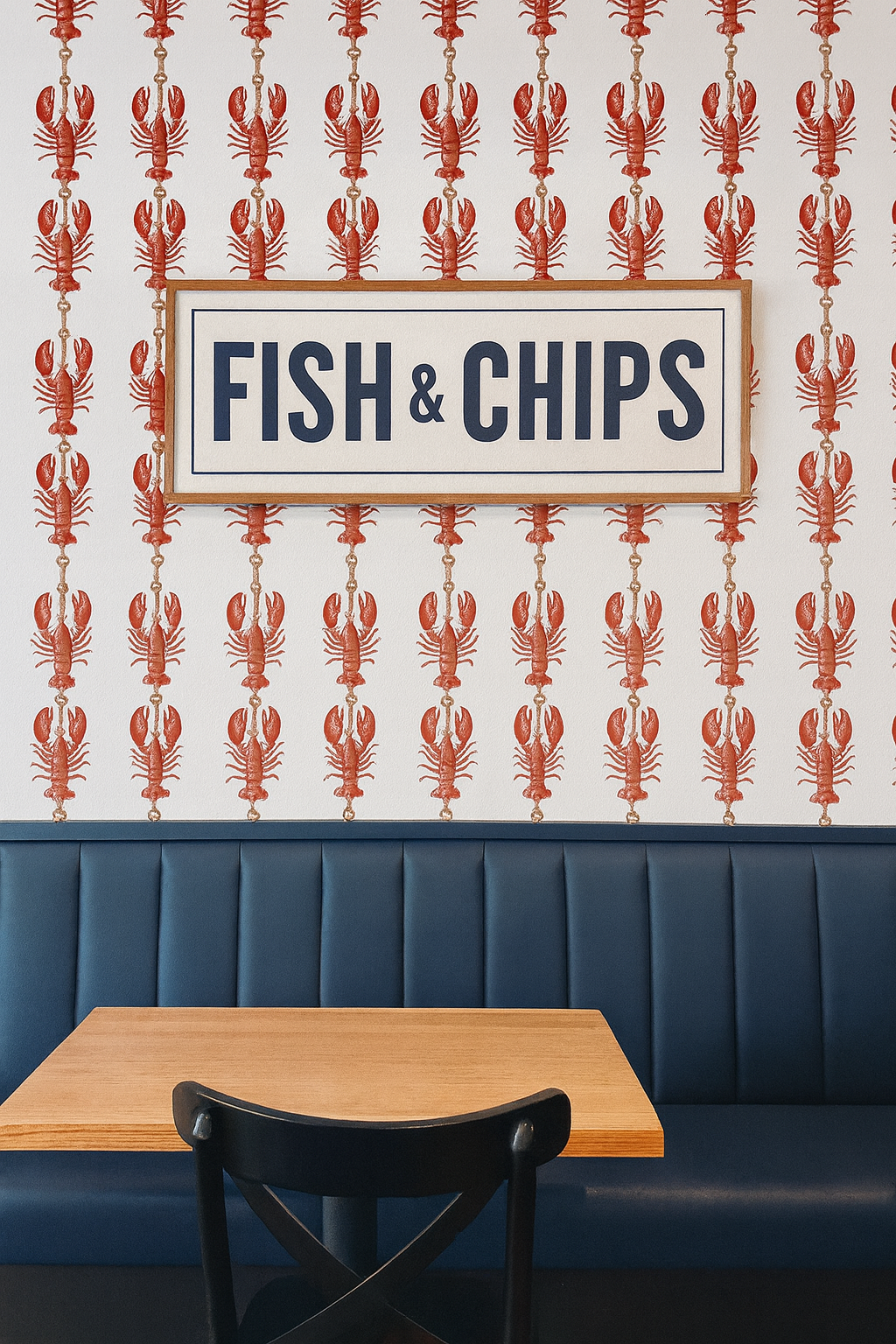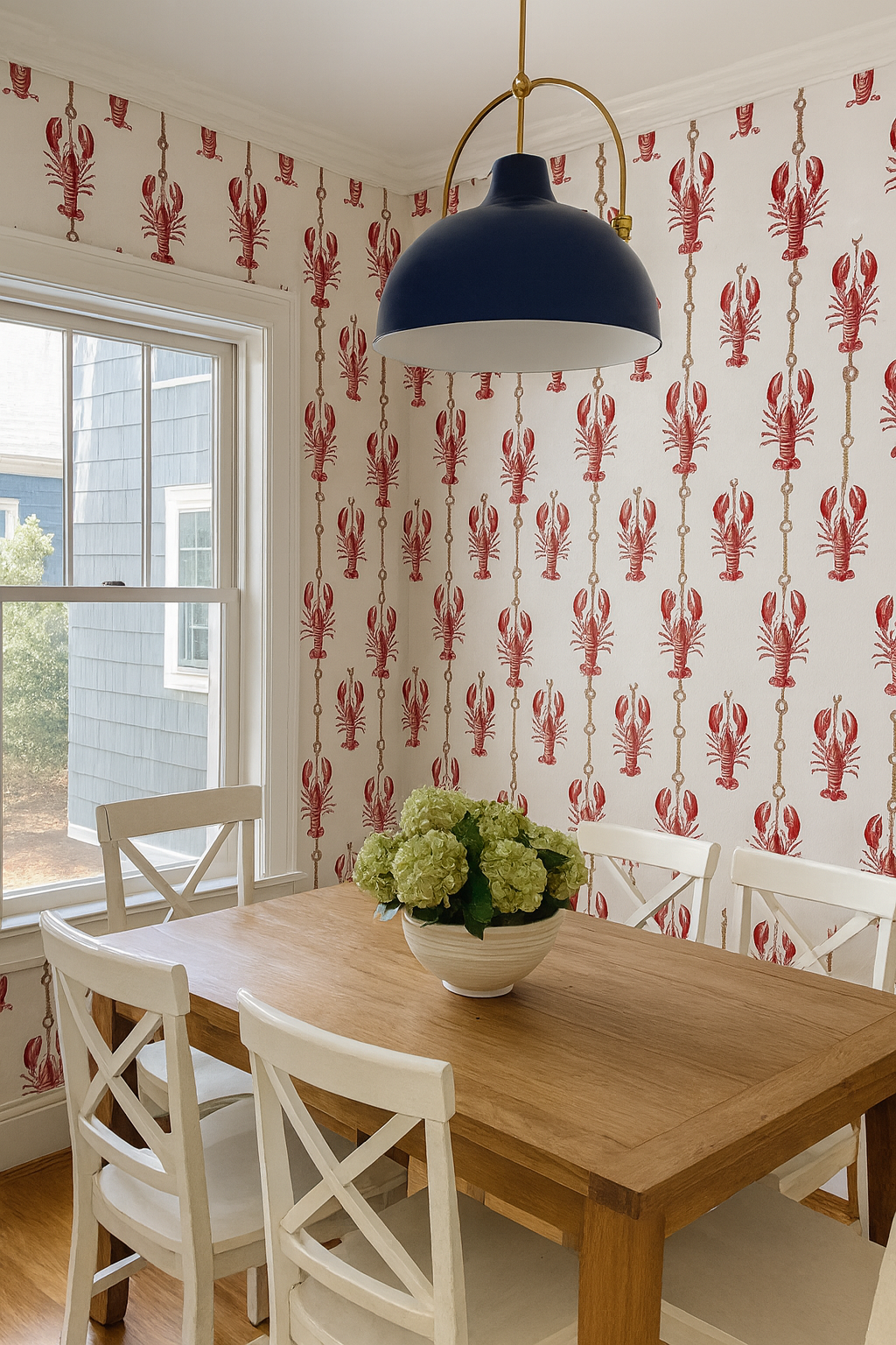 A quirky vertical stripe pattern reimagined with bold red lobsters climbing a nautical rope, knotted neatly with maritime loops. Set against a salt-kissed white textured background, the motif balances prep and punch, making it a perfect fit for New England kitchens, seaside rentals, or quirky bar nooks. It's summer in wallpaper form, with a dash of coastal kitsch and plenty of shellfish swagger.
